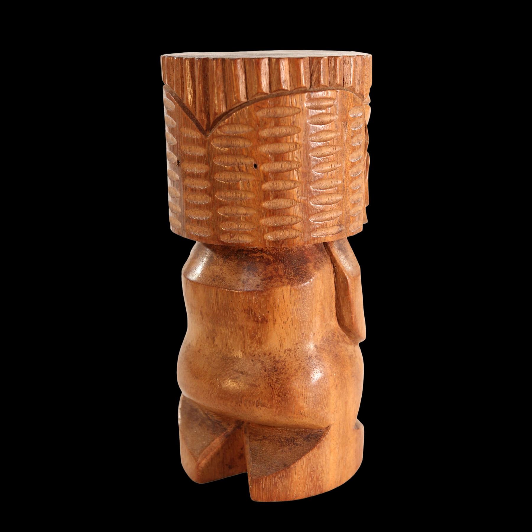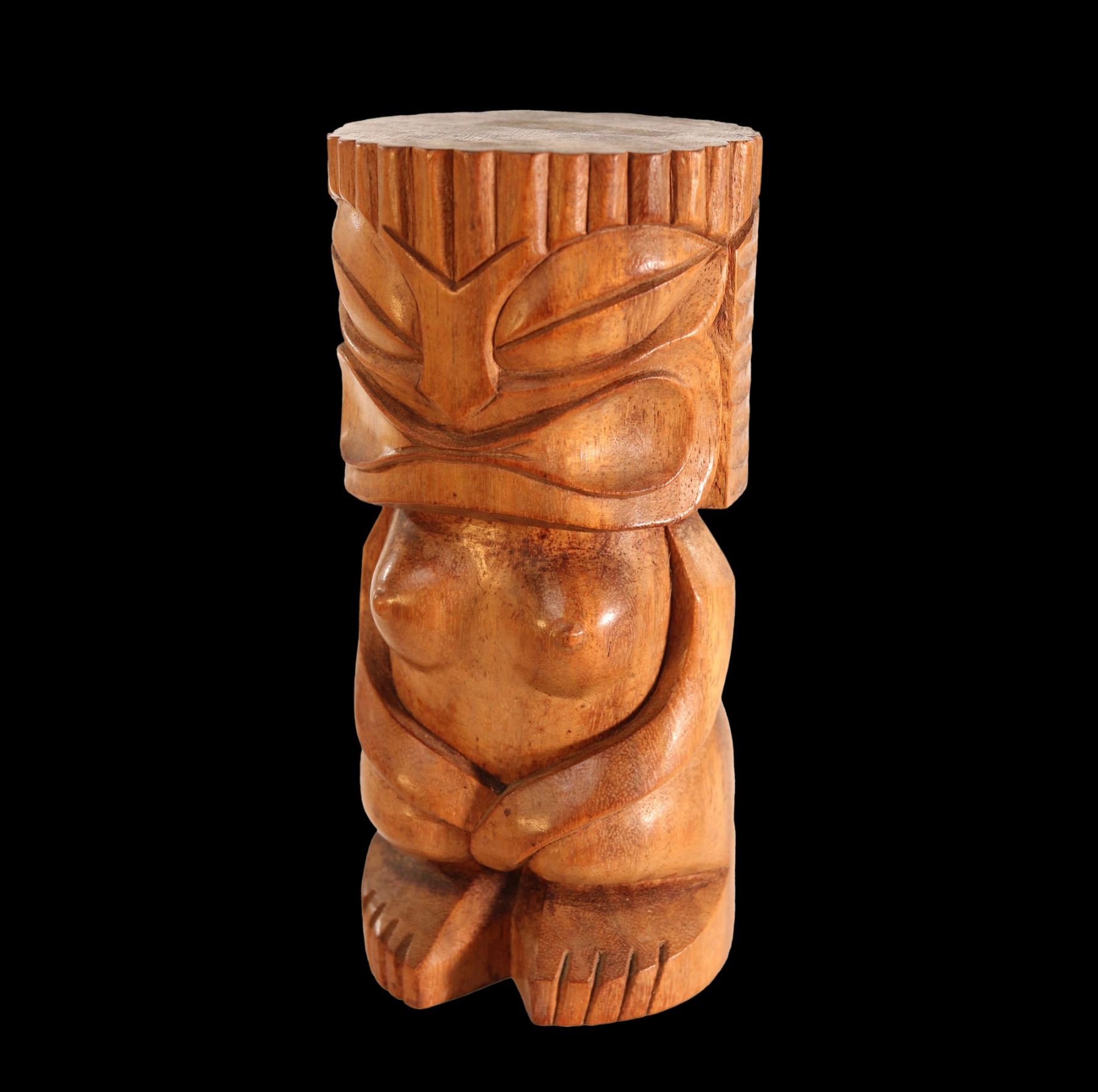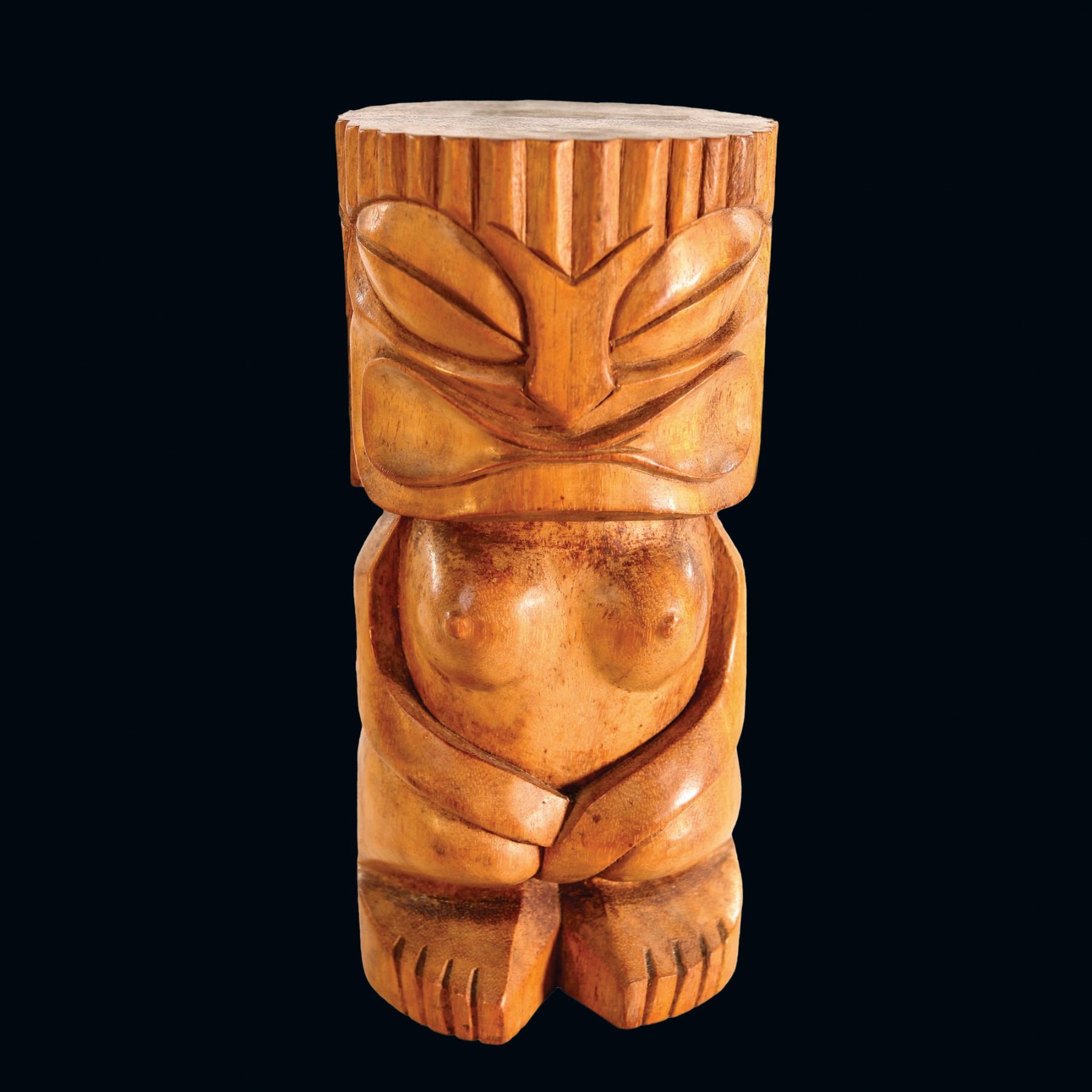(1960s) An early version of #201 by Oceanic Arts, this polished wood Tiki idol is a stylized representation of the Goddess, Pele. Hand carved female Tiki figure features obvious breasts and detailed traditional Hawaiian Tiki idol face. Handsome carving. Solid wood. VG+ with typical wear. 10"x4.75".