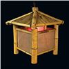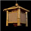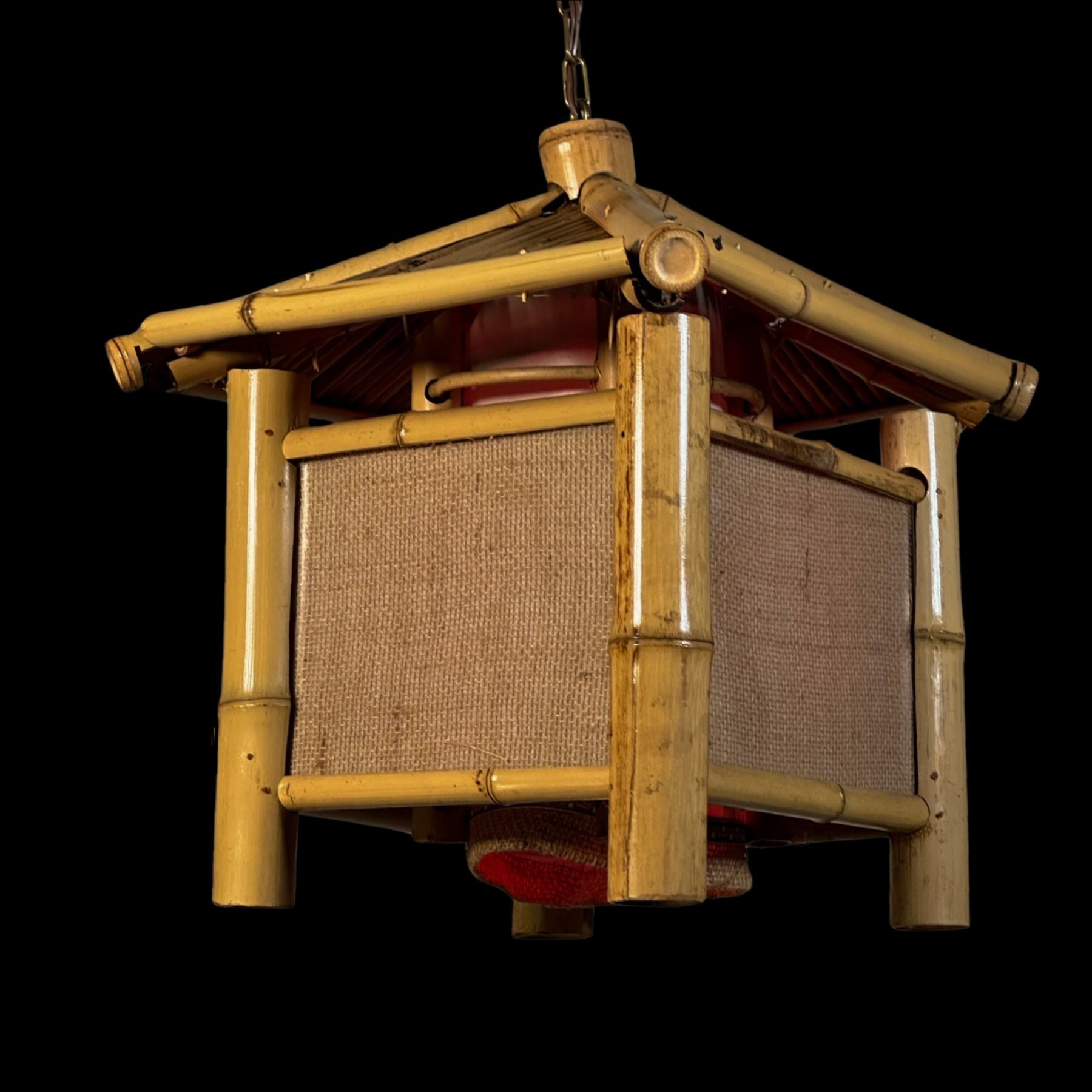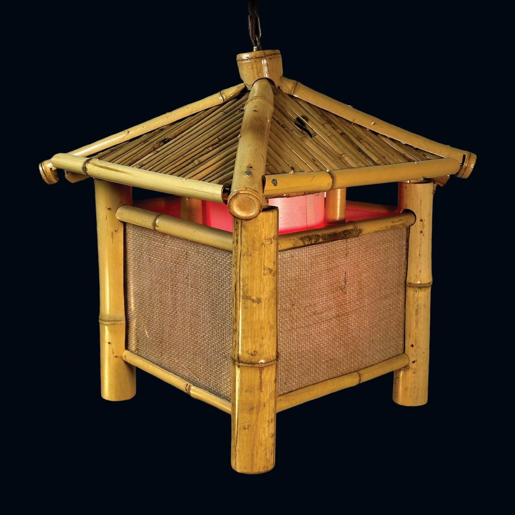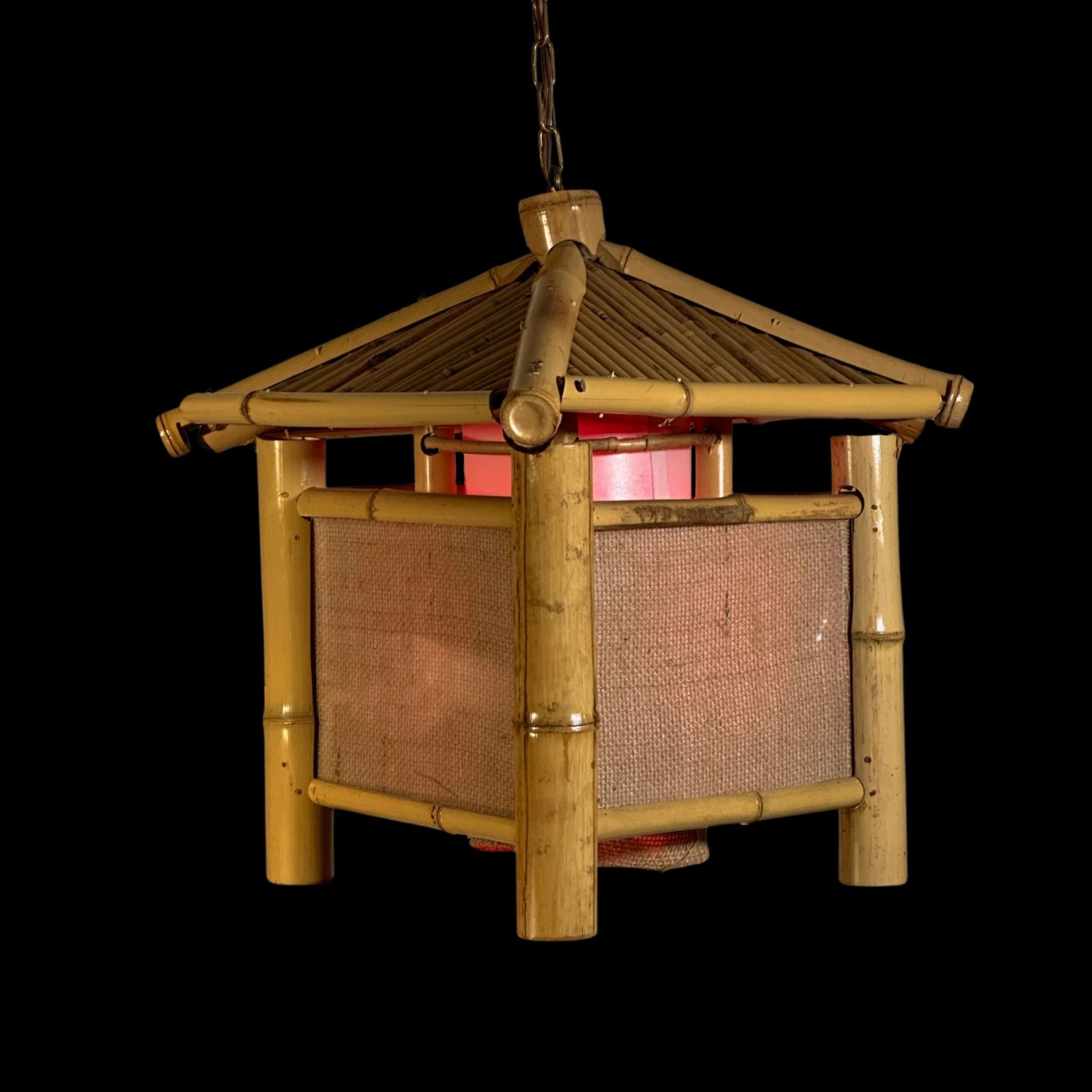 (1970s) An evocative Tahitian native hut lamp from Oceanic Arts with backlit panels and a bamboo slat roof. VG+ with some wear and warping to the bamboo frame. 18"x20"x18".