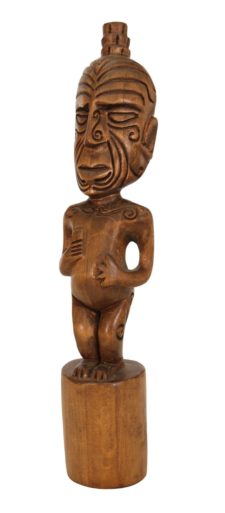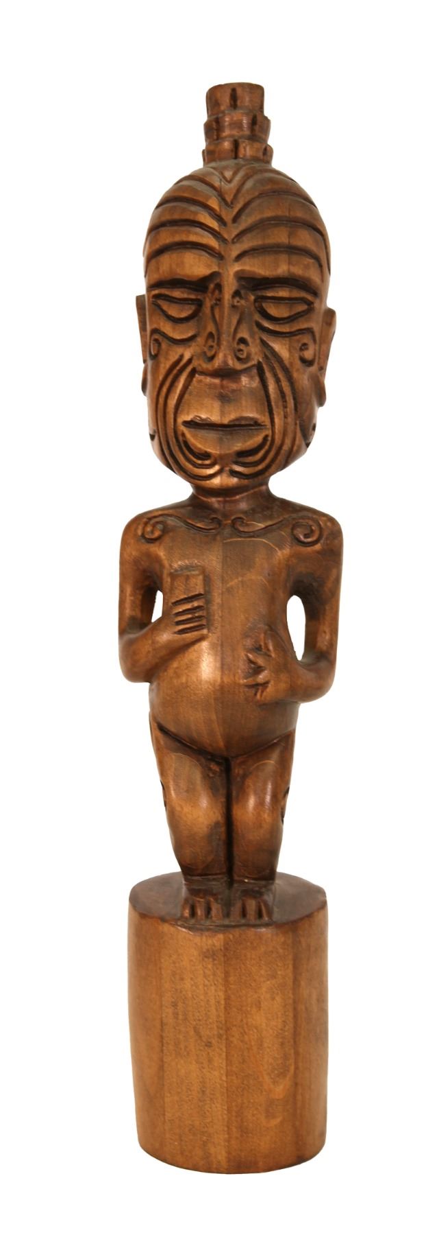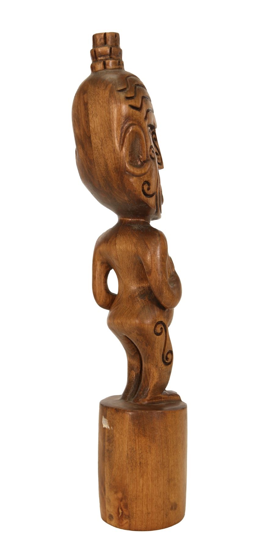 (1990s) Hardwood Tiki statue comes out of the classic Oceanic Arts supplier catalog. With a full belly and mini crown, this figure stands proud and tall on a high base. Solid wood. 18.75"x4". VG+.