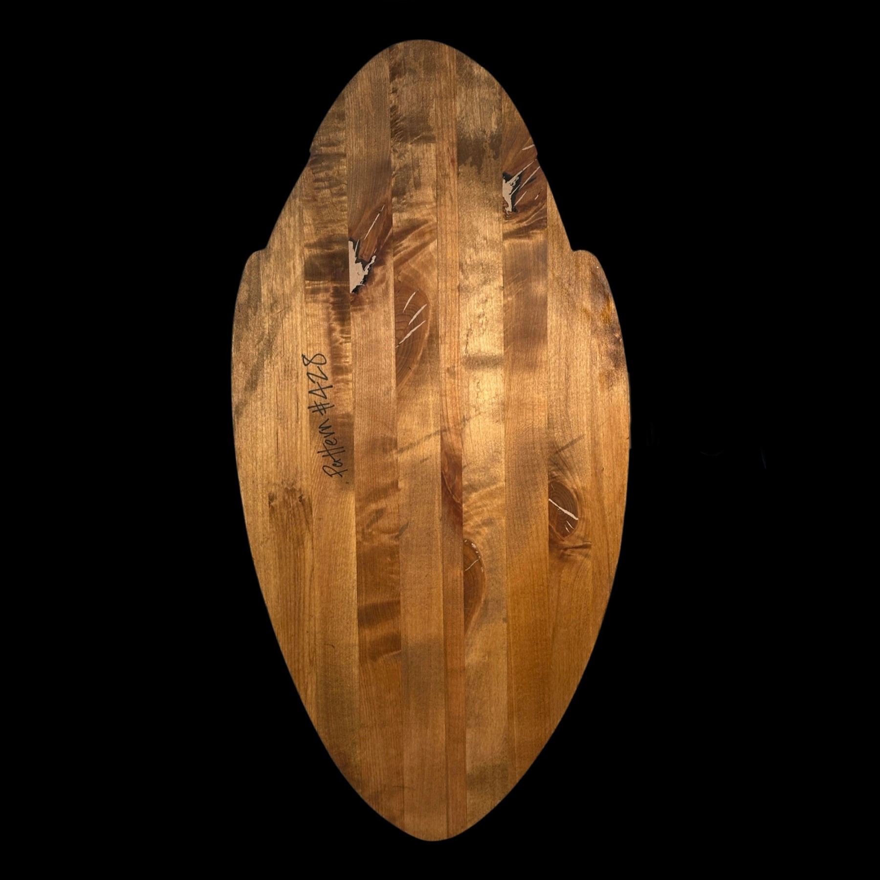 (2000s) This is one of the most famous OA designs and one of Bob and LeRoy's favorites. This style was used throughout the commercial Polynesian Pop industry with repeated use at Disney theme parks and resorts. In fact, Disney has used this creation in a good deal of themed merchandising. On offer is a later version master pattern of this mask which would occur after repeated use of the original pattern rendered it insufficient for replication use. This hardwood pattern is marked and has areas of putty fill on the verso. 17.5"x35.25"x2.5".
