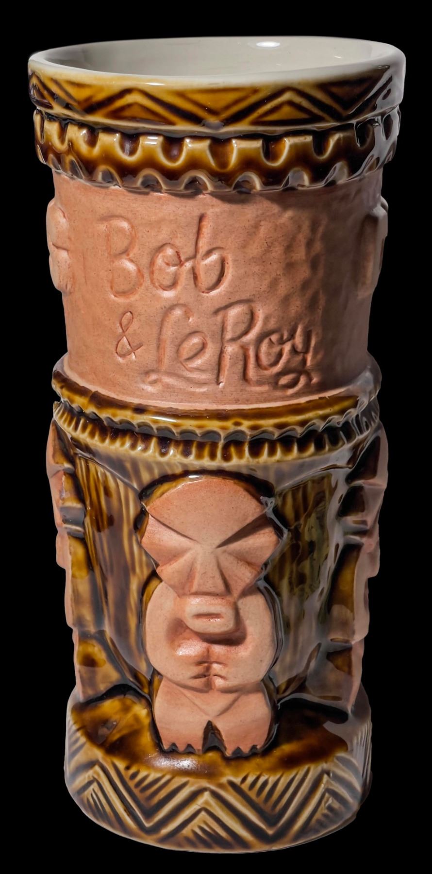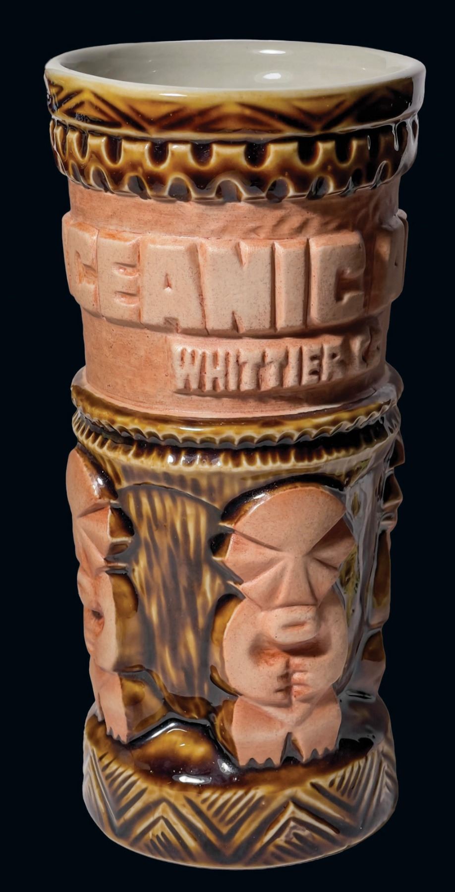 (2005) By Tiki Diablo. Early test glaze for the production of Oceanic Arts' 60th Anniversary mug. From the Oceanic Arts archives. VG+ with typical wear. 3.5"dia x 7.75".