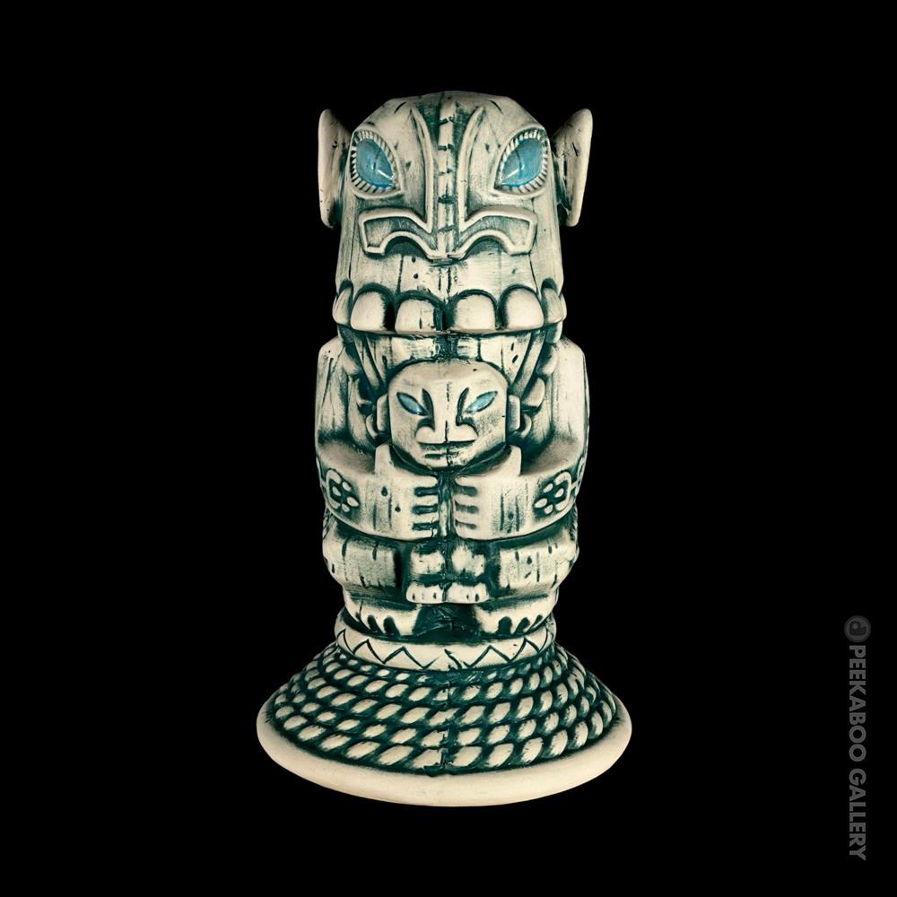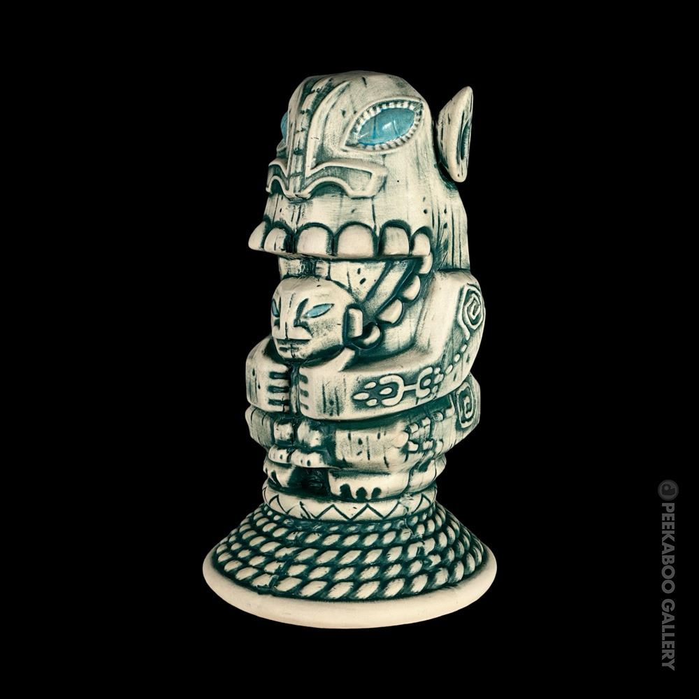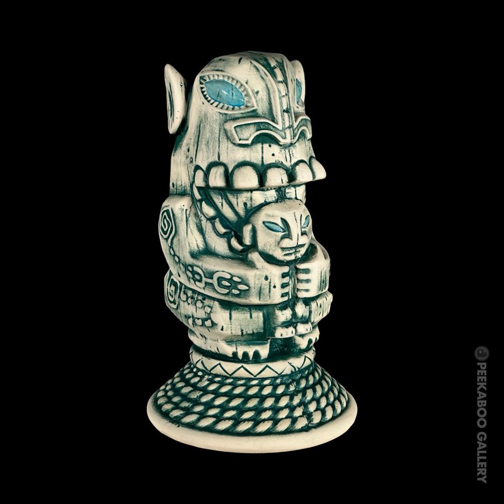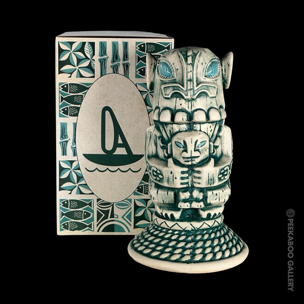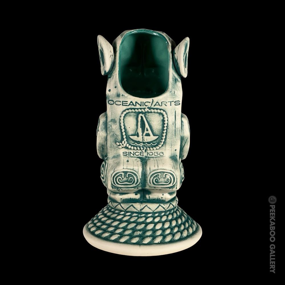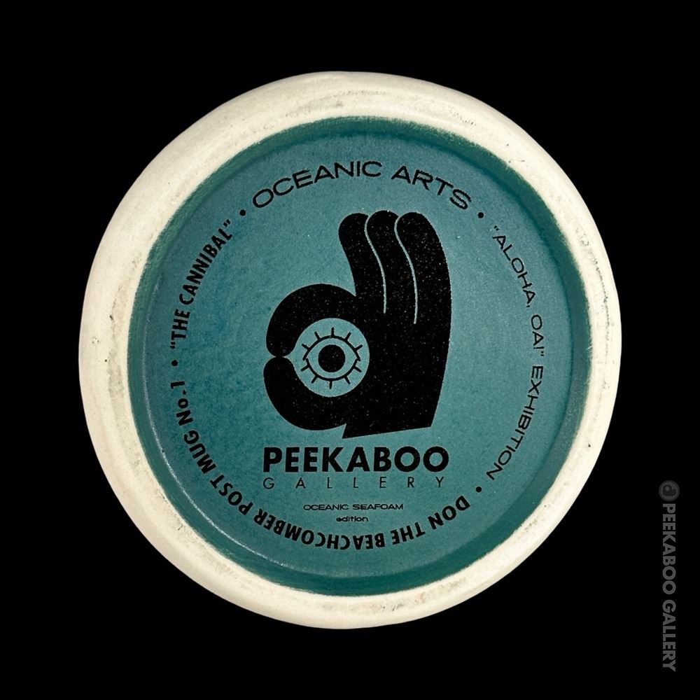 (2022) Created for the epic celebration and exhibition of Oceanic Arts upon its closure and retirement of Bob and LeRoy by Peekaboo Gallery. Designed by OA author, Jordan Reichek , the mug is based on a cannibal carving OA made for Don the Beachcomber that stood in the shop for decades. The unique mug base is a nod to OA's famous Tiki table lamp shades which are often wrapped with ship's rope. This is the blue version of the mug in its custom box. VG+. 5.25"x9"x5.25".