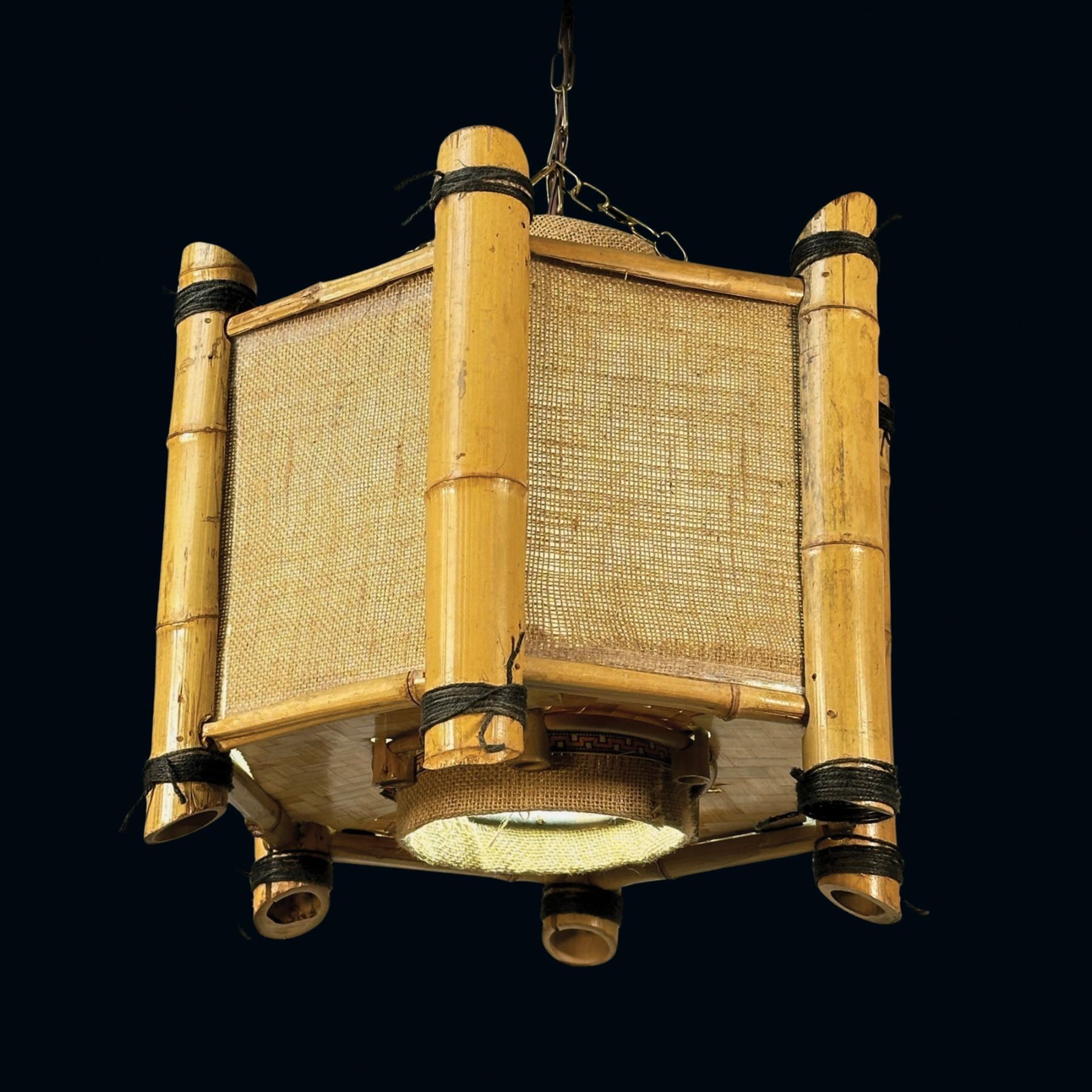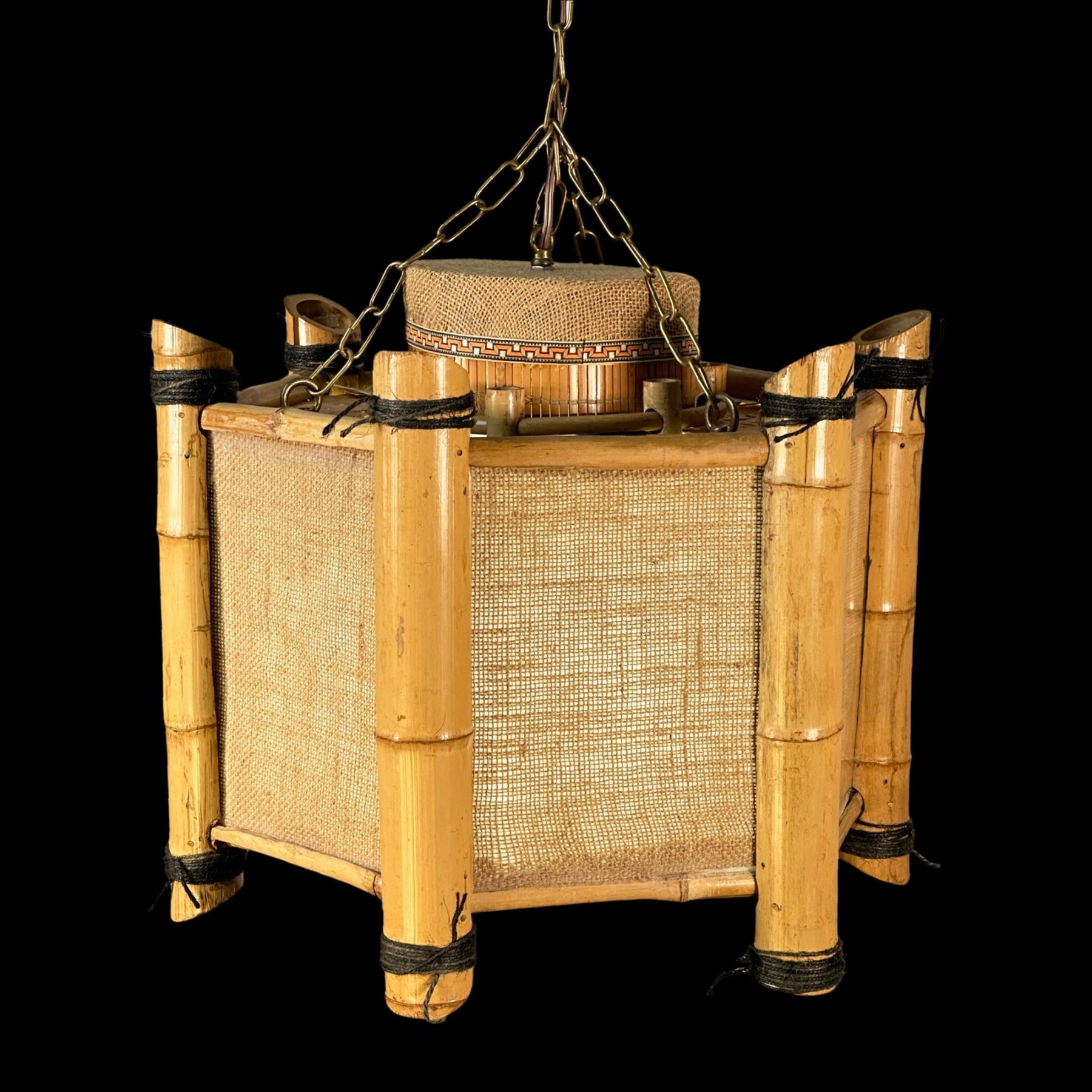 (2000s) The final run of lamps from OA's supplier in Taiwan was this BORA BORA BAMBOO SHADE lamp. Certainly the end of an era. VG+ with some loose parts but intact. 19"dia x 16".