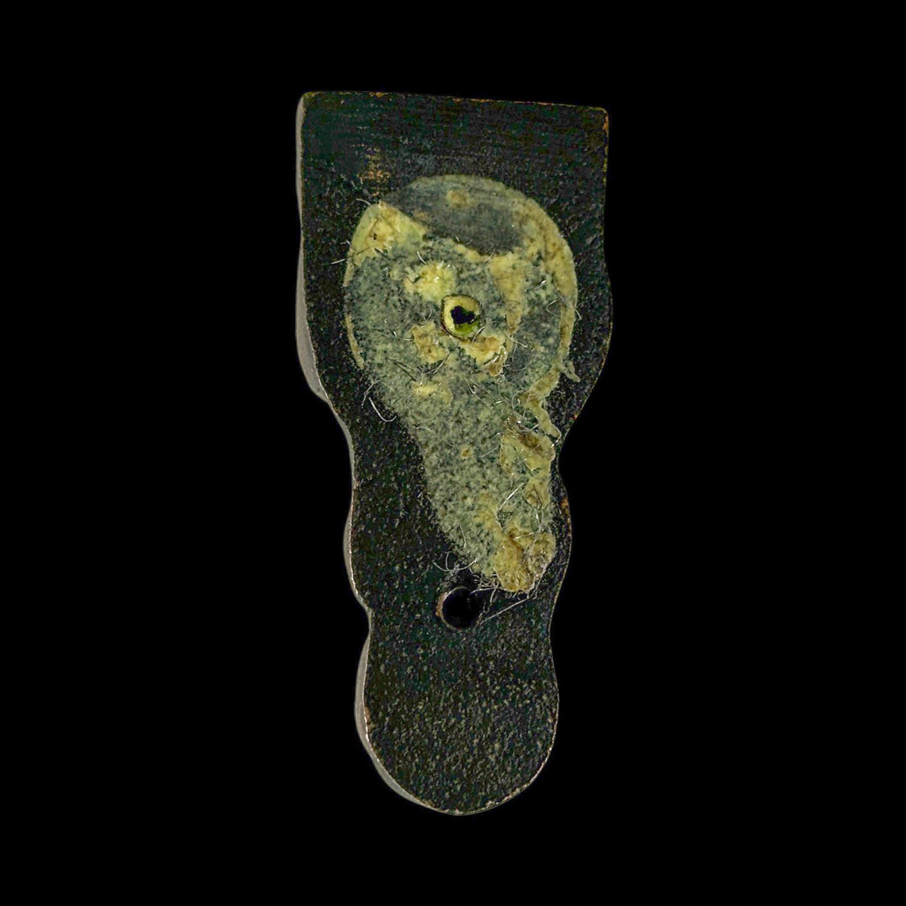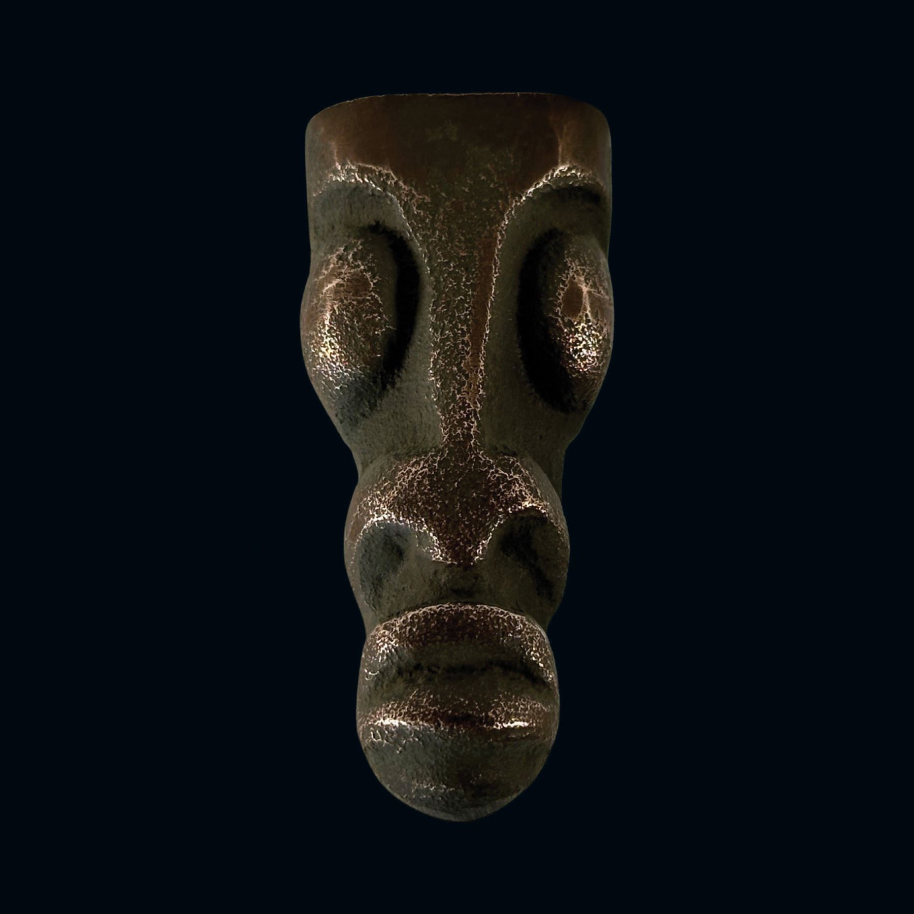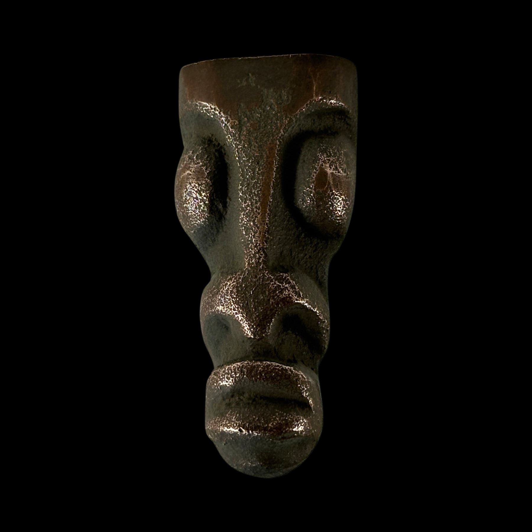 (1960s)* For a period in the early 1960s, Oceanic Arts repurposed their early Tiki Surf Charm carvings into novelty accent pieces for high end clientele such as these bronze pulls. These would be used on cabinetry such as drawers and shelving doors. Very heavy, high quality bronze. VG+. 1.25" x 2.75".