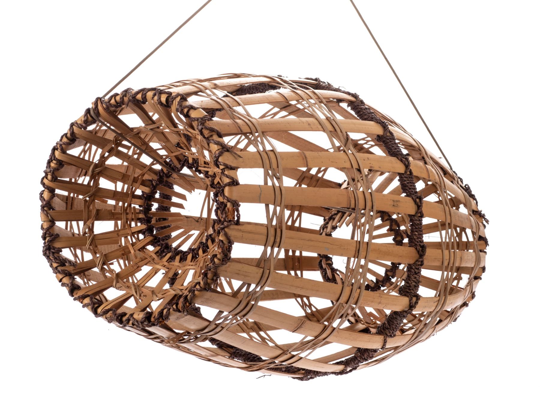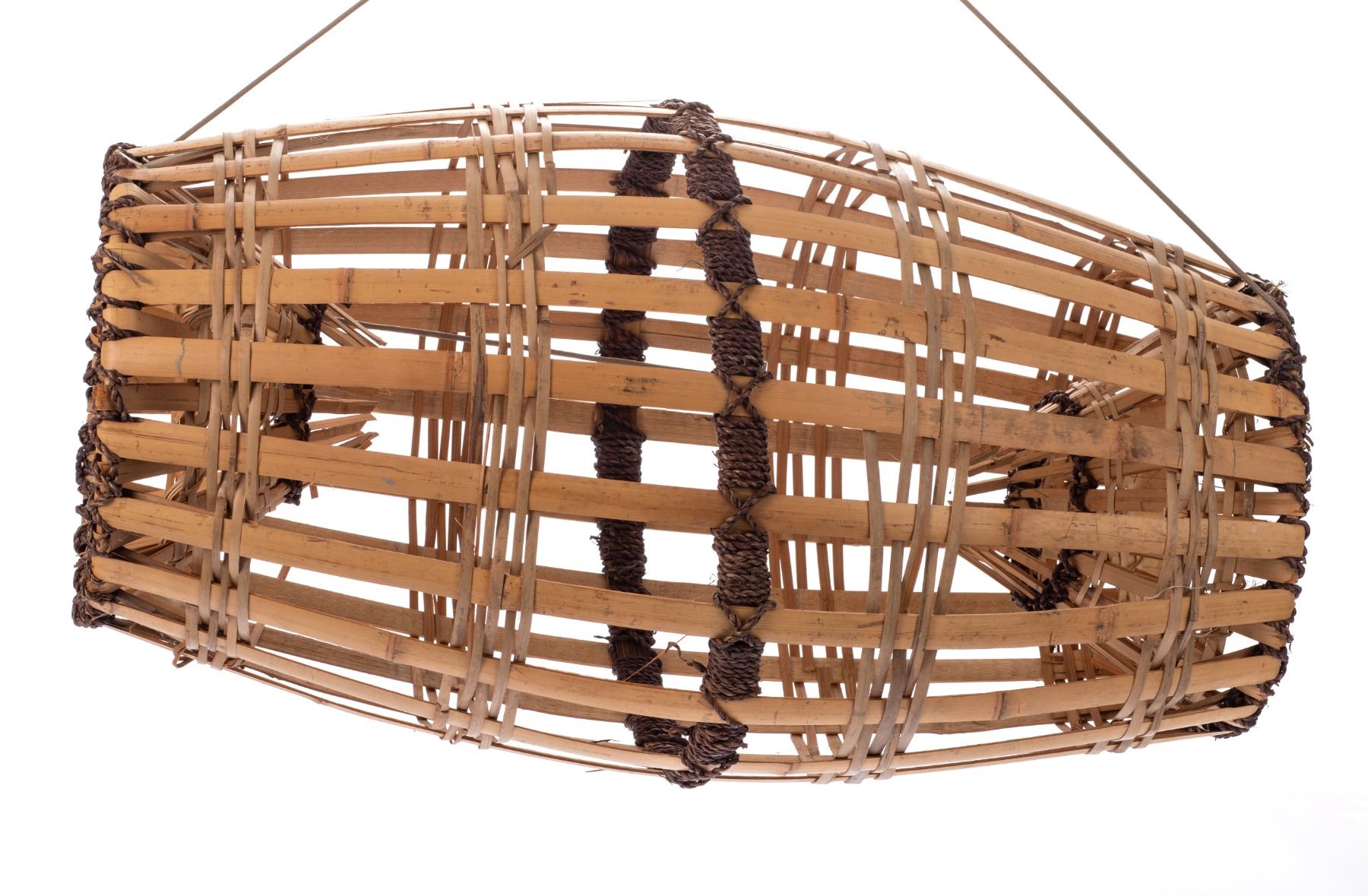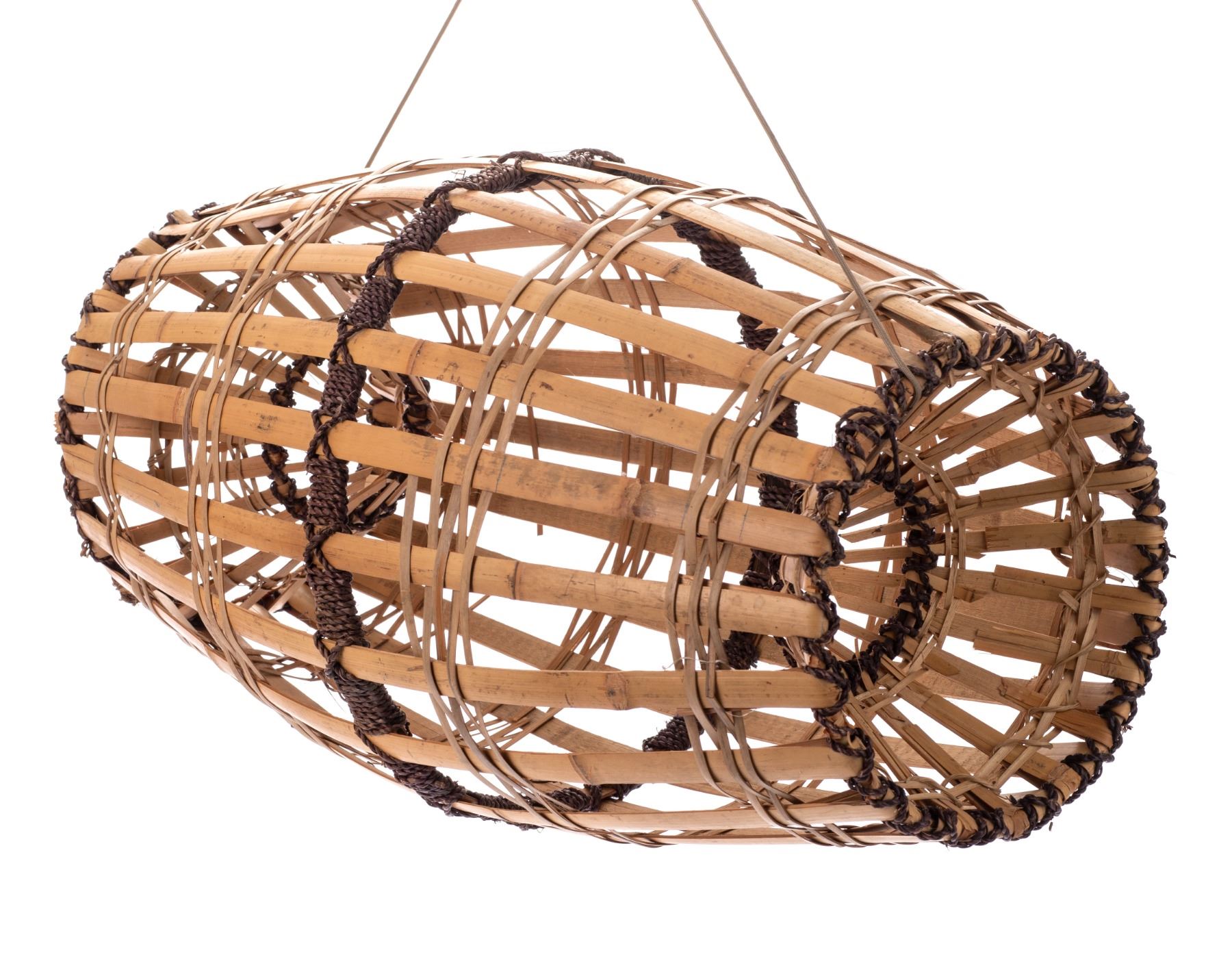 (1990s) A classic exclusive import from the Philippines. Perfect for creating contextual mood in any bar or tropical space. Curved bamboo slats with vine and twine wrappings create this large fish trap. Nice raw wood and weave. 28"x15". VG+ with typical wear.