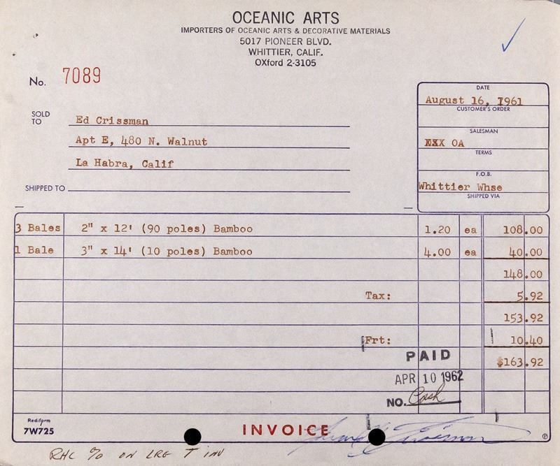 (1961) Early invoice to famed OA tiki carver, ED CRISSMAN, dated August 1961. Signed in blue ink.7"x8.5".VG+.