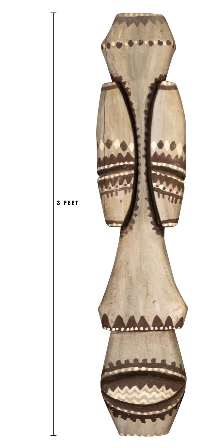 (1990s) Whimsical Moai-inspired Tiki mask from legendary Oceanic Arts in Whittier, CA. This piece was commissioned by Dug Miller for LeRoy's take on a WITCO design. One of a kind. Beautifully carved and painted in polychrome for a striking effect. Hand carved wood and painted design. Signed in carving on back "OCEANIC ARTS - WHITTIER, CA 90602 - ALII MOA PORIA ("CHICKEN FAT" LeRoy's Hawaiian name for Schmaltz!) L.E.S. - BIG HEAD TIKI". 37"x8". VG+.