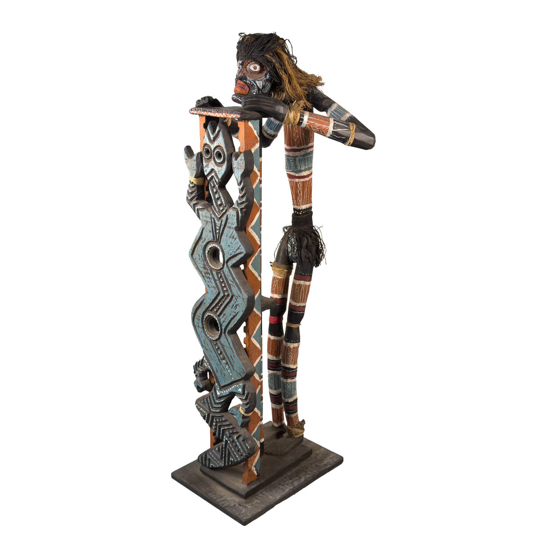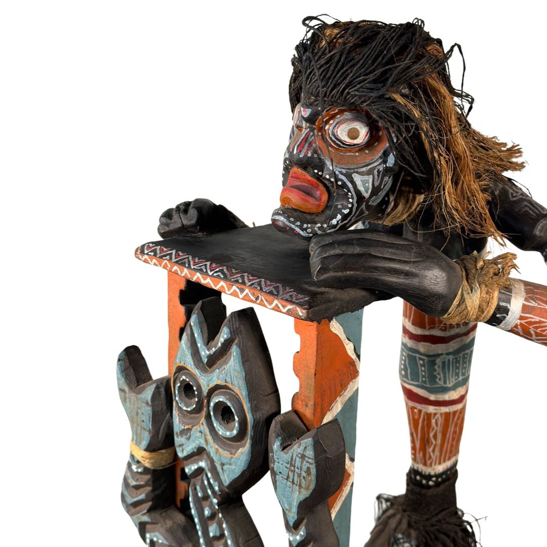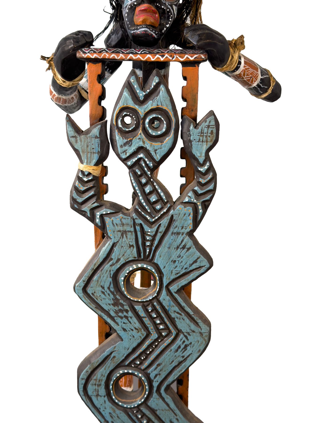 (1990s) A fantastic creation by the true Godather of TIKI: LeRoy E. Schmaltz! This creative ensemble makes use of found objects, as was the medium of choice for LeRoy. A wooden CD tower was repurposed and created the foundation for this PNG aboriginal ancestral figure, standing at a lecturn with a mounted abstract lizard character mounted on the facing. The colors are beautiful earthen polychome with raffia adornments and fiberous dreadlocks for the figure. The execution is classic LeRoy and if one was to own just one defining Schmaltz piece, this is certainly a candidate for a such a keystone example. Features hammered copper pupils for that extra spark of life! *MAX'S SOUTH SEAS HIDEAWAY in Grand Rapids, Michigan maintains the largest collection of vintage Polynesian Pop and Tiki decor of any commercial venue in the world. Max's is filled to the point they simply cannot fit any more decor in the building! This vintage artifact extra decor stock which has come available directly from their inventory in a rare oppurtunity for the public to own such high quality, historic pieces. The piece is accompanied with a signed letter of authenticity by Max's owner, Mark Sellers and Peekaboo Gallery owner, Jordan Reichek. 47"x17"x15.5". VG+ with typical wear.