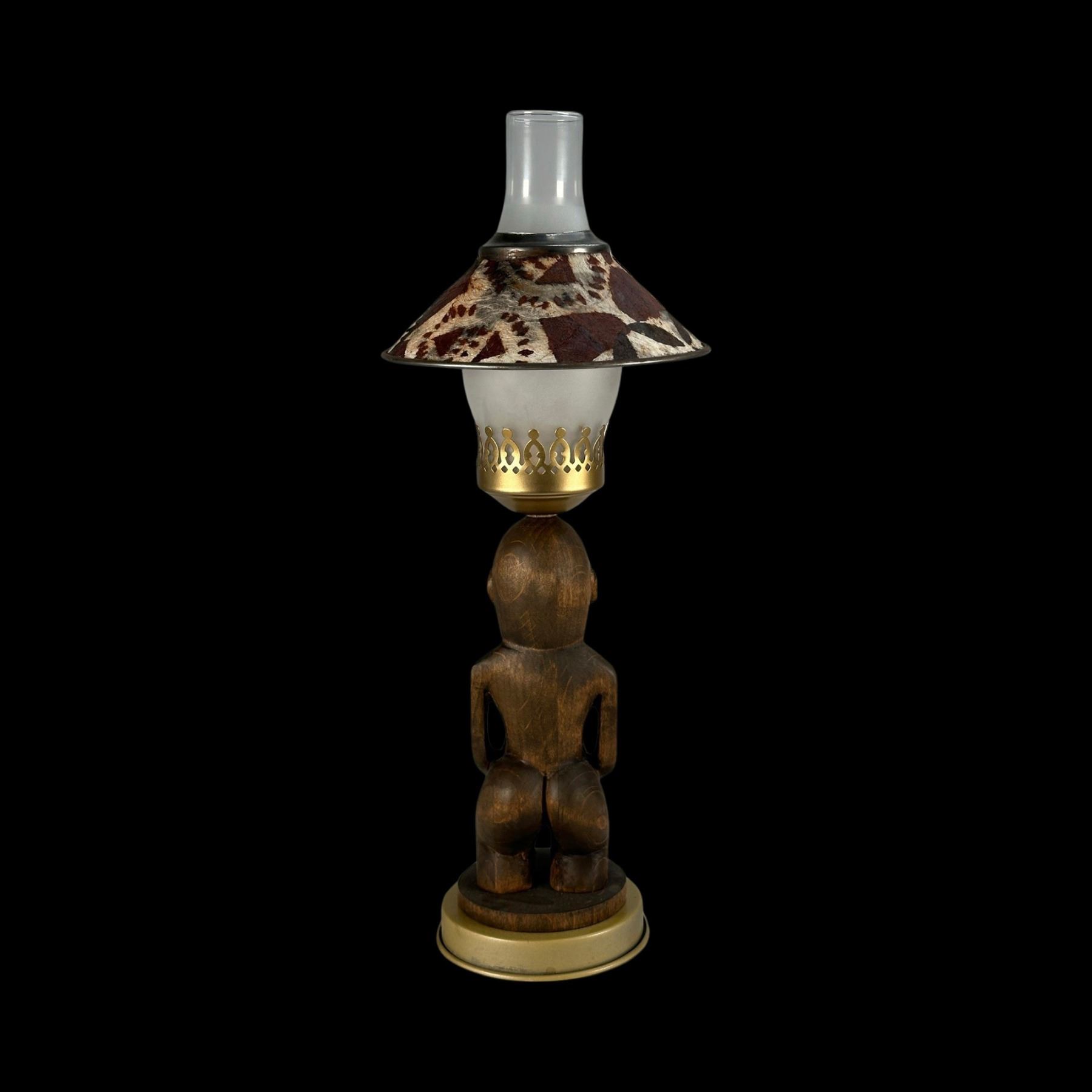 (1960s) Although not shown in the original OA catalog (many lamps were actually not pictured in the abbreviated catalog), this design was produced for a short time in the 1960s using #220 Marquesan Tiki figure. See photo. VG+ with typical wear. 7"dia x 17.75".
