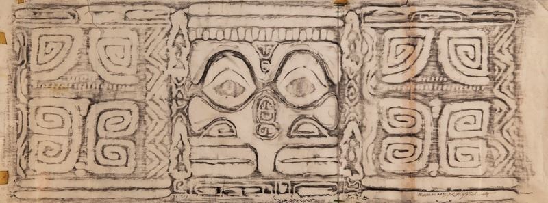 (1960s) A graphite rubbing on vellum by LeRoy Schmaltz of a Marquesan wall panel. LeRoy created this in that the panel was a one-off and not duplicated. If he needed to make another, this rubbing would be the template. Perhaps not the original intention however, this made an incredible work of art. Signed by LeRoy in ink. MAde from two sheets taped on the back, not affecting the front adversely.12"x32".VG+ with wear , edge tears and yellowed tape in areas. See photo.