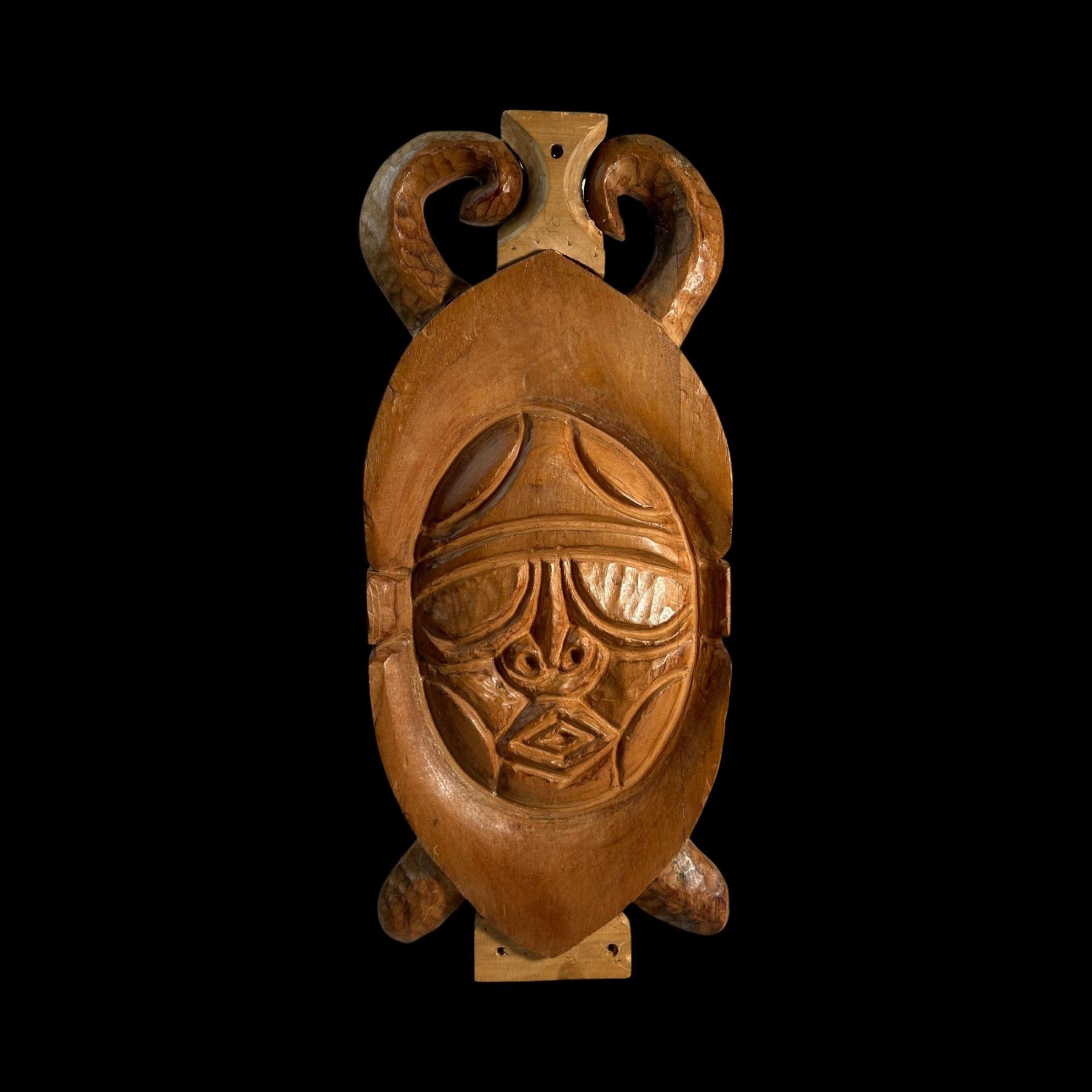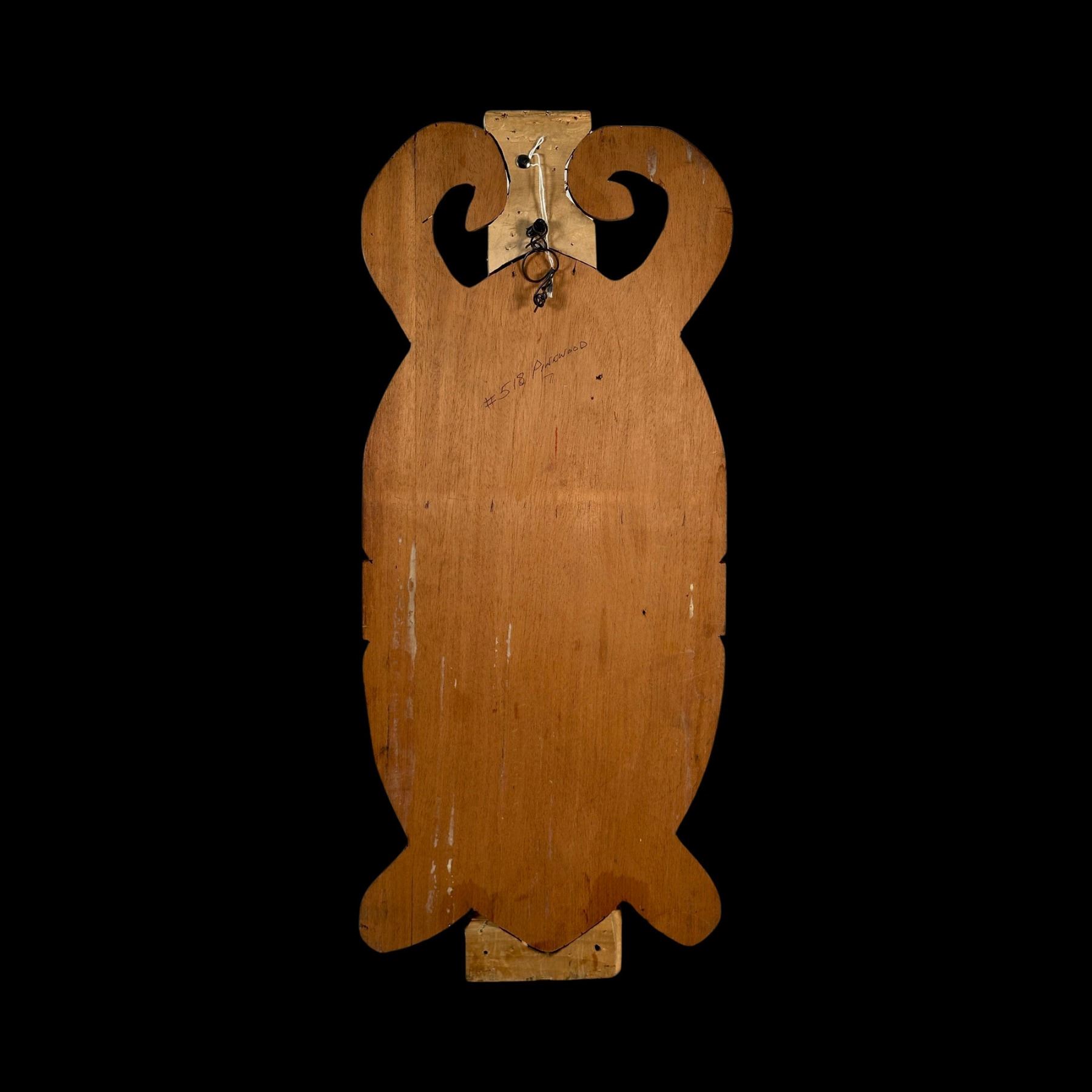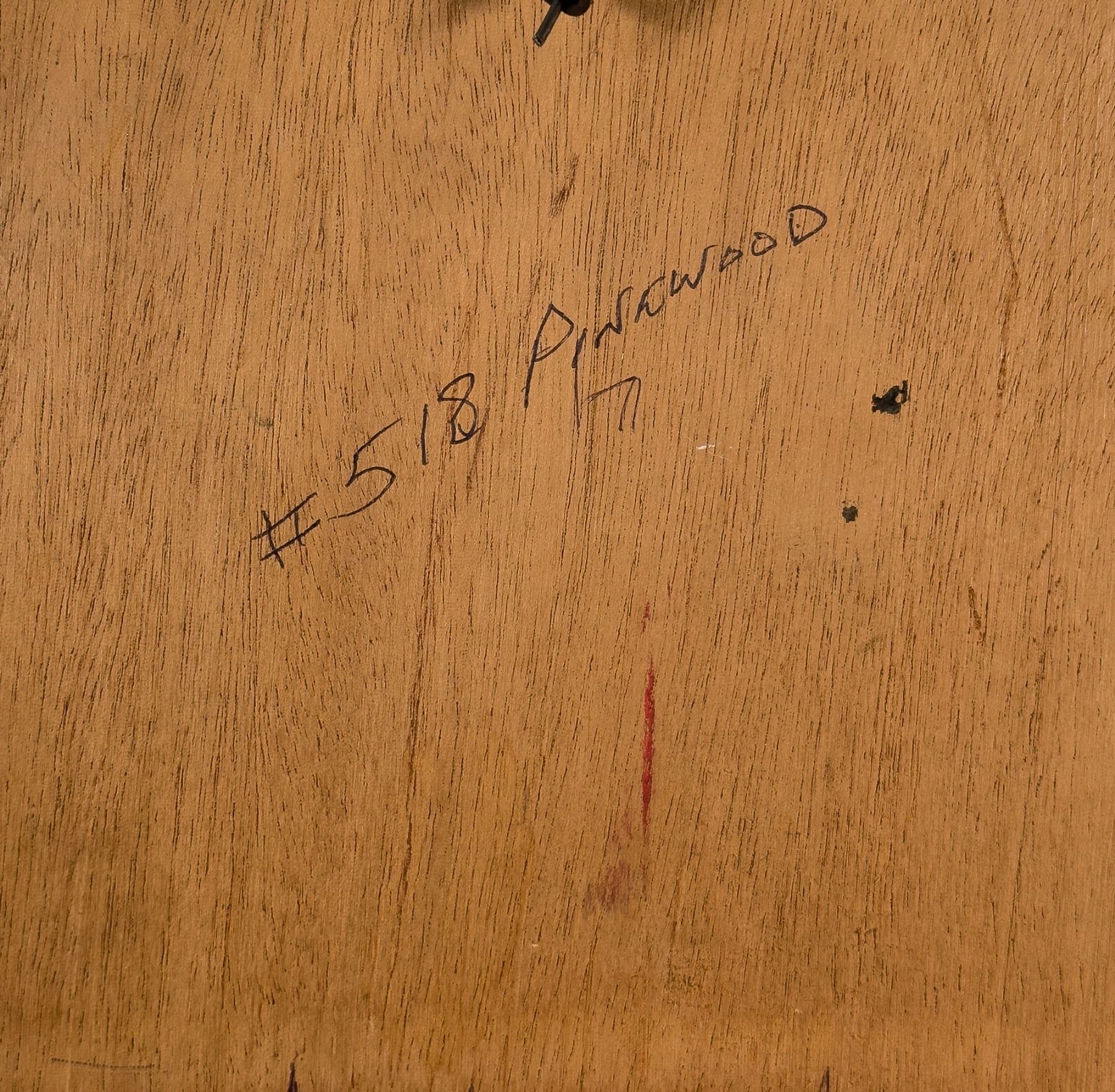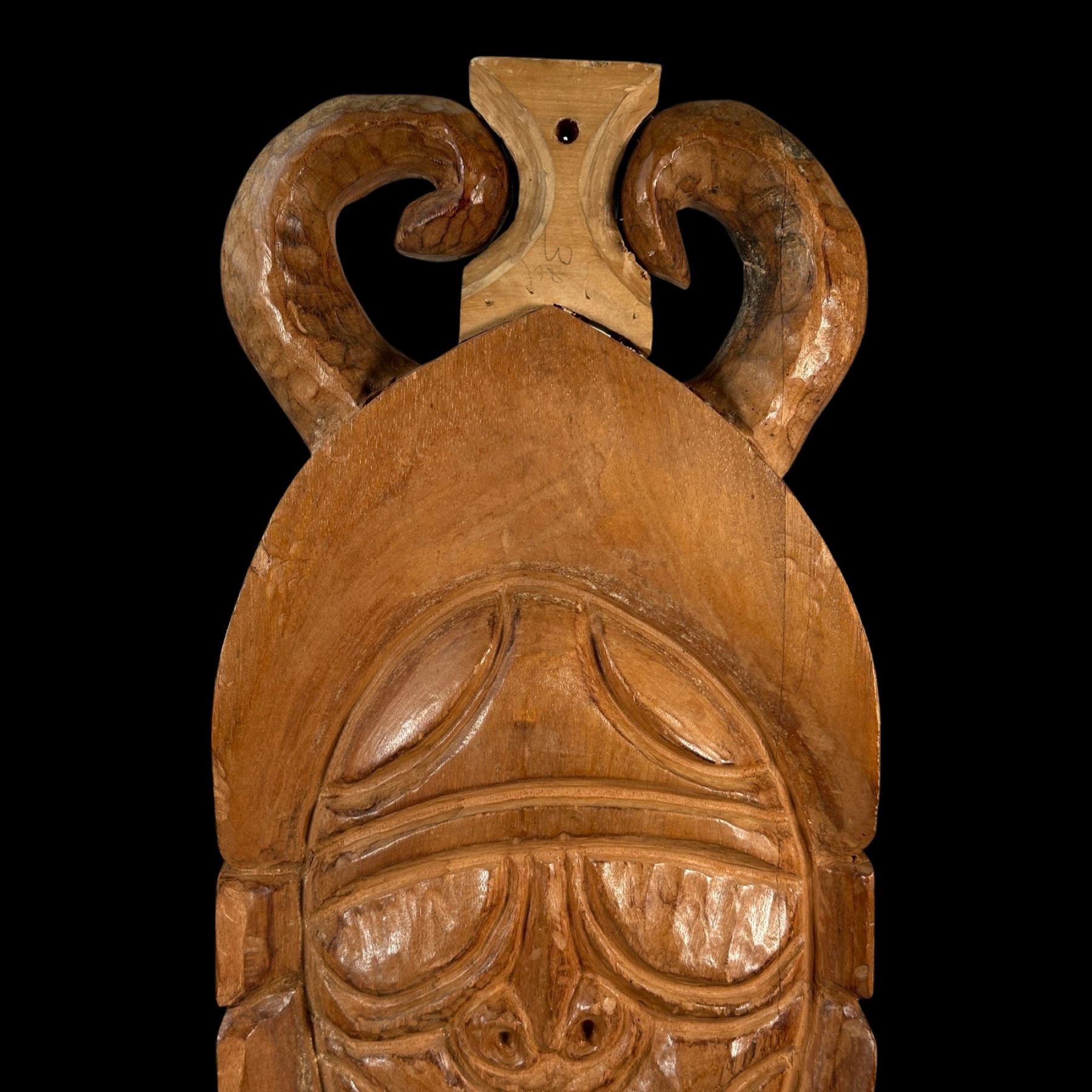 (1960s) Here is the master pattern carving for OA the famous #518 New Guinea Mask with horns. This master pattern retains its spindle chocks and is marked in pencil on the version #518 PINEWOOD in Bob Van Oosting's hand. VG+ with typical wear. 11.5"x27"x2".