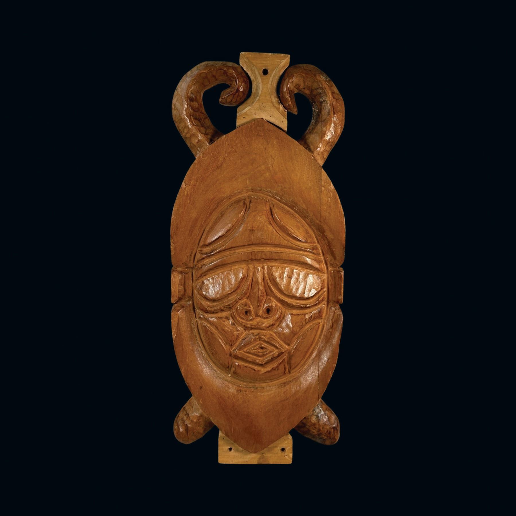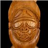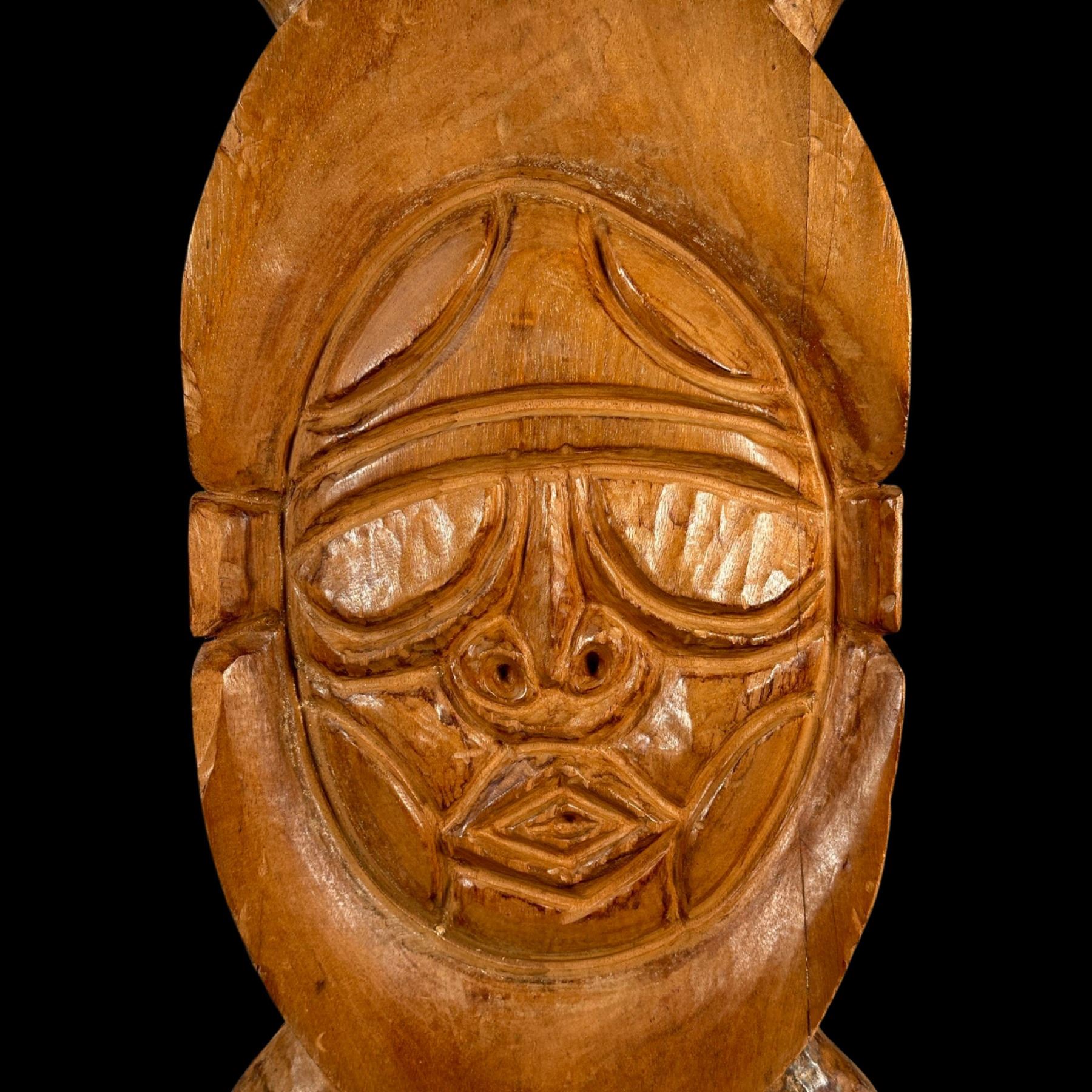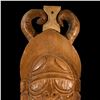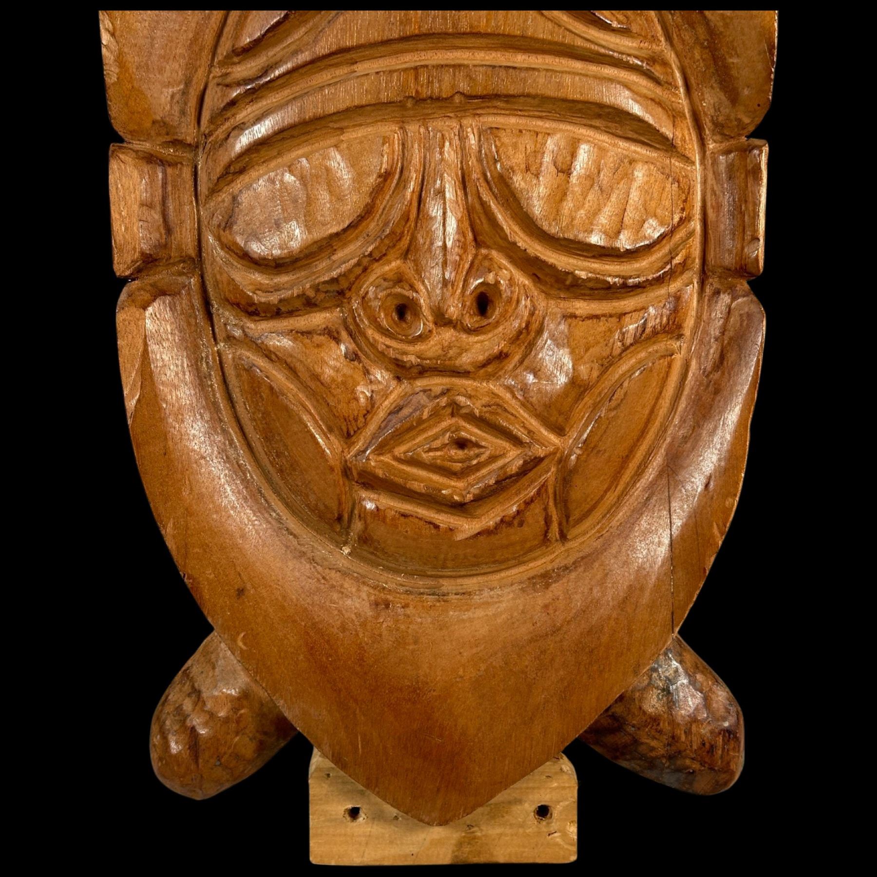 (1960s) Here is the master pattern carving for OA the famous #518 New Guinea Mask with horns. This master pattern retains its spindle chocks and is marked in pencil on the version #518 PINEWOOD in Bob Van Oosting's hand. VG+ with typical wear. 11.5"x27"x2".