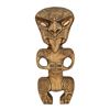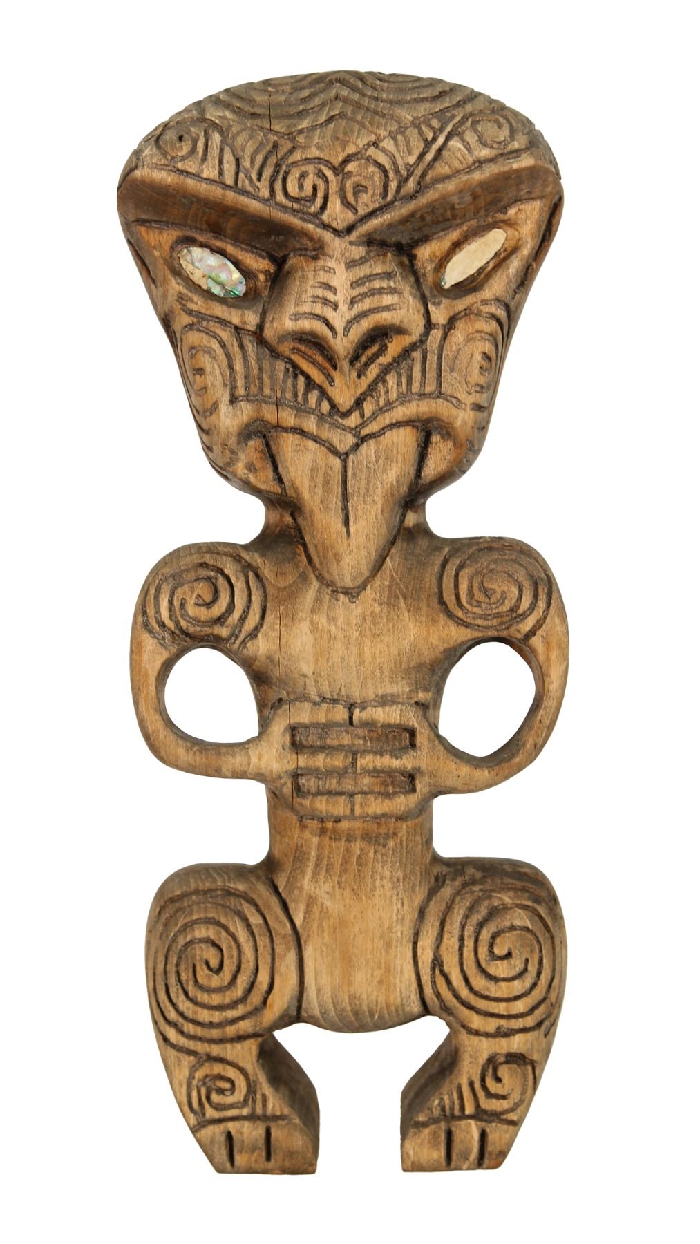 (1990s) A classic out of the Oceanic Arts catalog. Hand carved Maori Tiki idol door pull features protruding tongue and abalone shell eyes. Solid wood. 12.5"x5". VG+ with weathered wood patina from outdoor use.