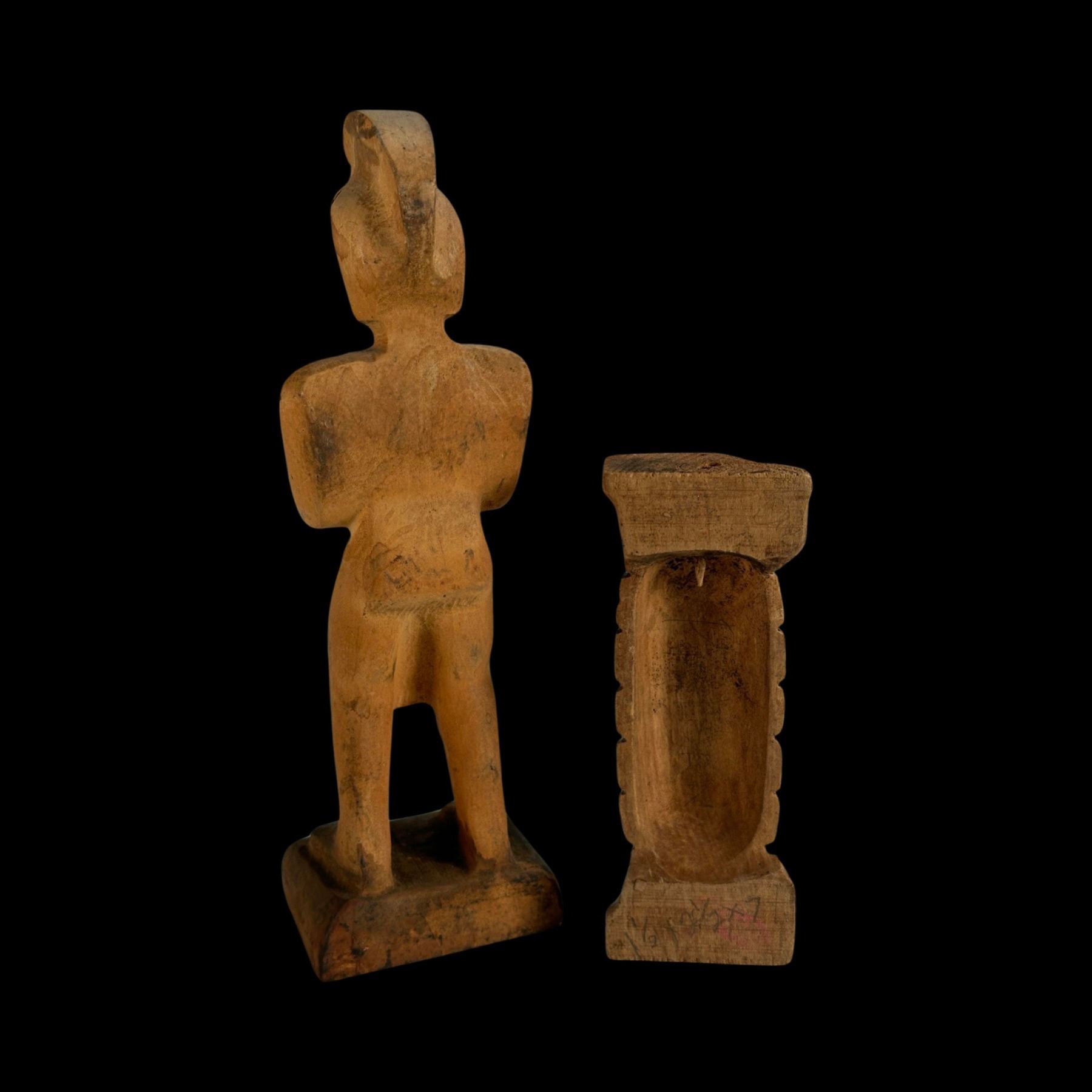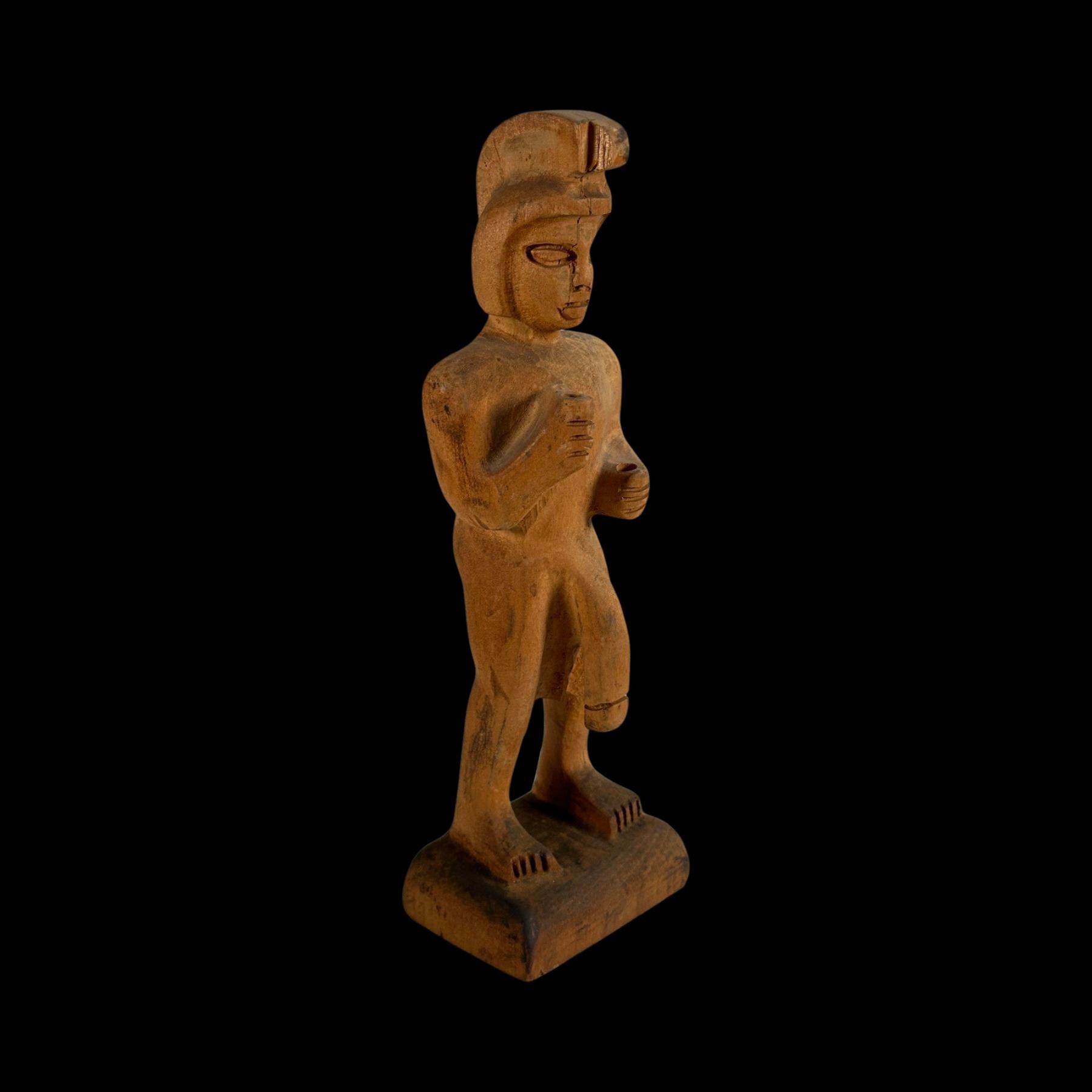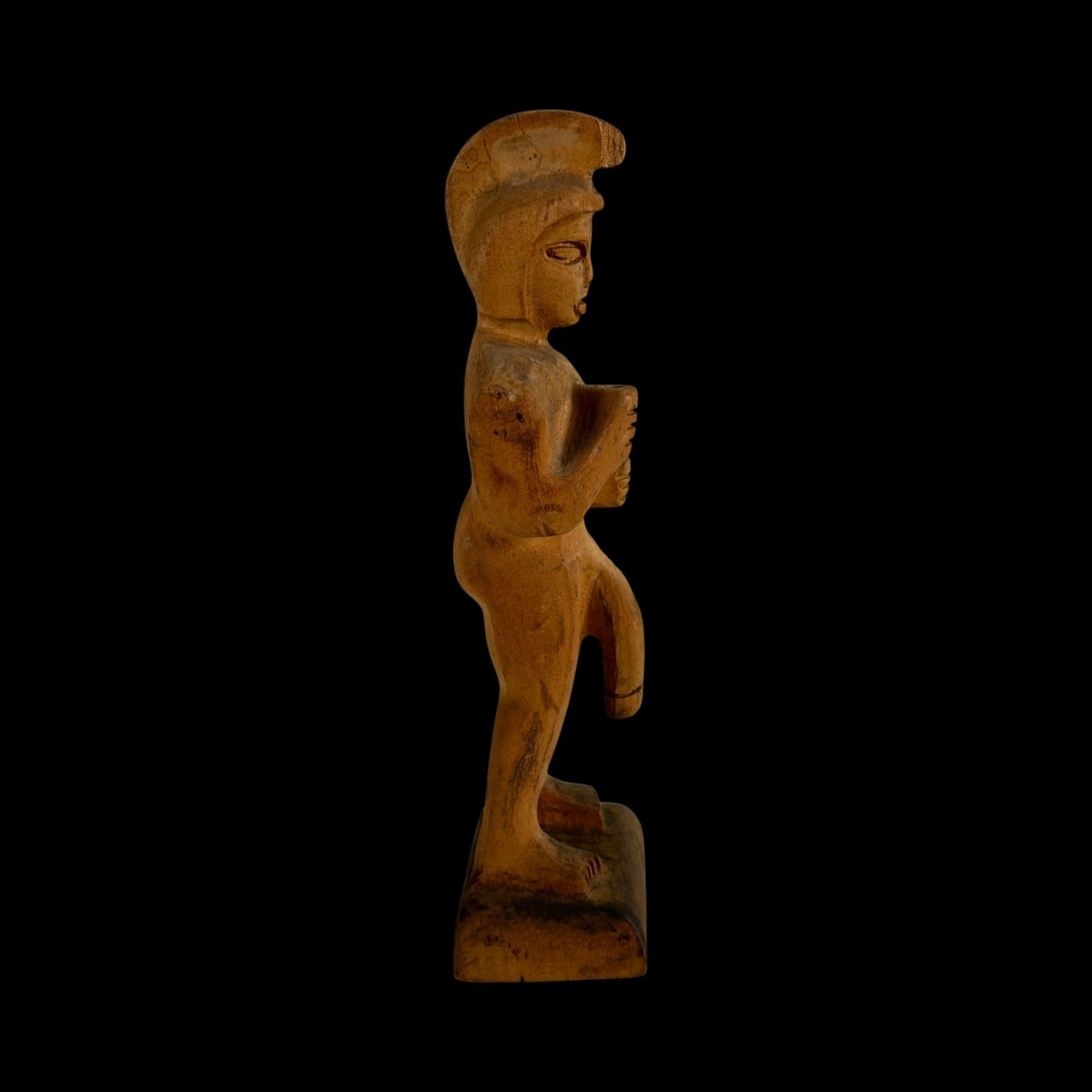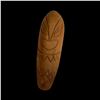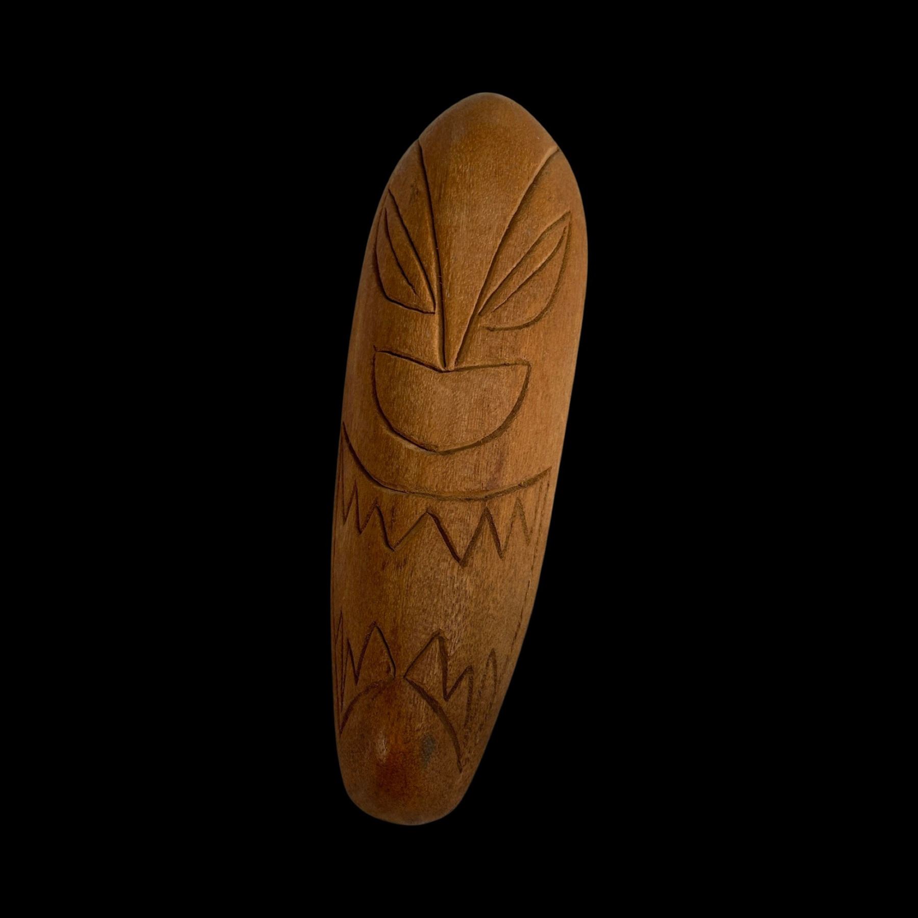 (1960s) A novelty carved Hawaiian warrior who,'s true prowess is revealed once his 'shield of modesty' is removed. This is a master pattern for catalog #207 carving by LeRoy Schmaltz and used in production. The piece comes with two shields, used for master pattern carving. VG+. 3.75"x11.5"x2.75" figure, 2.5"x7.25"x1" pattern, 3.5"x11.25"x2" shield.