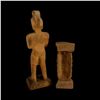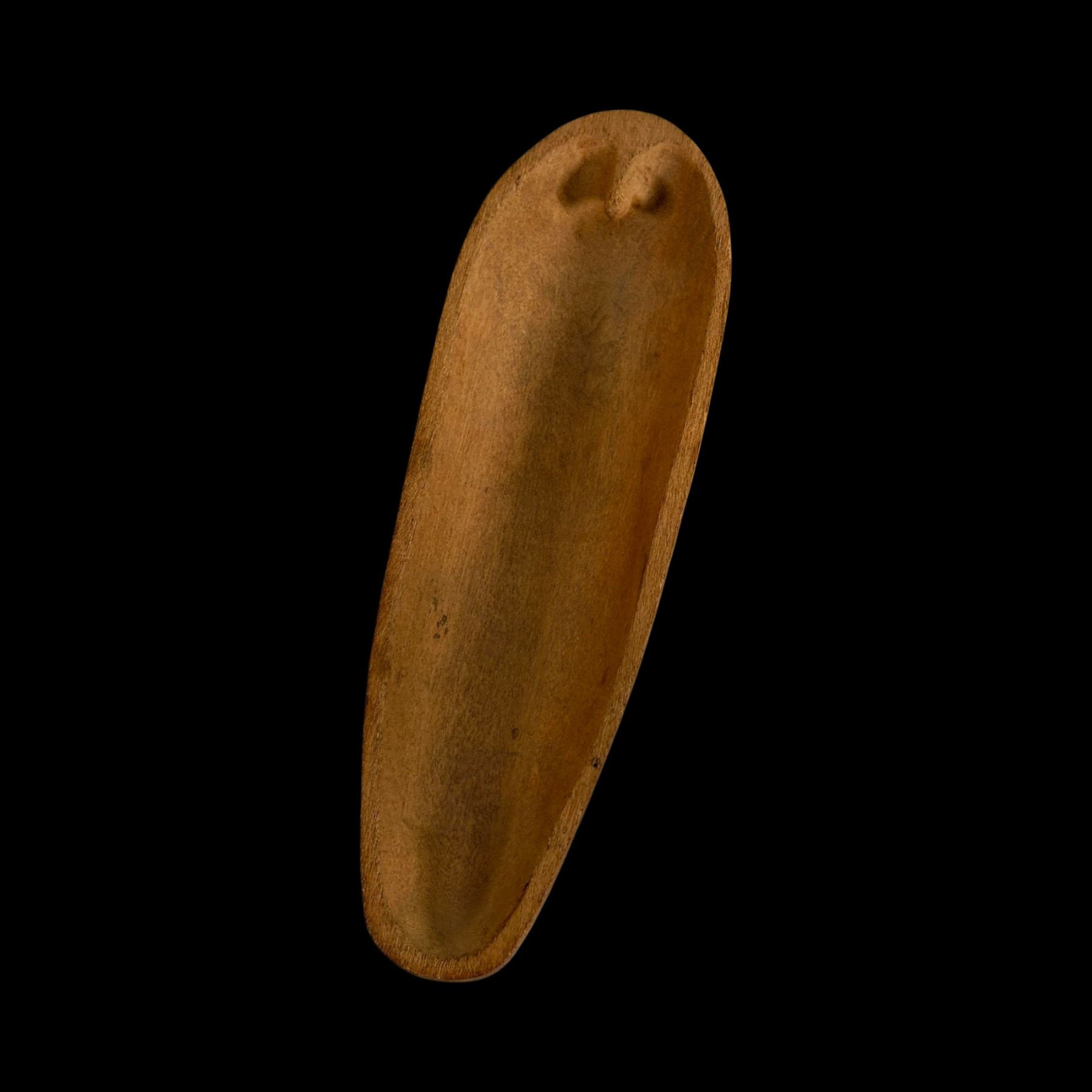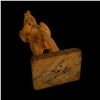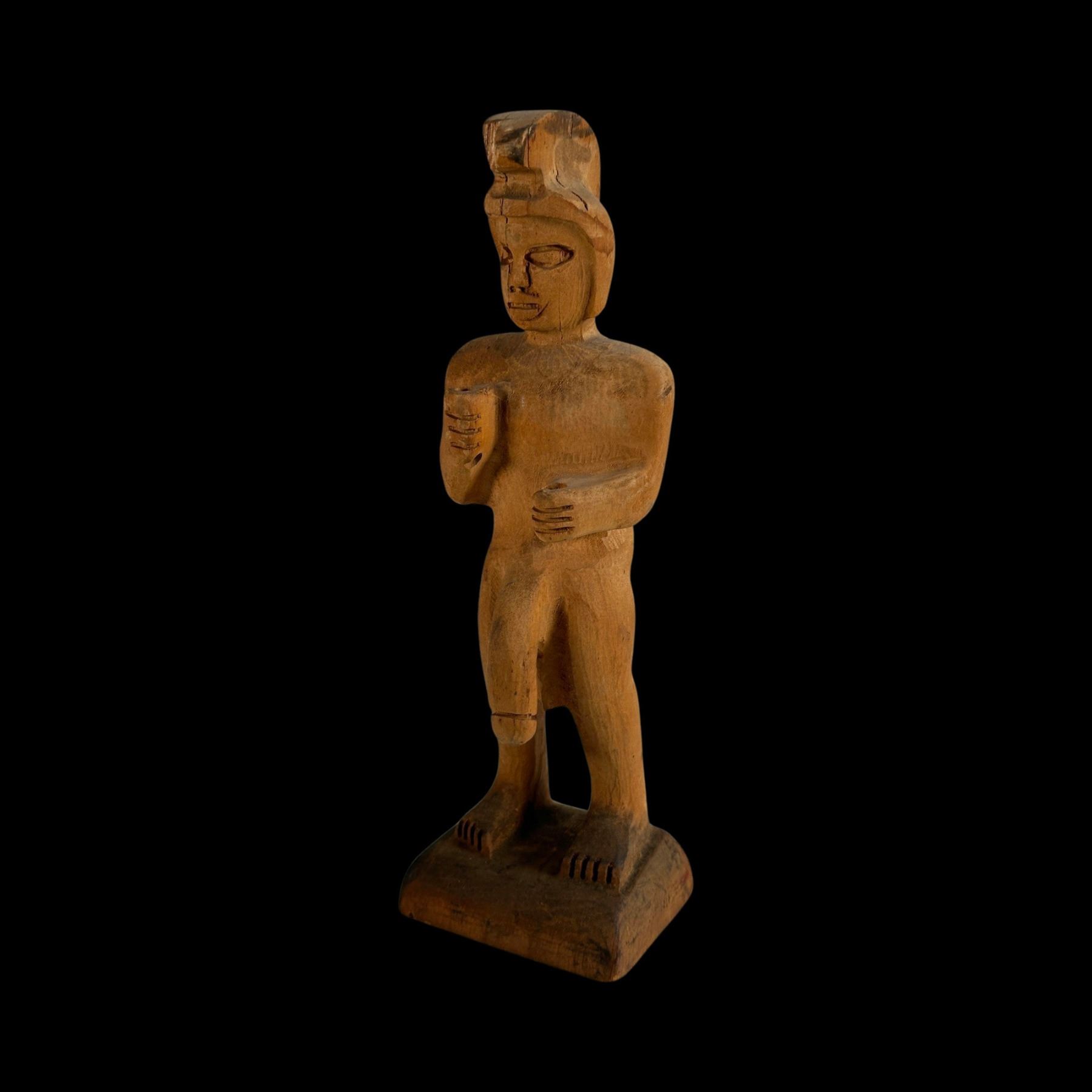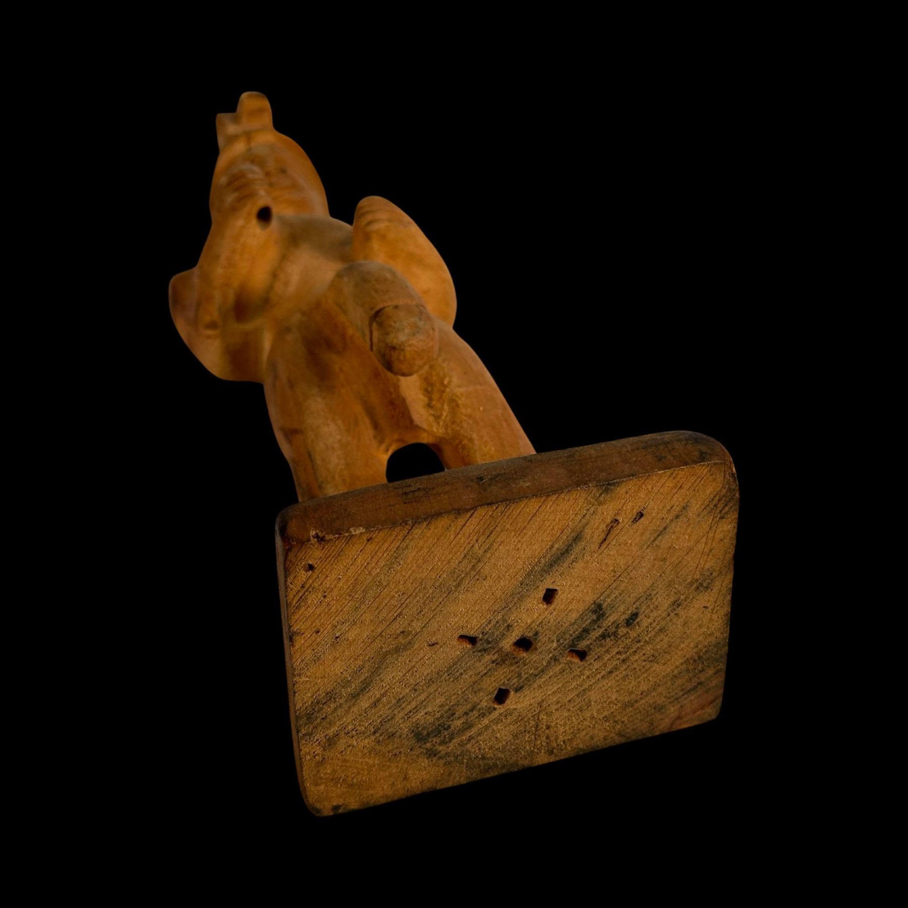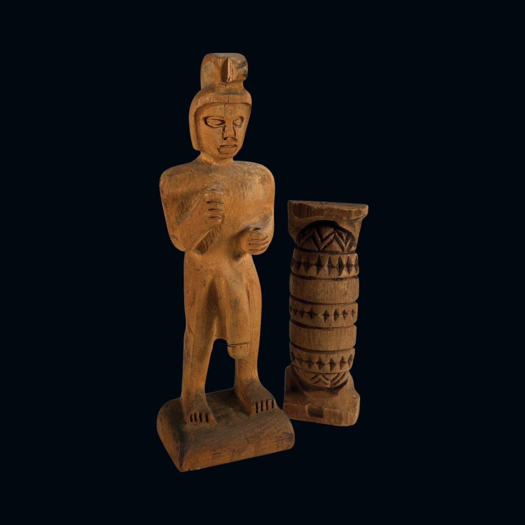 (1960s) A novelty carved Hawaiian warrior who,'s true prowess is revealed once his 'shield of modesty' is removed. This is a master pattern for catalog #207 carving by LeRoy Schmaltz and used in production. The piece comes with two shields, used for master pattern carving. VG+. 3.75"x11.5"x2.75" figure, 2.5"x7.25"x1" pattern, 3.5"x11.25"x2" shield.