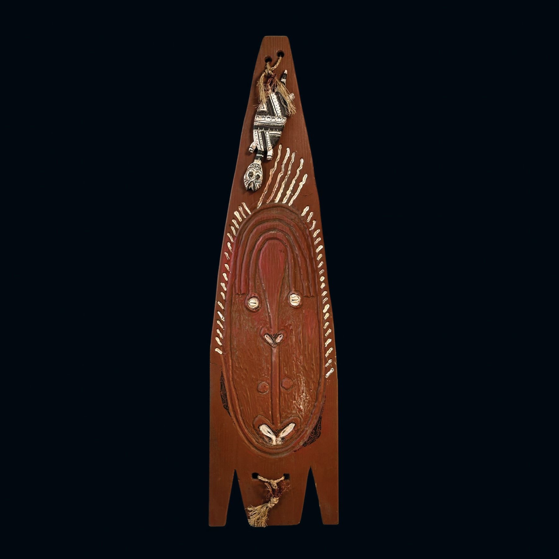 (2000s) Another interesting design by LeRoy Schmaltz depicting a spirit mask and turtle on a figural shield of the Lower Fly River region of Papua New Guinea. Fiber and sisal twine raffia accent. Marked and signed by LeRoy on the verso. VG+. 53.75"x14.25".