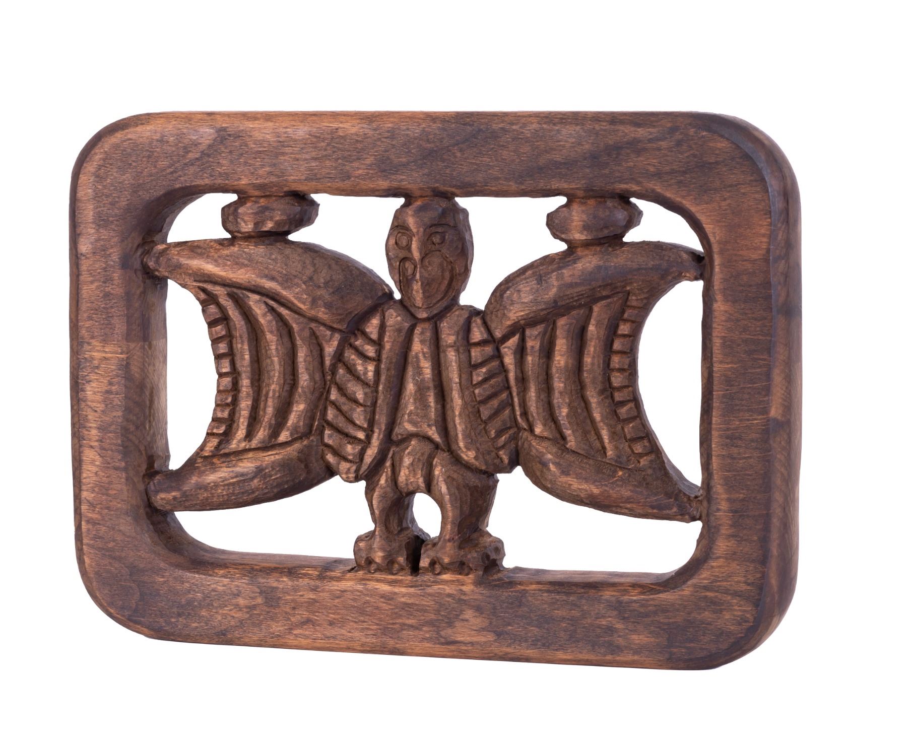 (1990s) Horizontal Papua New Guinea Bird God puka tile in hardwood. These novel tiles carved in wood were LeRoy Schmaltz's answer to the Chinese Breezeway tile. Two-sided. 13.5"x9.75. VG+.