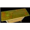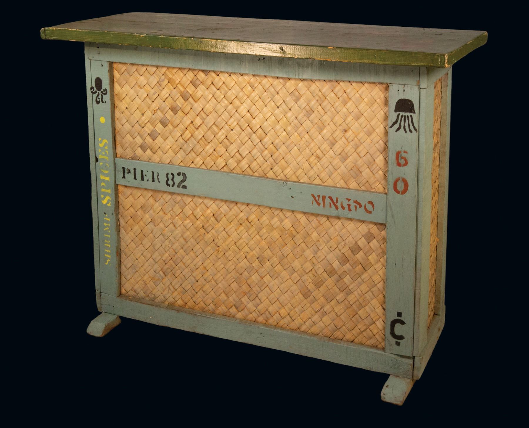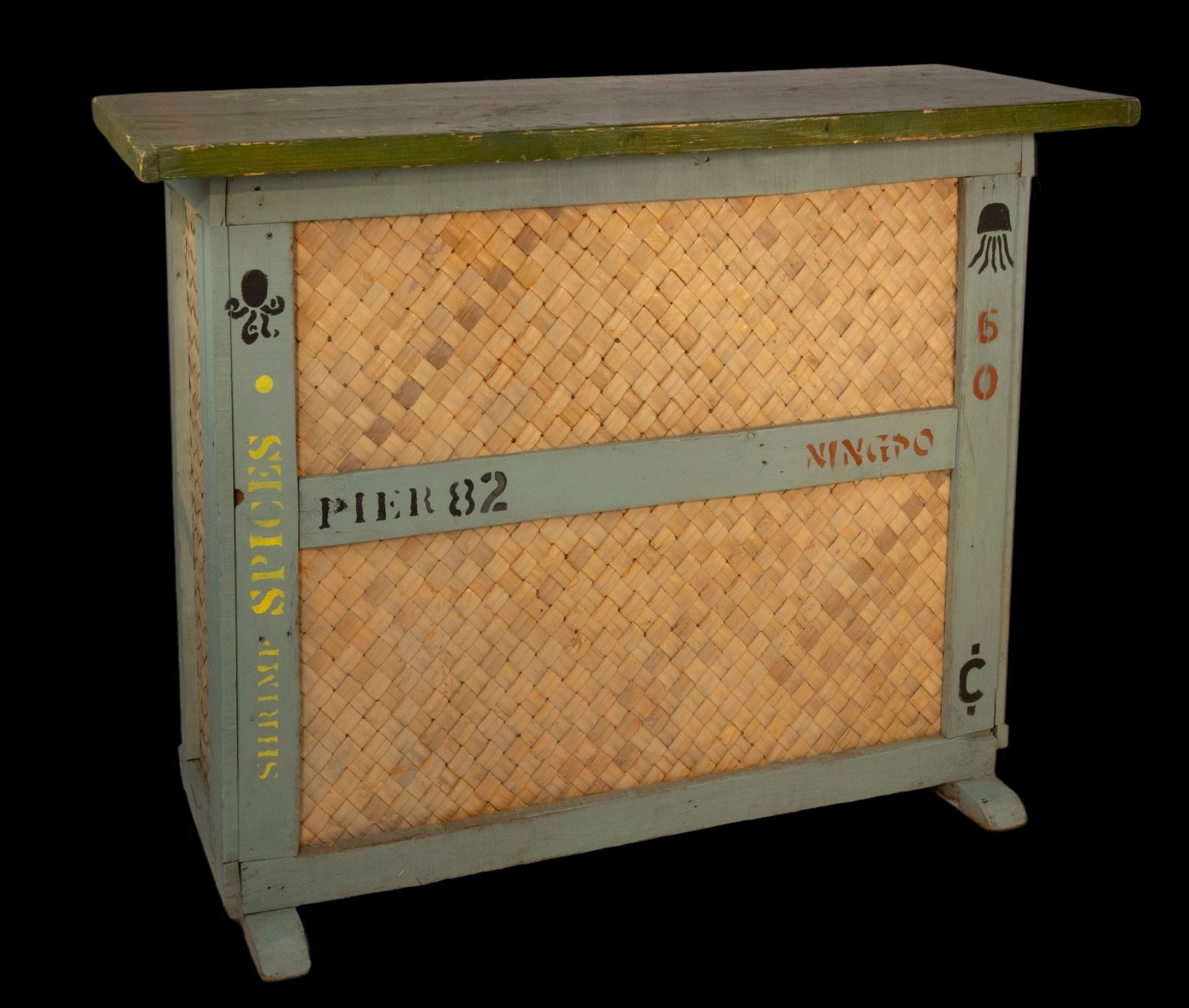 (1970s) A custom OA portable tiki bar made and used for decades in the OA LUAU RENTAL DEPARTMENT. These brutes were built for action and abuse by LeRoy Schmaltz, thus the construction is extremely sturdy. The bar features interior shelving, a removable bar top and painted accents by LeRoy himself. These were never marketed by OA and were only made for rentals. VG+ with typical wear and tear from use. This heavy, oversized item will require special shipping considerations. 39"x49"x19".
