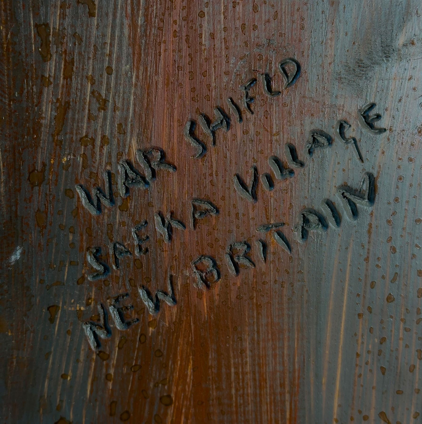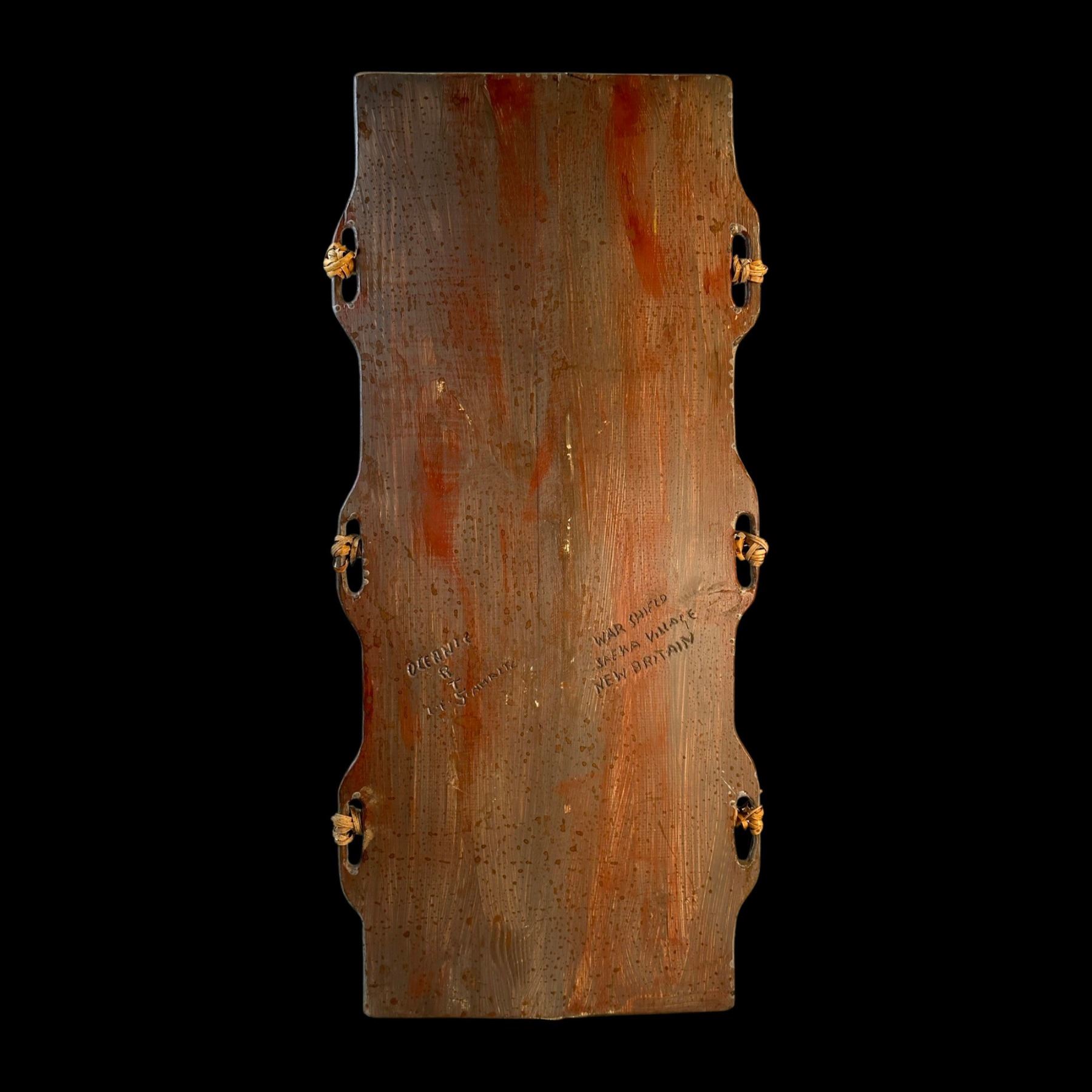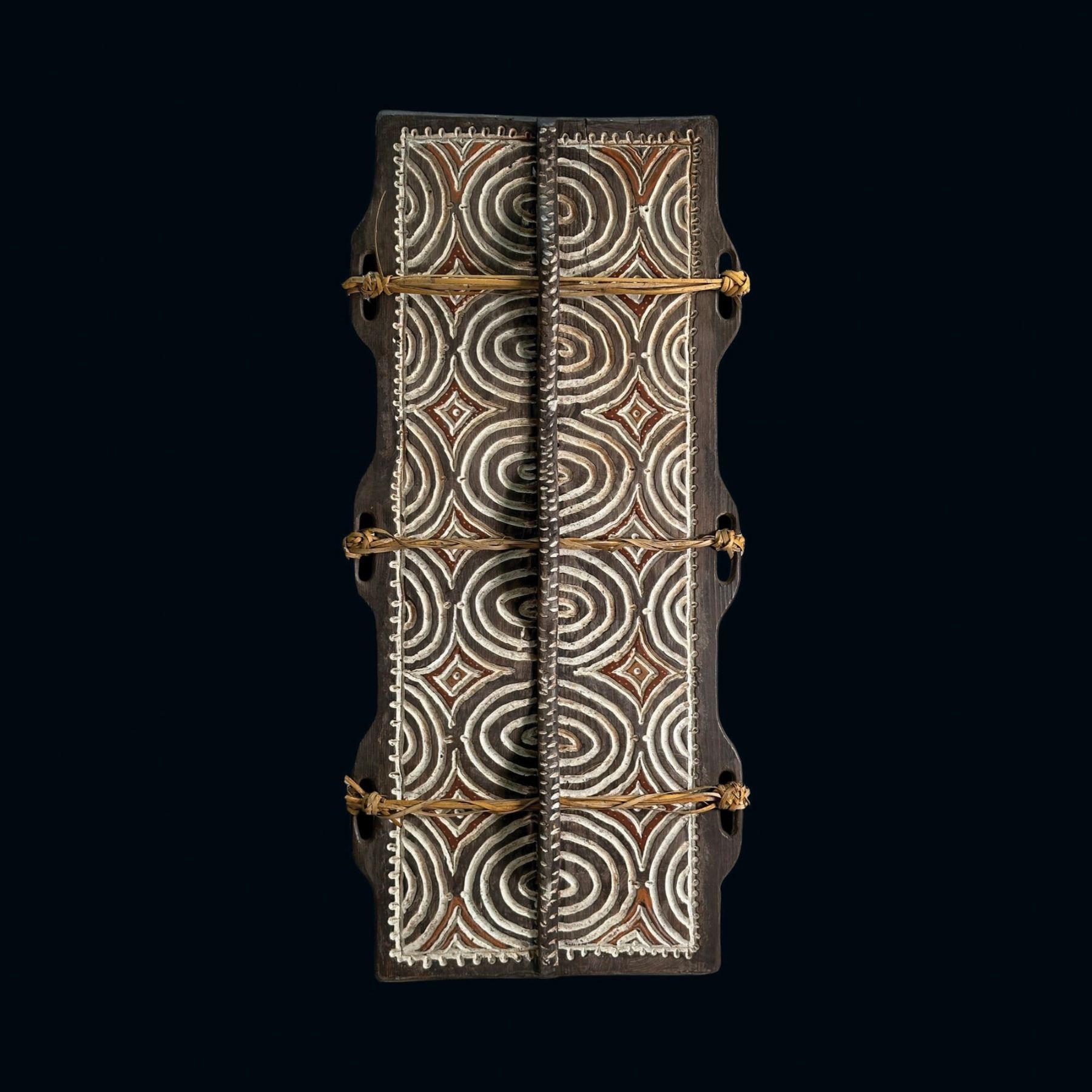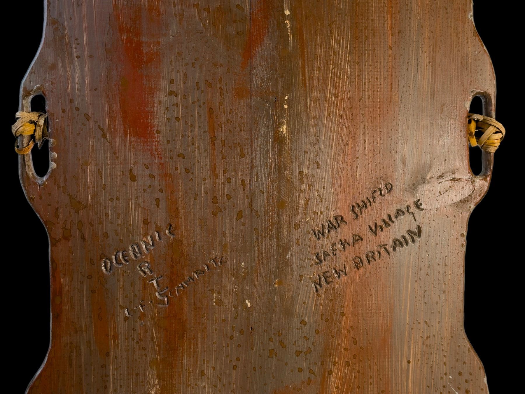 (2000s) A striking native war shield with cross handles and intricate markings. Carved signature and title on the verso. VG+.19.5"x42.5".
