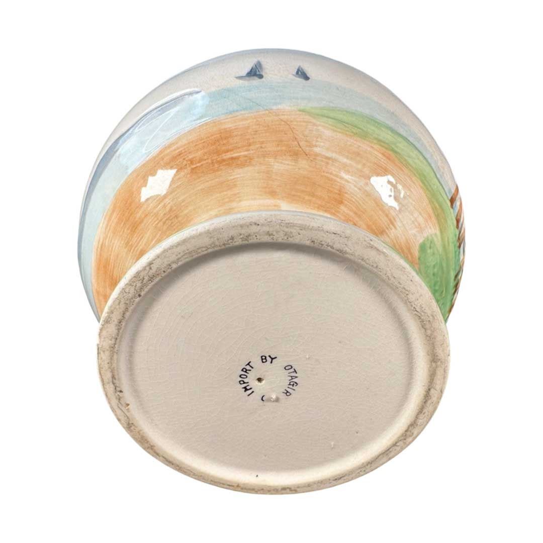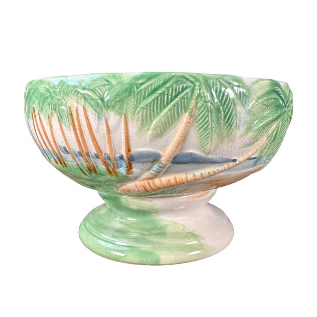 (1960s) Perhaps the largest of the OMC "Palm" bowls. Features wonderful sculpt of a Hawaiian shoreline with swaying palms surrounding the bowl body. 4.75"x8". VG+ with light discoloration in bowl from age. Can be cleaned with peroxide is one chooses.