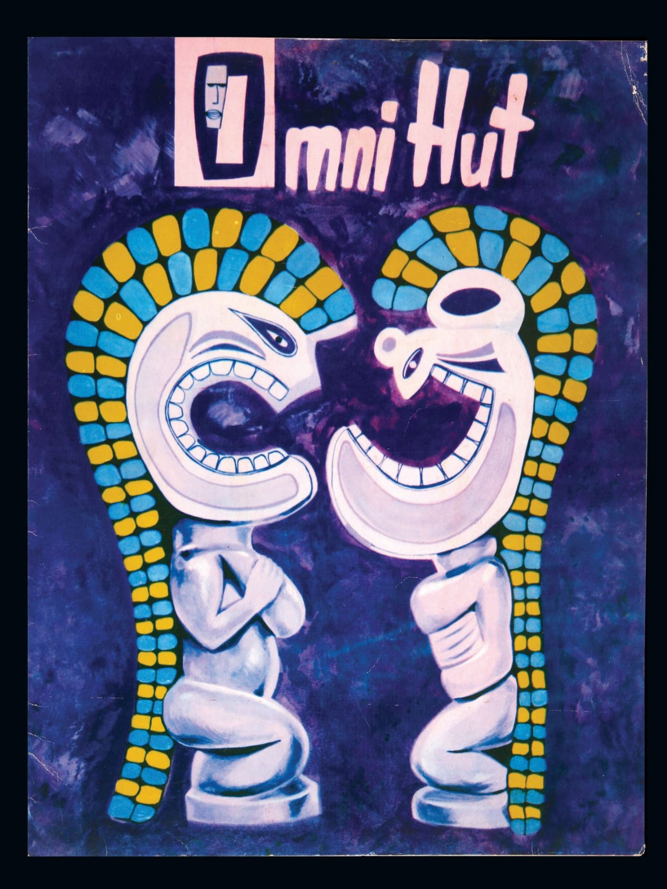 (1960s) Bold restaurant menu of the Omni Hut in Smyrna, Tennessee. Legacy restaurant survived the fall and revival of Tiki, only to close in 2018. VG+ with light wear. 10.25"x13.25" closed.