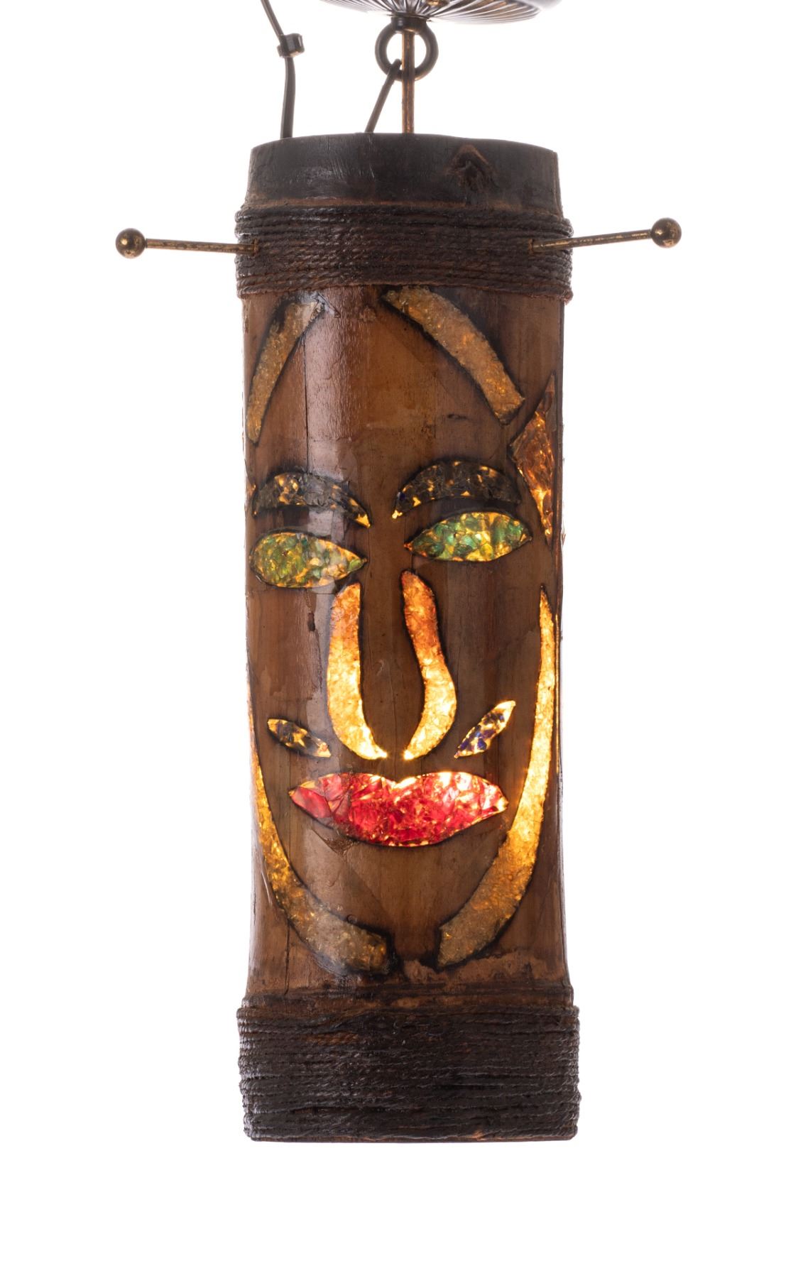 (1960s) Colored flecks of resin inlay create a whimsical face to this unique hanging lamp. Crafted with hollowed bamboo and topped with a wrapping of rope enhanced with metal posts, this lamp comes with electrical cord. 14.5"x4.75". VG+.