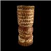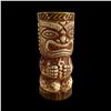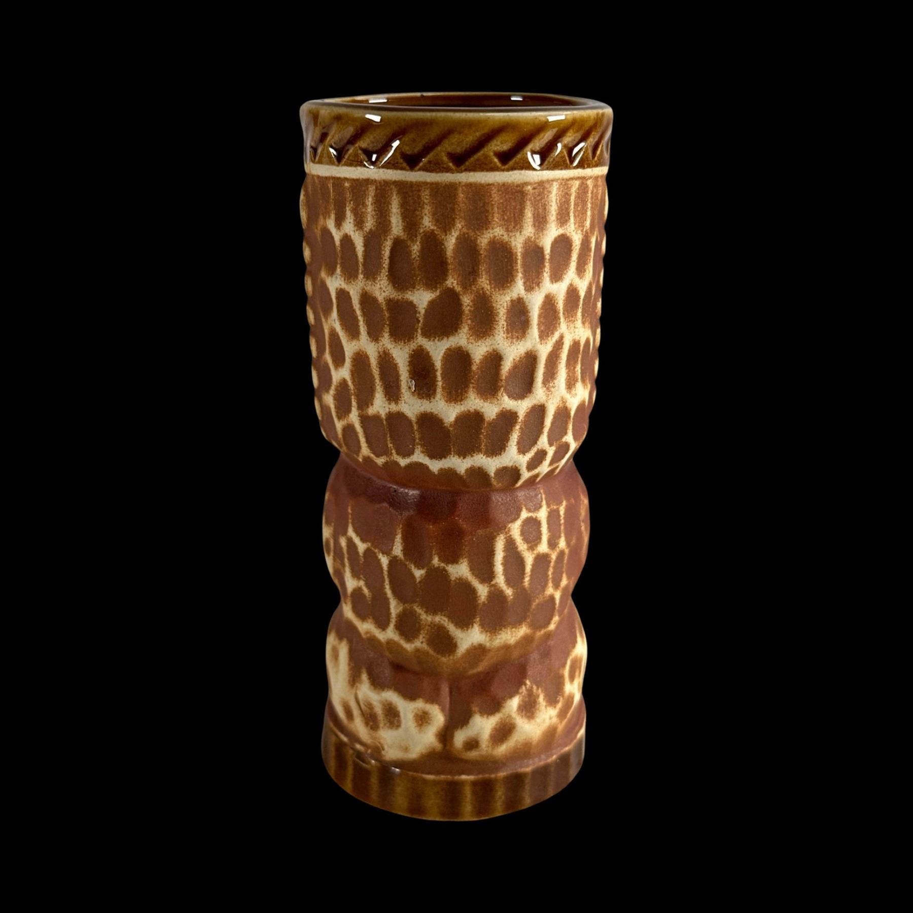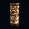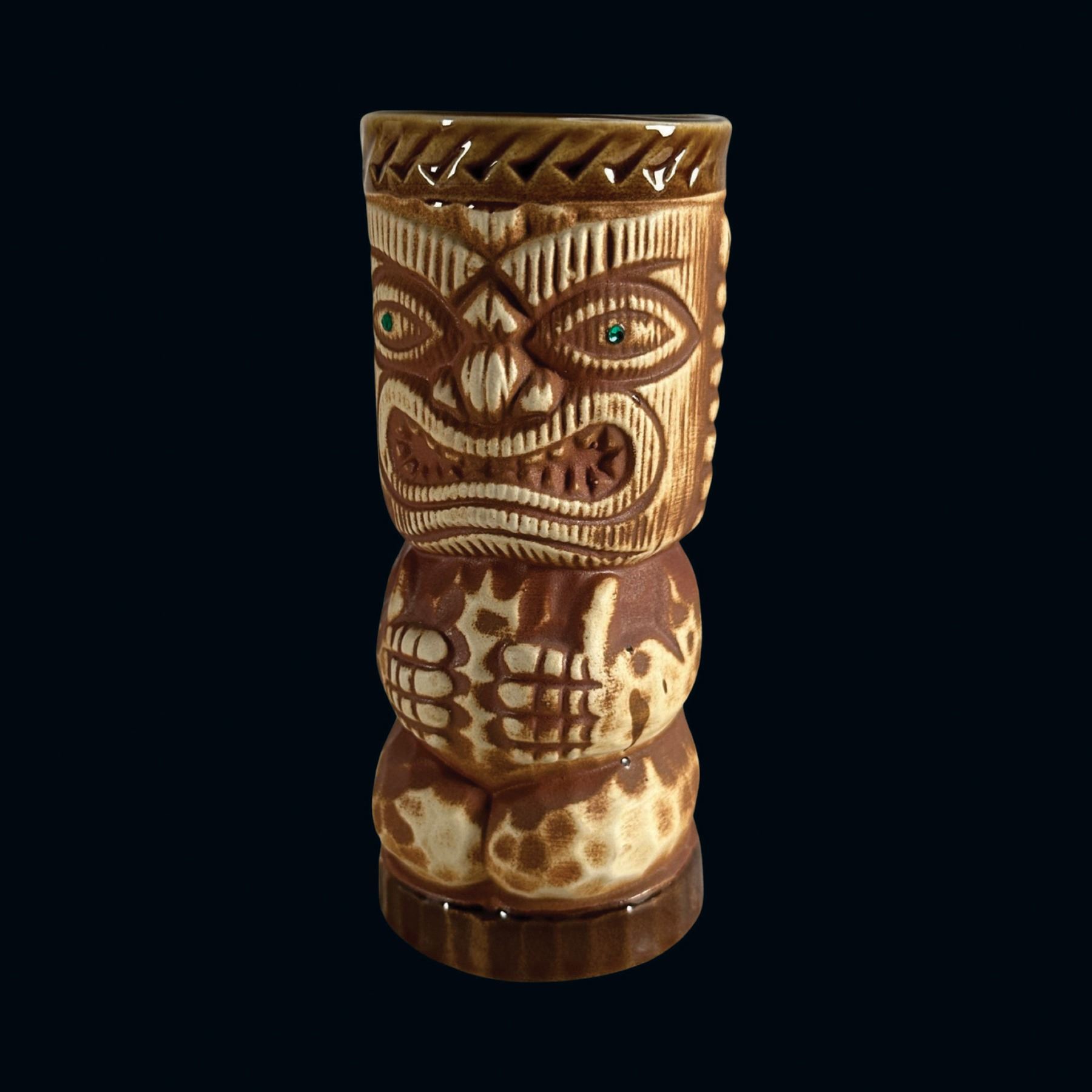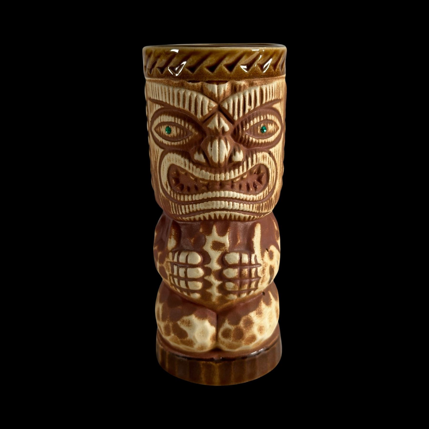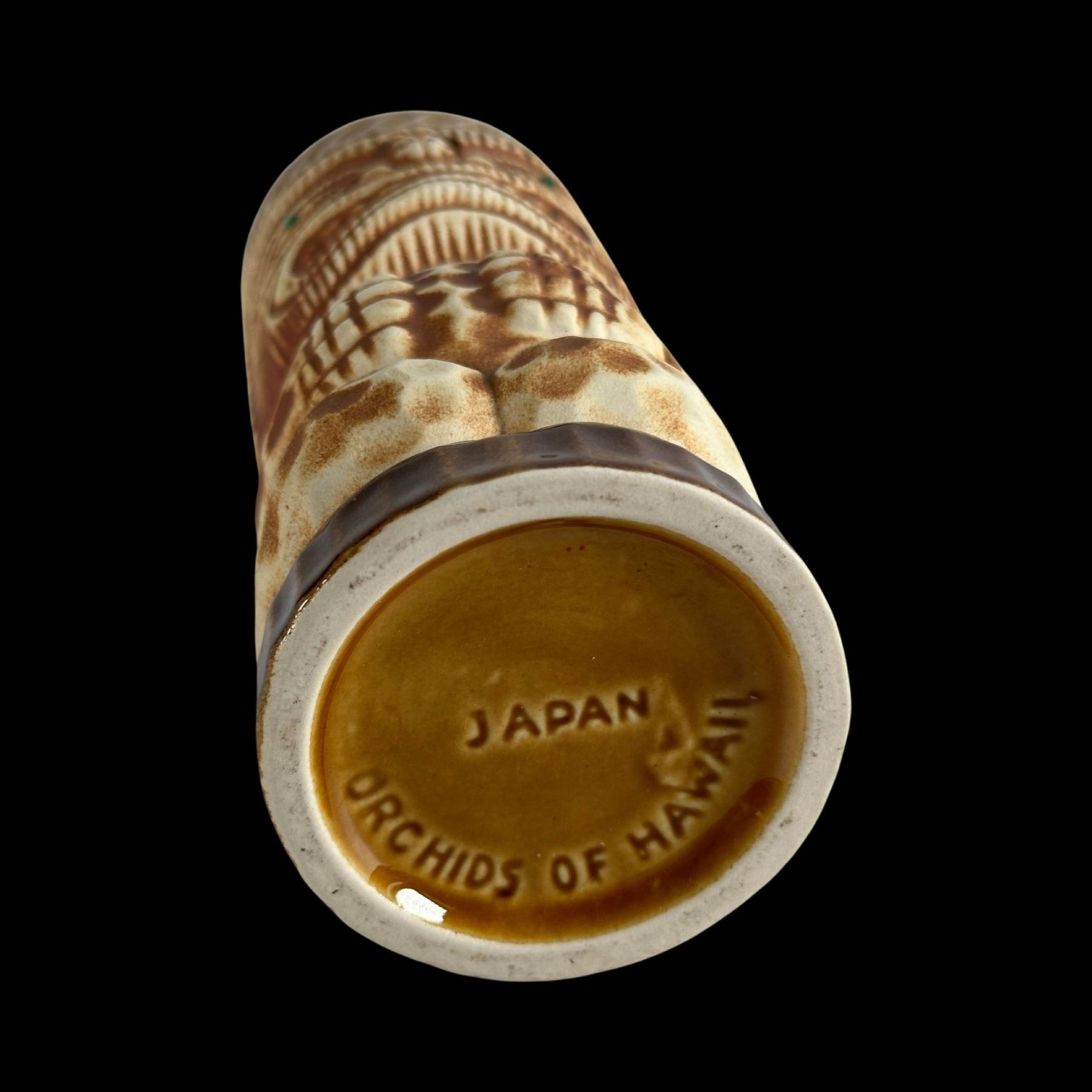 (1960s) Striking raw tan KU War God mug by Orchids of Hawaii with inset green rhinestone jewel eyes. VG+ with typical wear. 2.75"dia x 6.25".