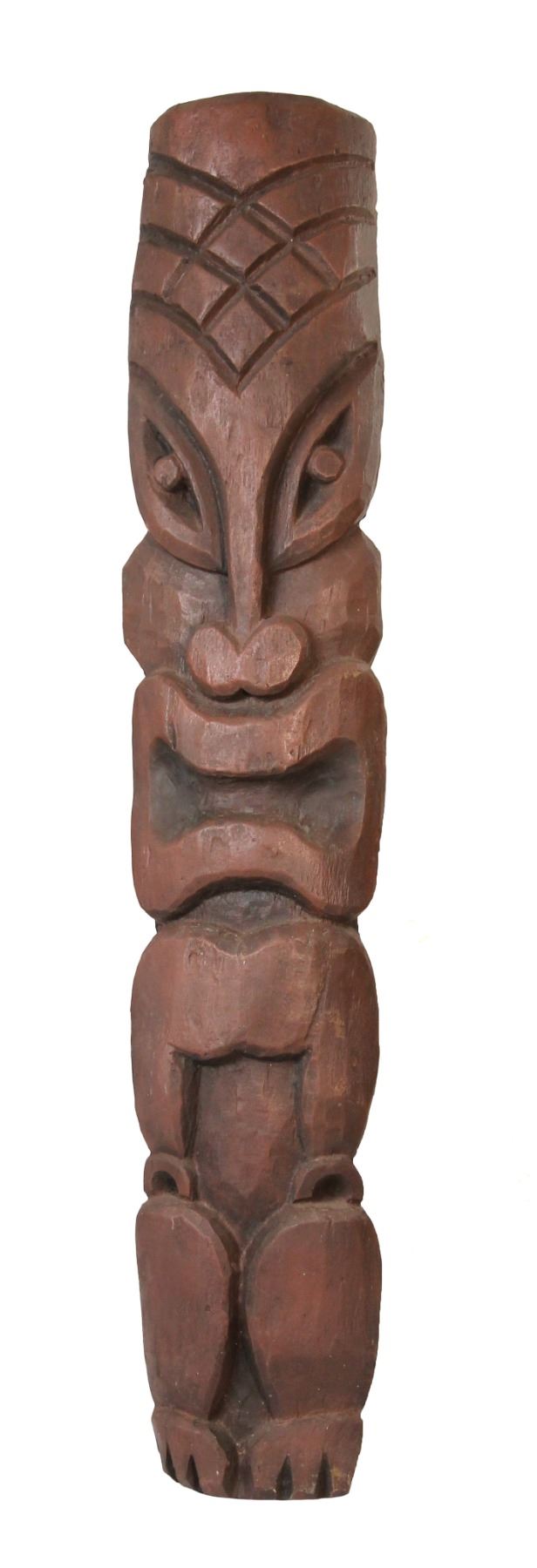 (1960s) Out of the Orchids of Hawaii catalog somes this exceptionally generic Tiki design. These were carried by Sea & Jungle as well as Benson's in the 1960s and 70s. Deep carving create a welcoming pineapple texture to this all-fiberglass carved Tiki figure. Painted fiberglass material. 59.5"x11.5". VG+.