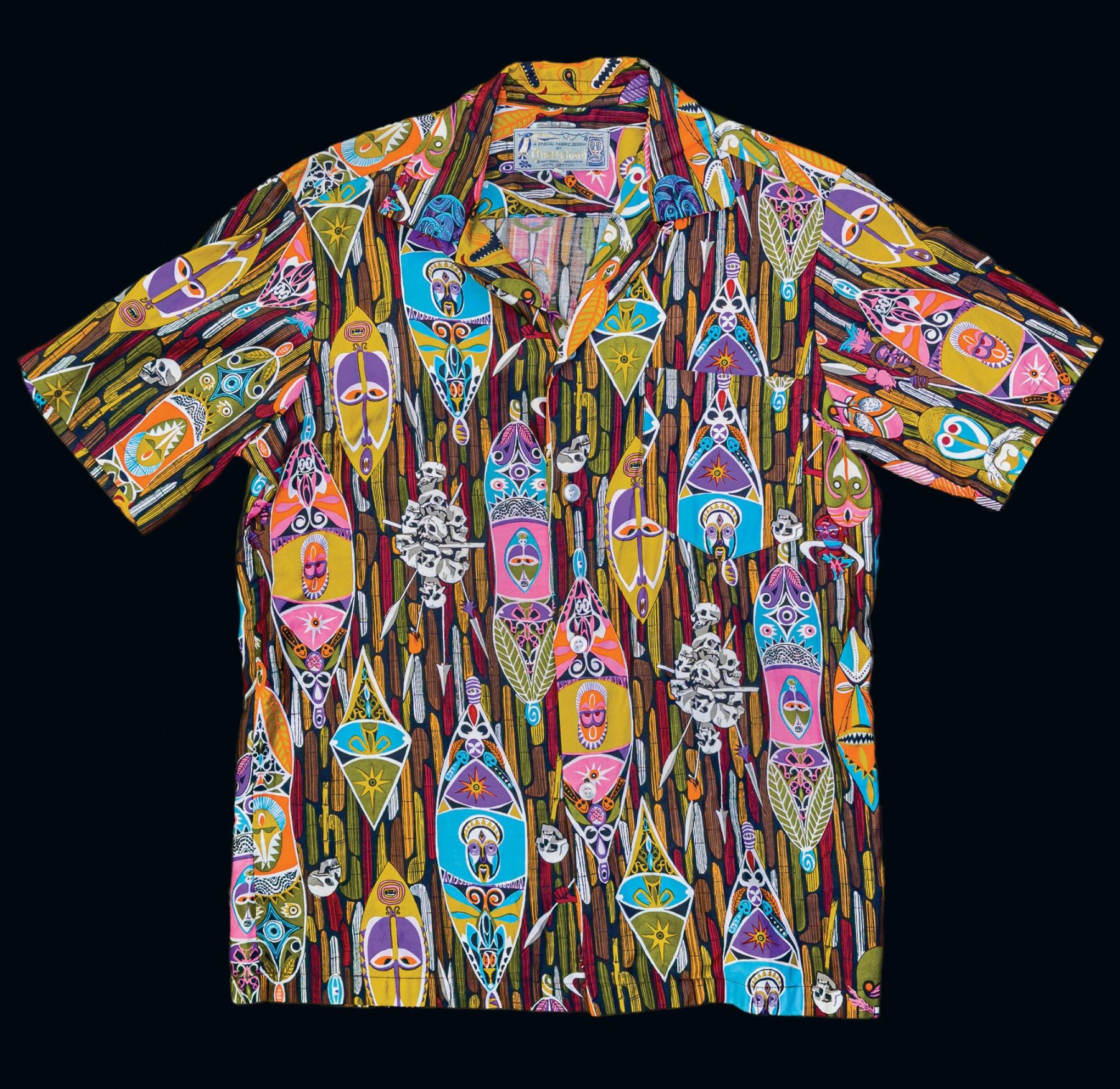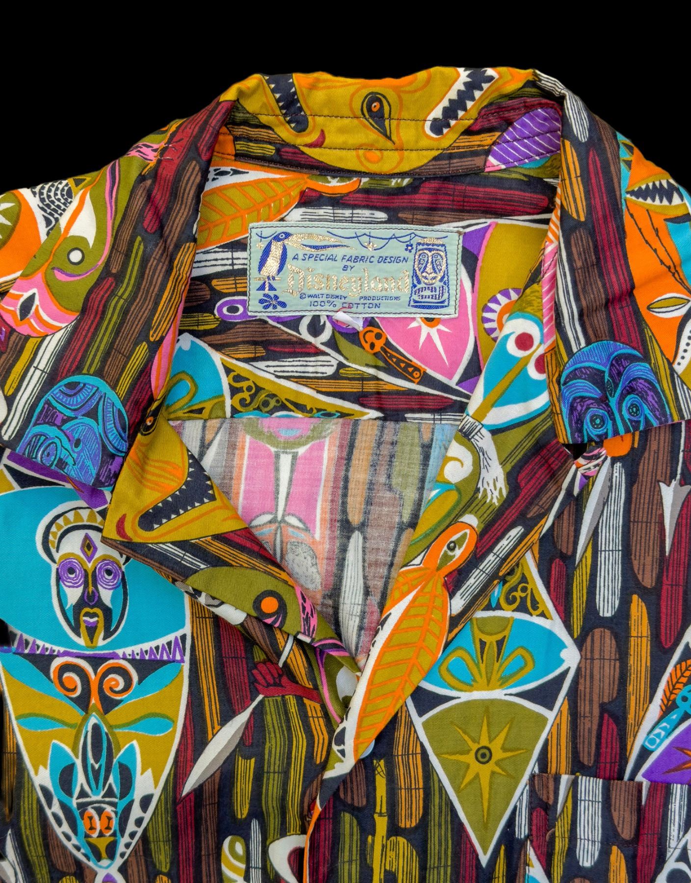 (1960s) This is the more scarce pattern of the original 1960s Disneyland Enchanted Tiki Room cast member host Hawaiian shirt. The shields and skulls over brown pattern. Any host shirt from the Tiki Room is scarce. This version is perhaps the most difficult to find. Original metallic thread Disneyland label. VG+. CHEST-42" LENGTH-25".