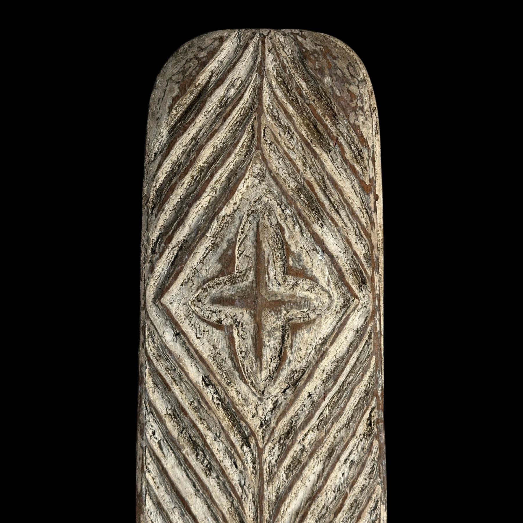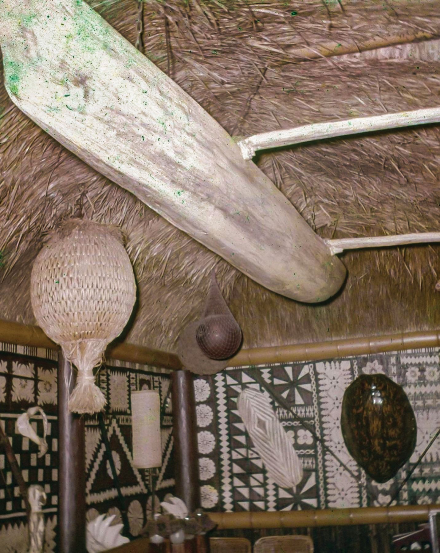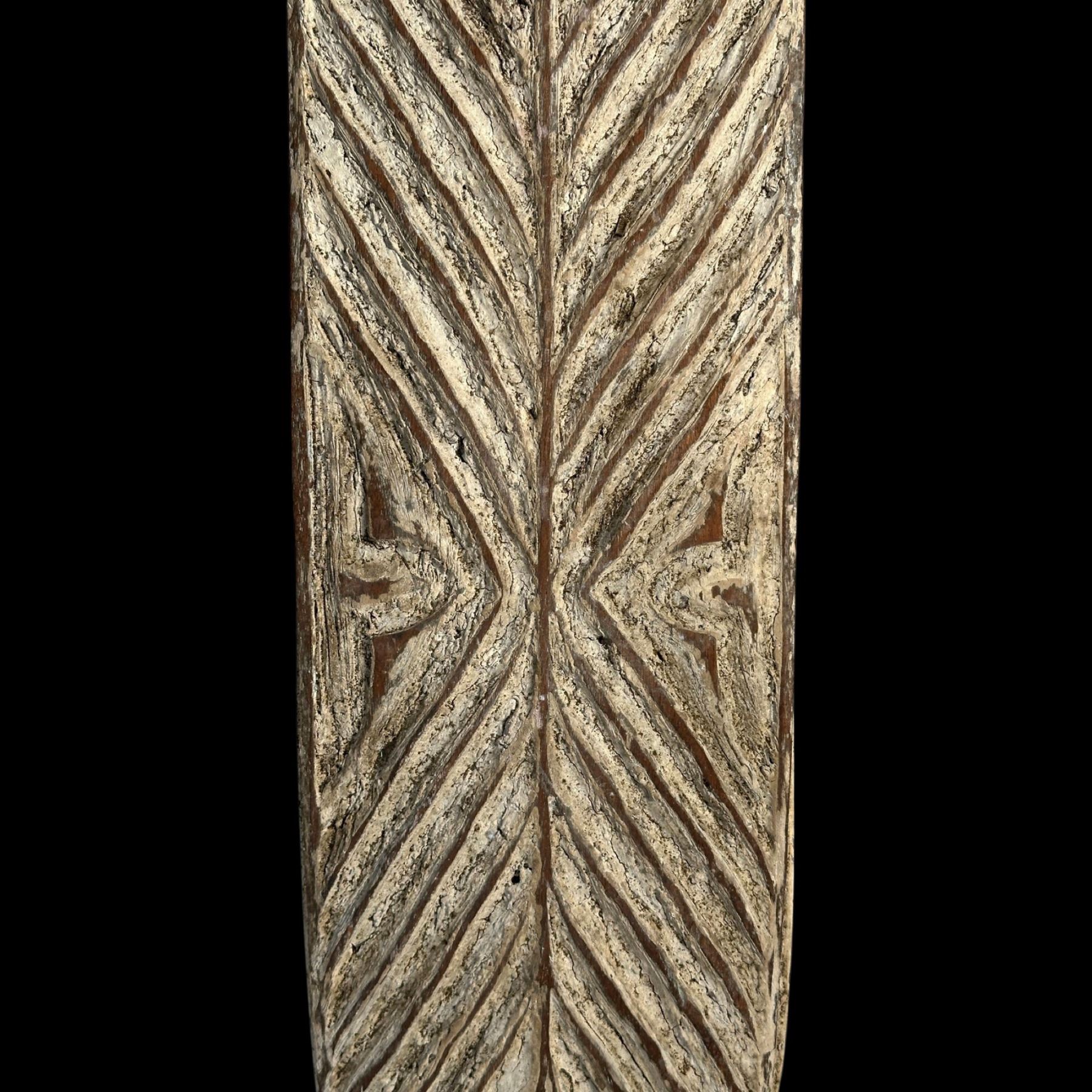 (1950s) Another piece of rare MAI-KAI remodel salvage. Photos from the period show this configuration of single-sided wall shield created by Schmaltz-Van Oosting/Oceanic Arts. This particular shield features OA's signature simulated "limed white" finish. VG+ with typical wear. 36"x8".