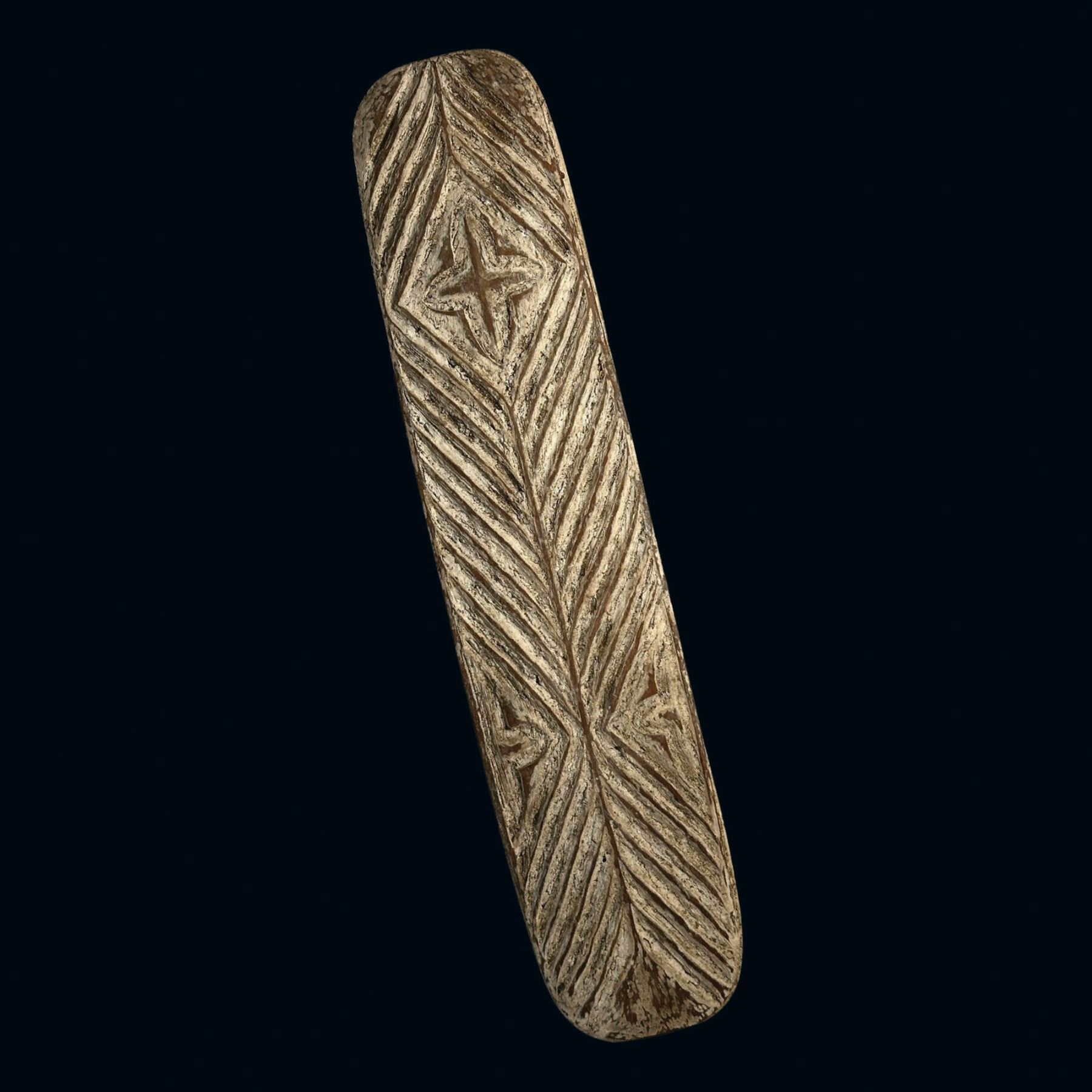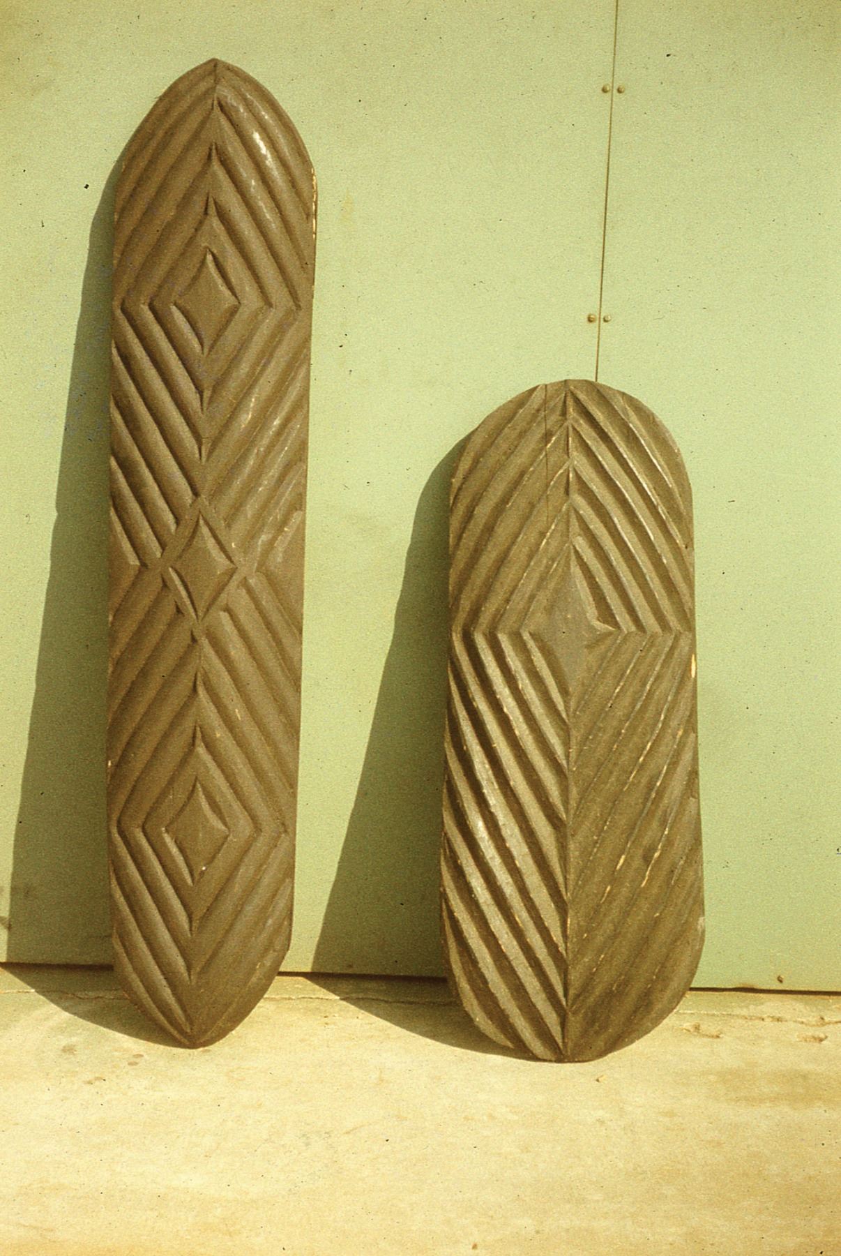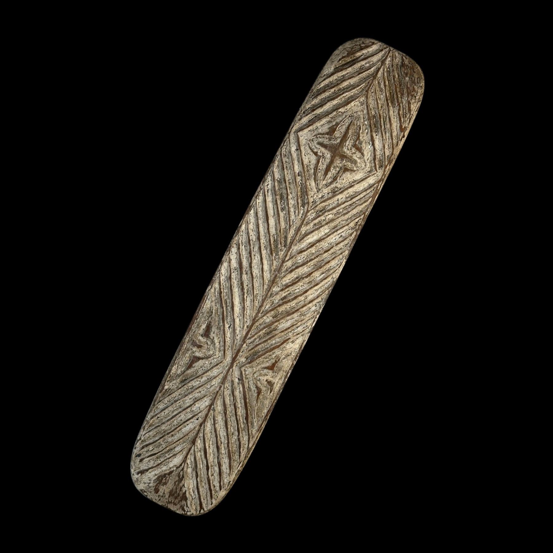 (1950s) Another piece of rare MAI-KAI remodel salvage. Photos from the period show this configuration of single-sided wall shield created by Schmaltz-Van Oosting/Oceanic Arts. This particular shield features OA's signature simulated "limed white" finish. VG+ with typical wear. 36"x8".