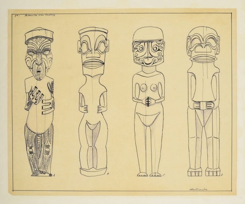 (1950s) A gorgeous concept drawing of four tiki figures, most probably for an early Schmaltz-Van Oosting catalog. Signed by LeRoy Schmaltz. Pen and ink with conte' on vellum, conservation mounted on ragstock.15"x18.75"EX