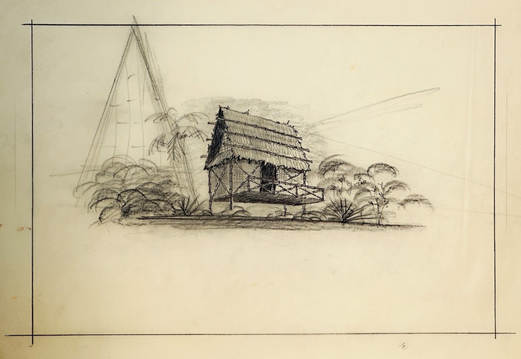 (1950s) Here is an almost romantic exploration to the styling of what will become the BORA BORA building next to the MAI-KAI entrance, across the valet area. This building was planned to be a semi-working facade but in actuality, was a storage facility to hold cold and dry goods for the growing MAI-KAI restaurant and bar. Beautiful sketch by architect, Charles McKirahan on onion skin paper. VG+ with edge toning and creasing. Unmounted. IMAGE 22"x14.5", SHEET 24"x17.5".
