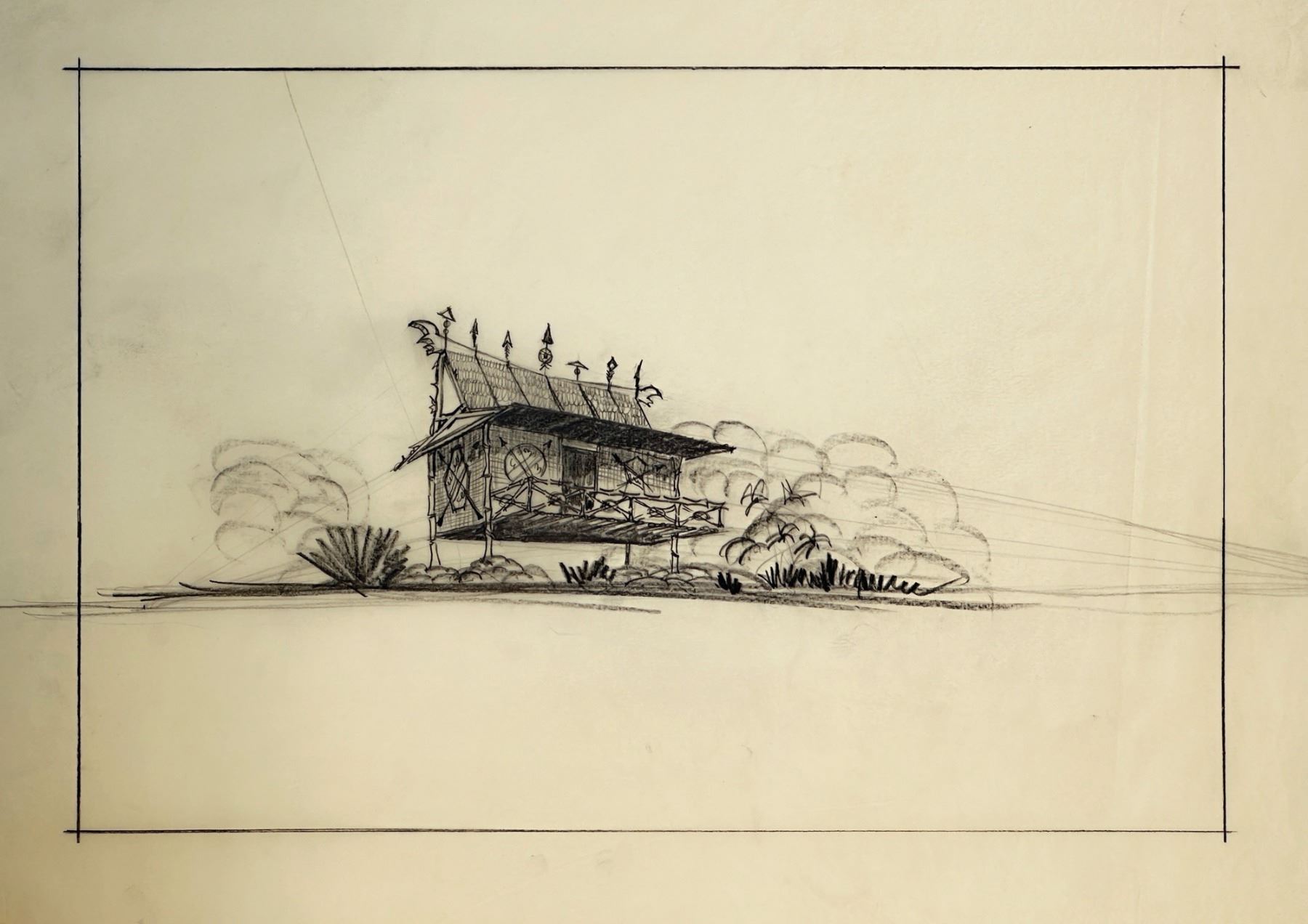 (1950s) Another exploratory view and style for the proposed "Storage Hut building that will become the "BORA BORA Banquet Room". VG+ with edge toning and creasing. Unmounted. IMAGE 20"x13.5", SHEET 23.75x17.5.
