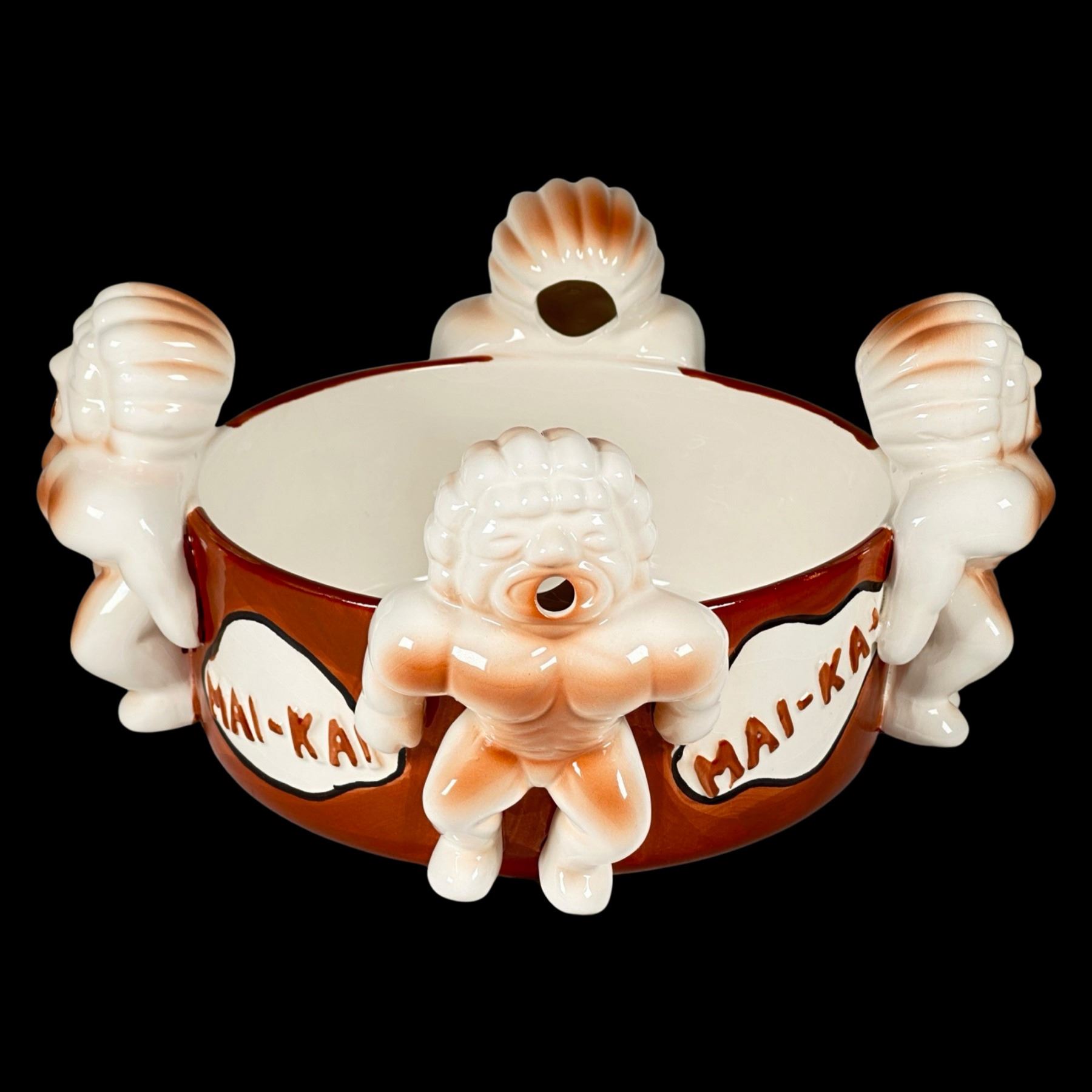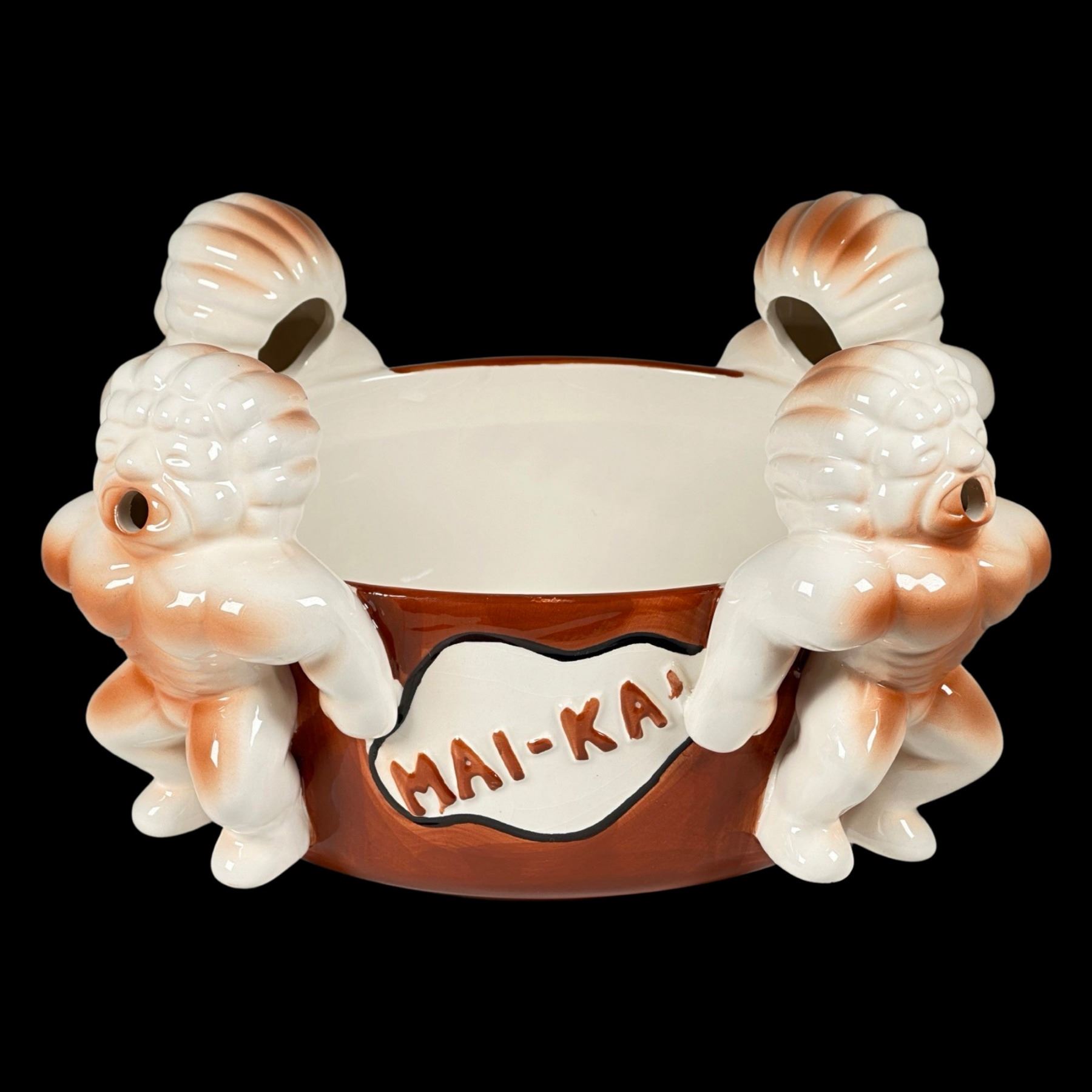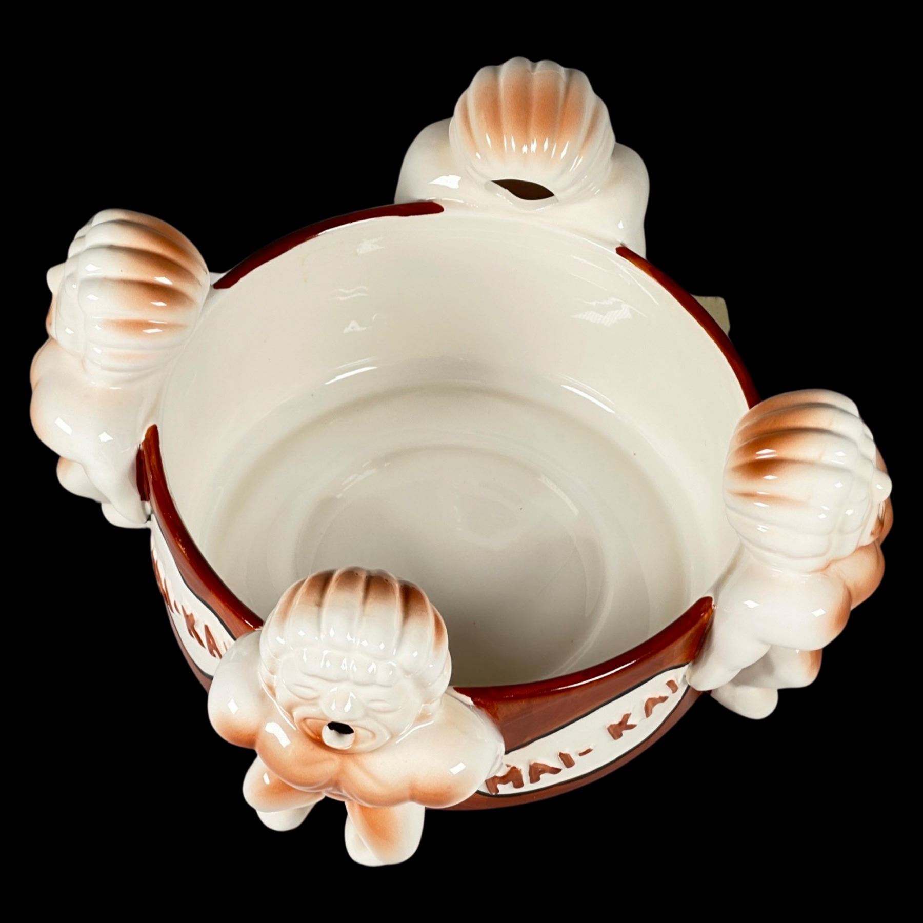 (1970s) This is the 3rd iteration of the elusive communal "mystery bowl", created for the theatrical presentation ceremony where a gong would clang, the bar go silent as the "Mystery Girl" would make her way to the table that ordered it, place the bowl table center, pick one of the male guests at said table to "lei" and kiss. Truly, one of the most fanciful experiences in all of mid-century Polynesian Pop! Four Ku Tikis surround the bowl with mouth holes for the long straws. In excellent, apparently unused condition. VG+. 12"dia x 6".