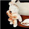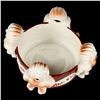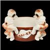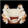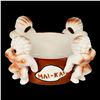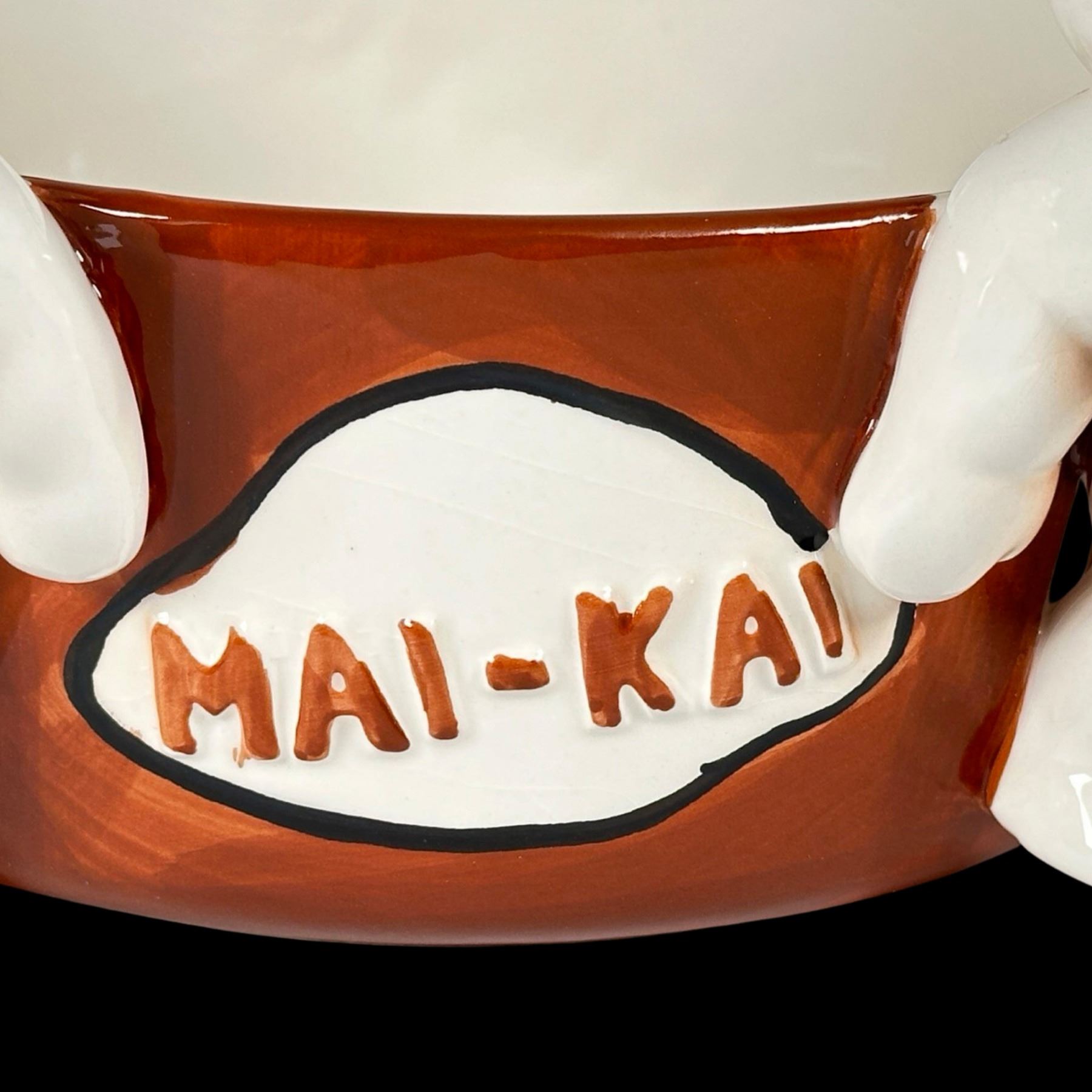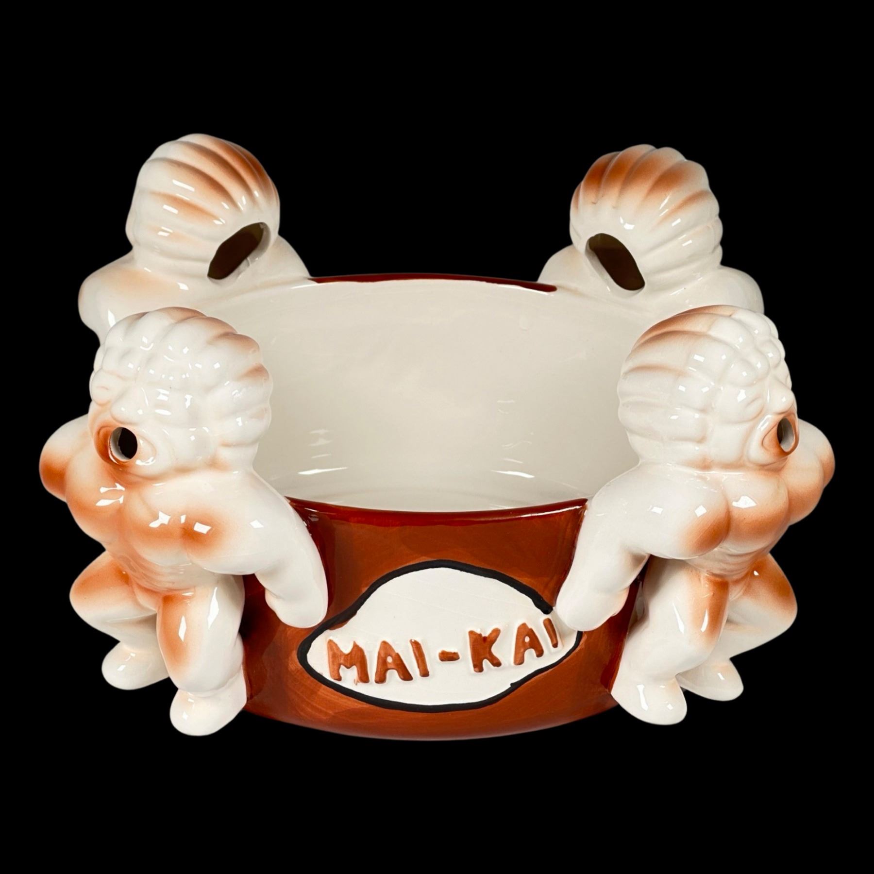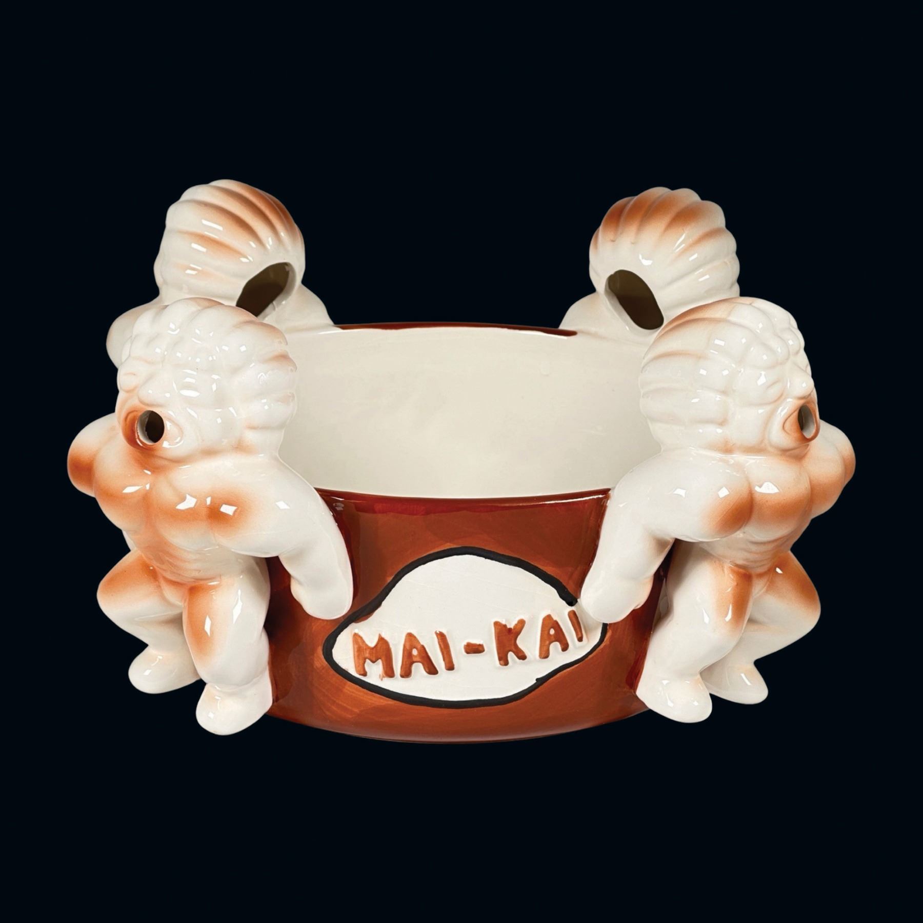 (1970s) This is the 3rd iteration of the elusive communal "mystery bowl", created for the theatrical presentation ceremony where a gong would clang, the bar go silent as the "Mystery Girl" would make her way to the table that ordered it, place the bowl table center, pick one of the male guests at said table to "lei" and kiss. Truly, one of the most fanciful experiences in all of mid-century Polynesian Pop! Four Ku Tikis surround the bowl with mouth holes for the long straws. In excellent, apparently unused condition. VG+. 12"dia x 6".