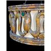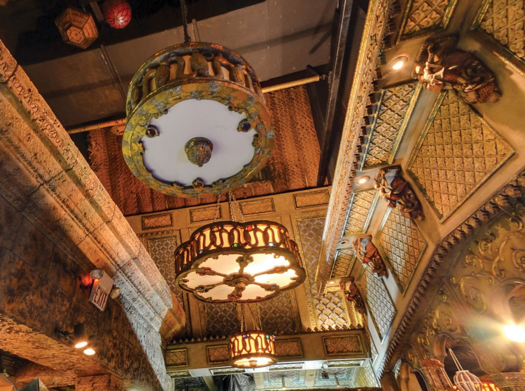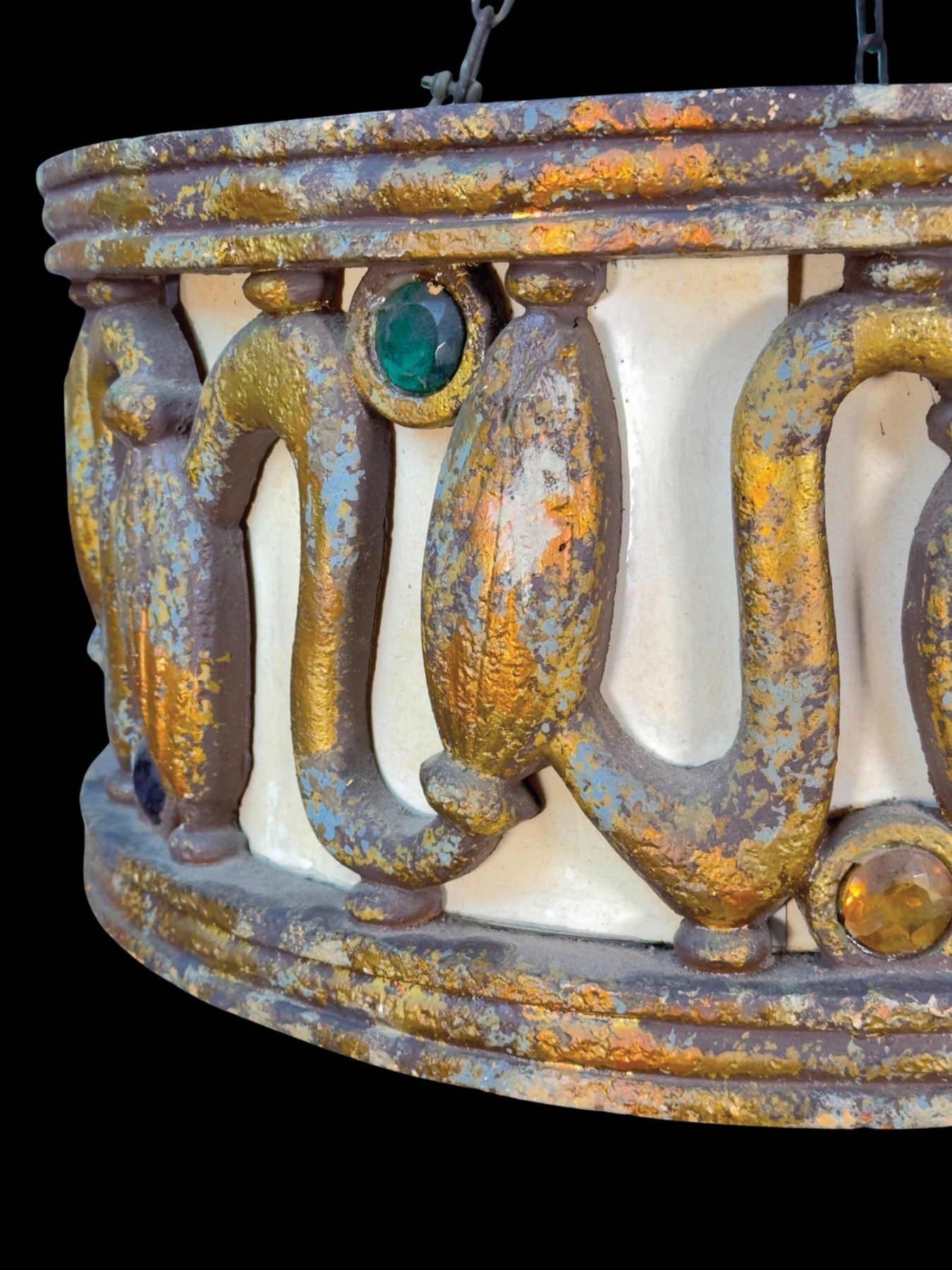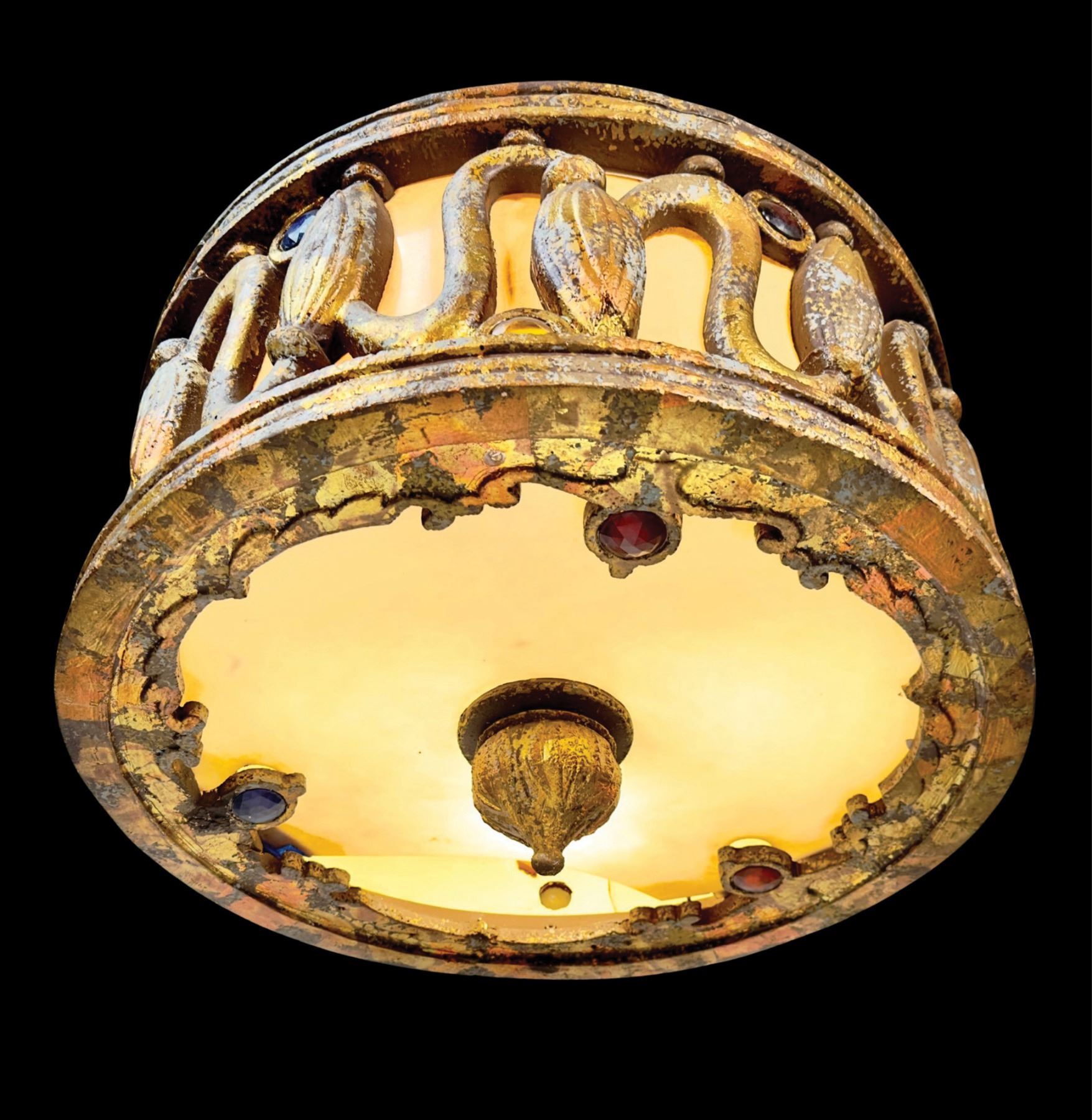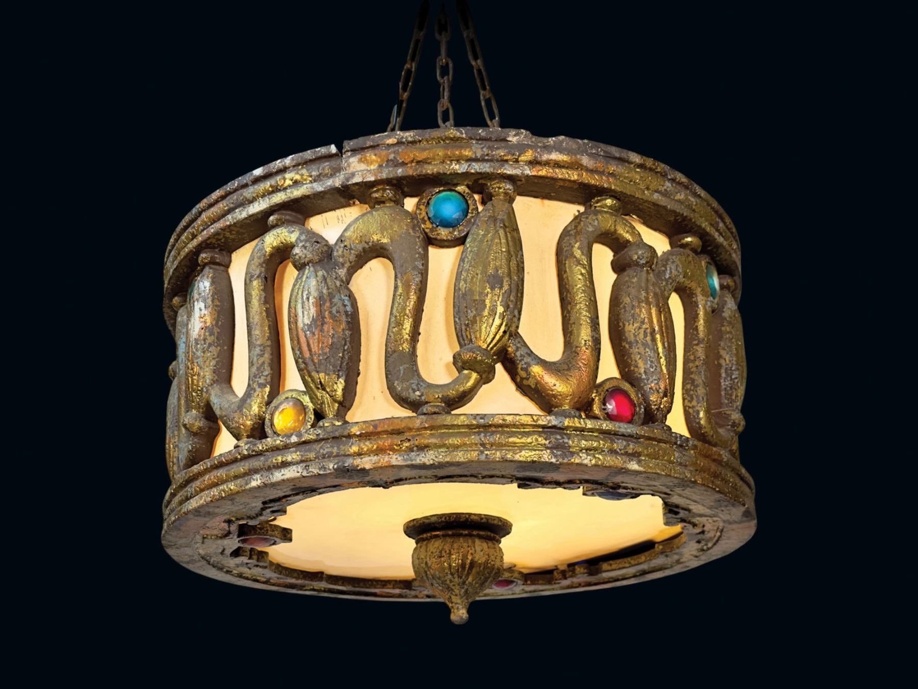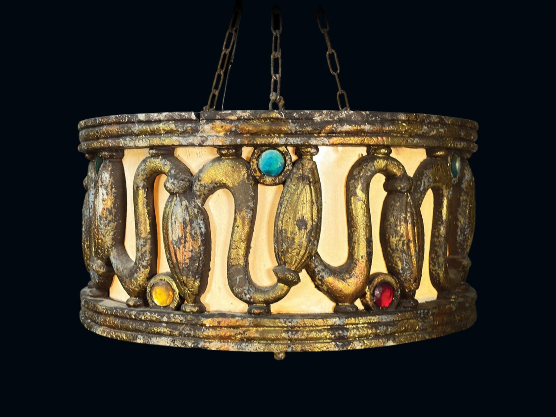 (1970) One of the crown jewels of MAI-KAI collecting is this original chandelier lamp from the fabeled, yet ill-fated BANGKOK ROOM dining area. When Jack Thornton was forced to retire due to a health issue, Bob Thornton wasted no time taking the MAI-KAI into the future with major expansion plans. During his pan-Asian honeymoon with new bride, Mirelle, Bob embarked on an extensive buying trip in Thailand for a new addition to the restaurant. He would commission George Nakashima and Florian Gabriel to design a temple worthy of the gods: The BANGKOK ROOM was to rival the ancient palaces and temples of Thailand itself. This project was handled with the care Imagineers place in Disney theme park attractions. Bejeweled columns, carved Hindu gods and elaborate lighting would all be slathered in gold to truly draw awe from those who entered the ambitiously themed space. Unfortunately, the Bangkok Room, for all its pomp and grandeur, could not compete with the action-packed floor show on the main stage...a show which was completely cut off from view whilst in this room. Because of this, the Bangkok Room dining hall only lasted about seven years. Jack threw in the towel and the Bangkok Room was finally closed to dining in 1978. But what the world lost with a dining room, it gained in spades with the new, improved MAI-KAI GIFT SHOP! What is on offer here is one of the elaborate temple chandeliers which were removed when the BORA-BORA gift shop moved over and precious retail space needed to be made. This fantastic lamp is heavy and large, made oddly enough of plaster and metal with hanger chains. The surface is antiqued with aged gilding and embedded plastic jewels. We have not tested it for electrical and recommend new fixtures be added. It is nothing short of spectacular and will surely be the ultimate treasure for any collector of Polynesian Pop fantasy! VG+ with some cracks and chipping to the surface. Very heavy and requires special shipping considerations. 23.5"x11" chain to finial-34".