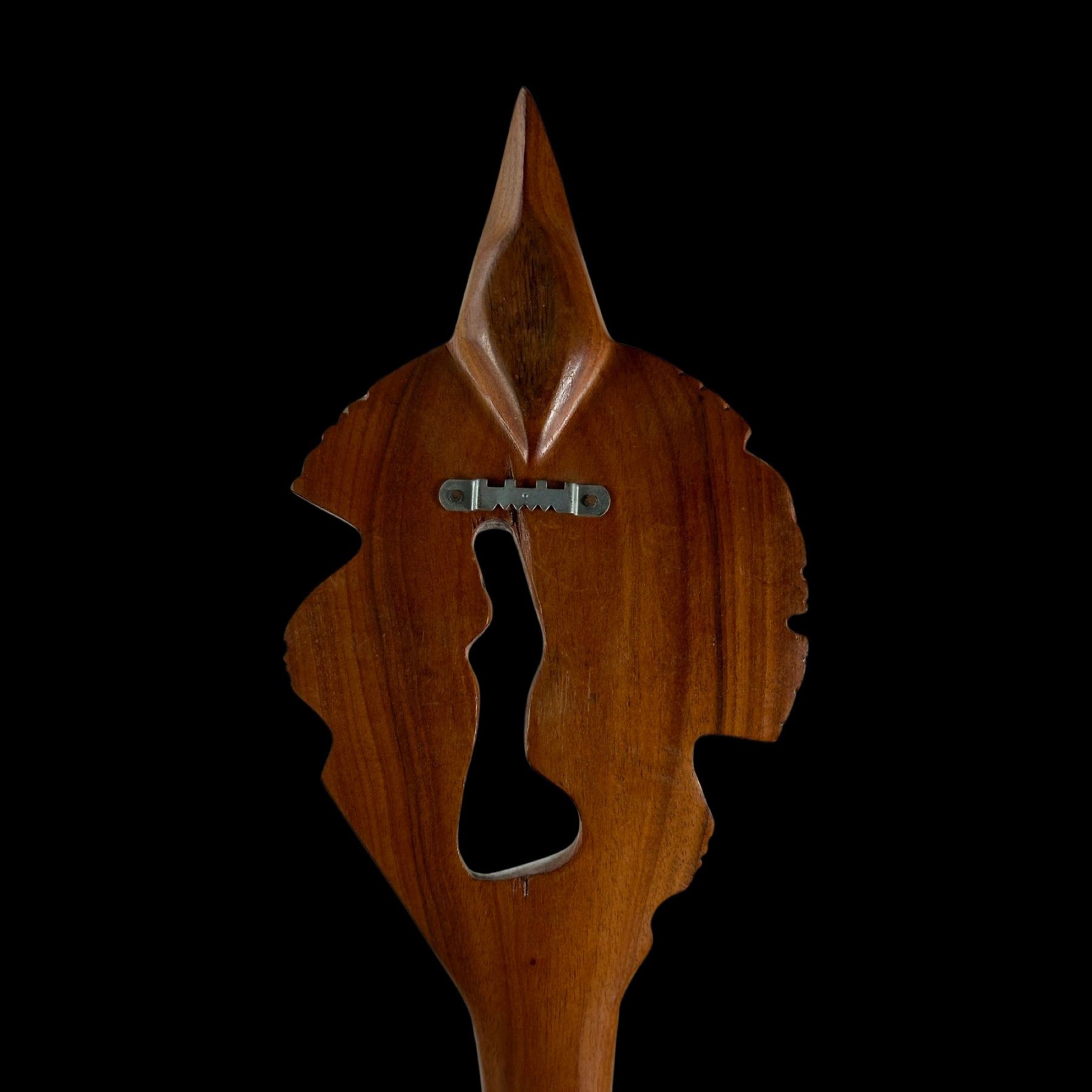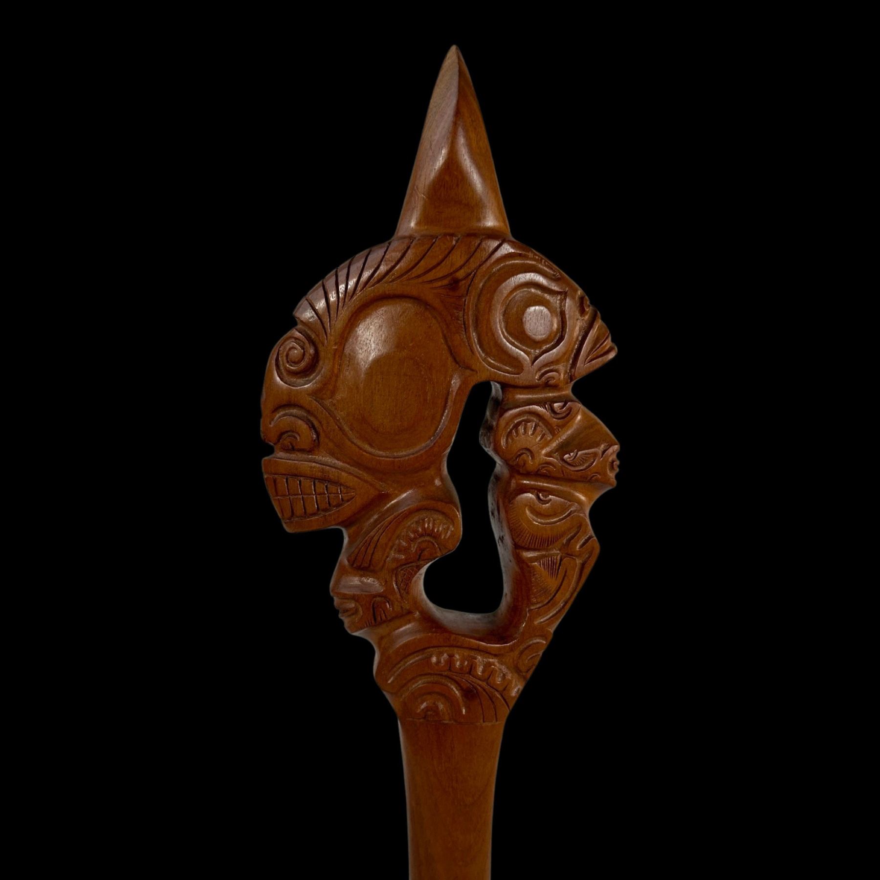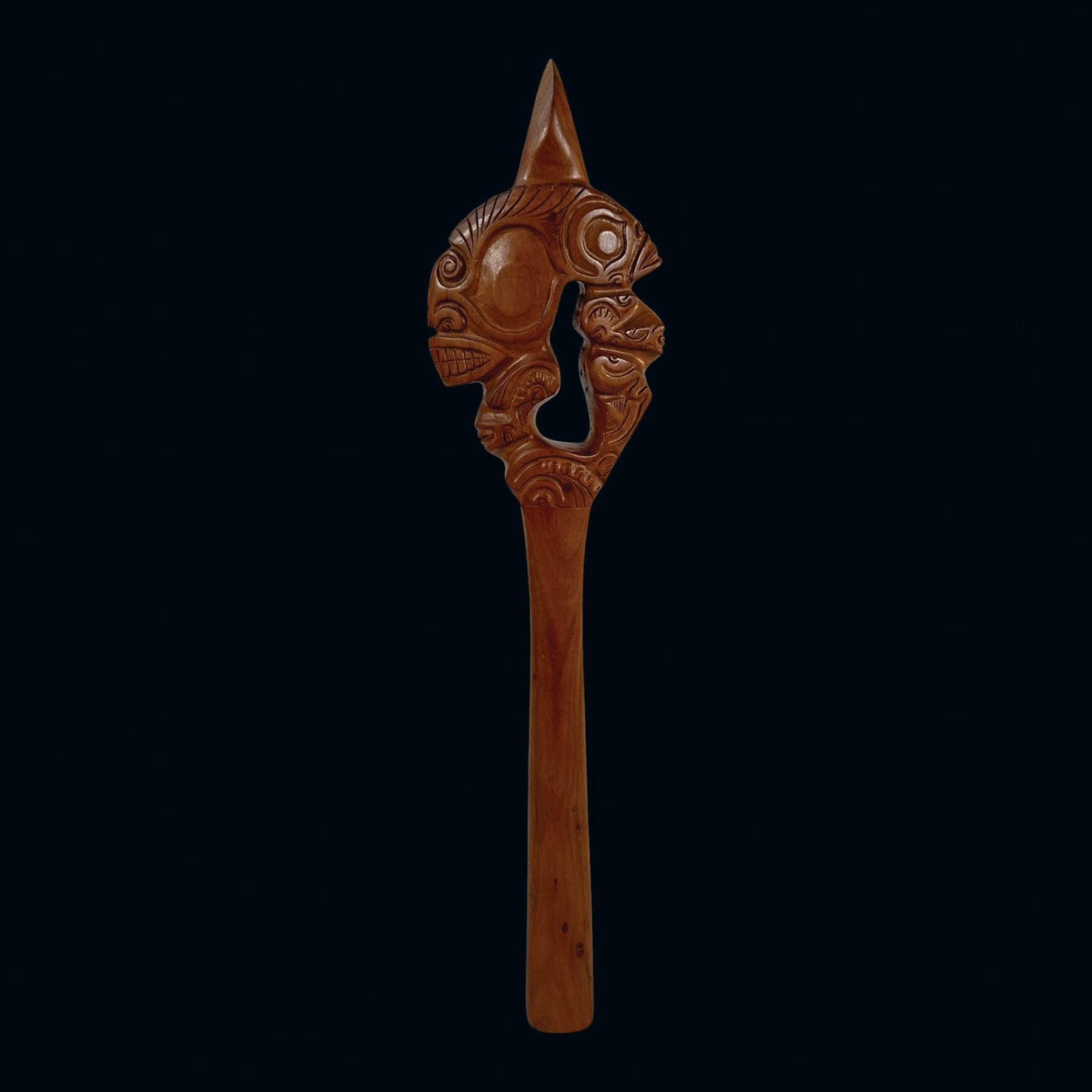 (1970s)* Marquesan hand club from Nuku Hiva, brought back by Sven from his trip to the Marquesas Islands on the freighter Aranui. Nice detailed carving in polished hardwood. VG+. 5"x20.75"x1"