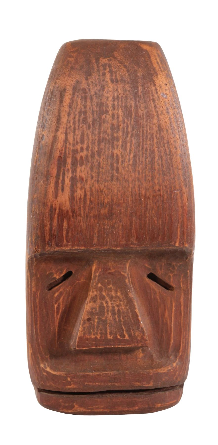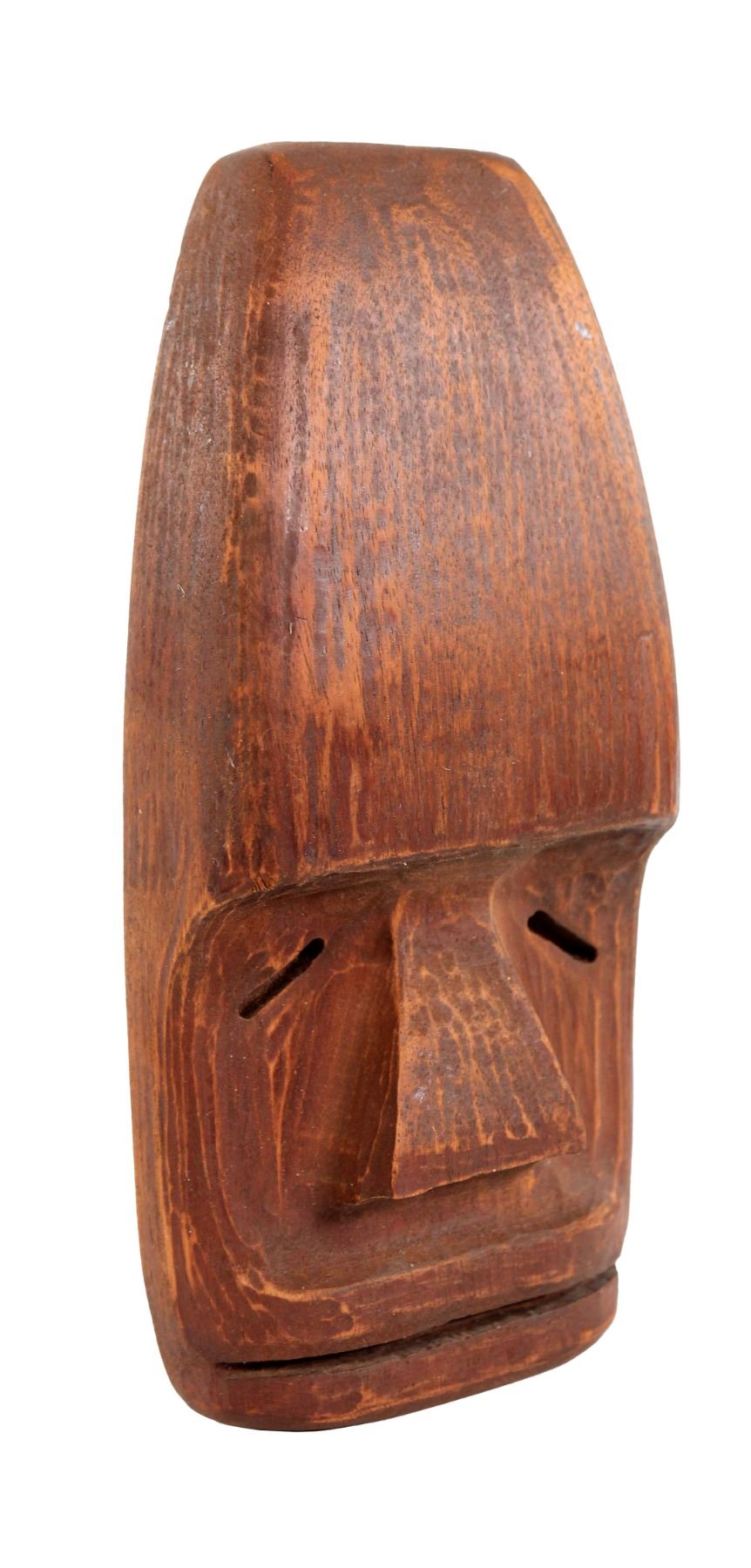 (1960s) An Oceanic Arts catalog item #439. Hand carved, beautiful natural wood grain enhance this stylized Moai Tiki figure. Solid wood. 11.25"x5". VG some wear and old adhesive strips on back which can be removed.