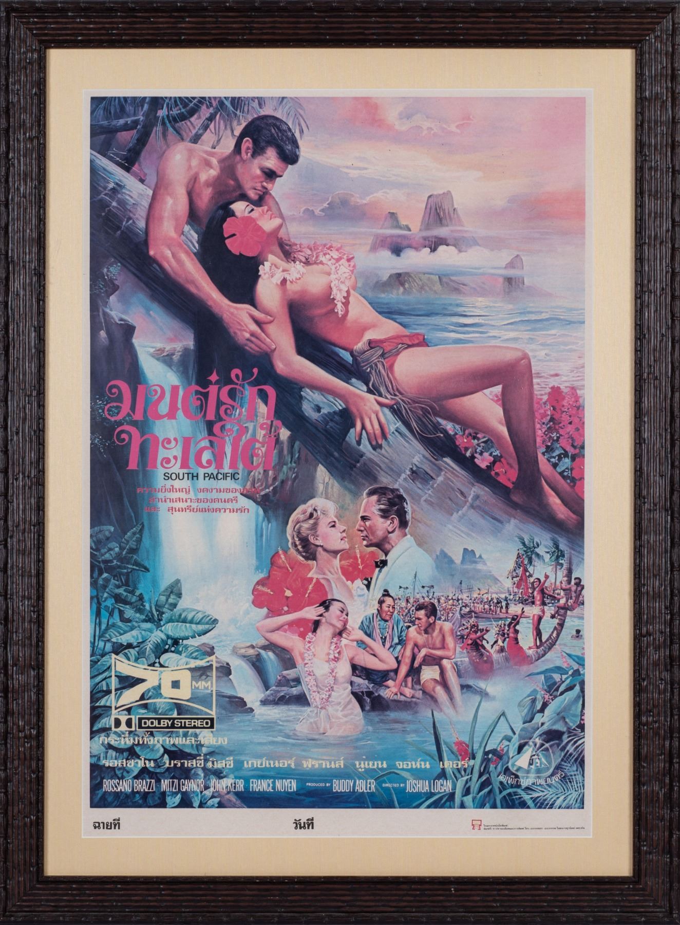 (1958) The hit Broadway and movie musical that inspired generations of the Tiki/Polynesian pop lifestyle. Starring Mitzi Gaynor and Rossano Brazzi, this one sheet Thai poster features beautifully saturated color illustrations of the film with film credits. Tan matting with glass and faux bamboo wood frame. Uninspected outside of frame. Conservation linen mounted. 28"x37.75". VG+.