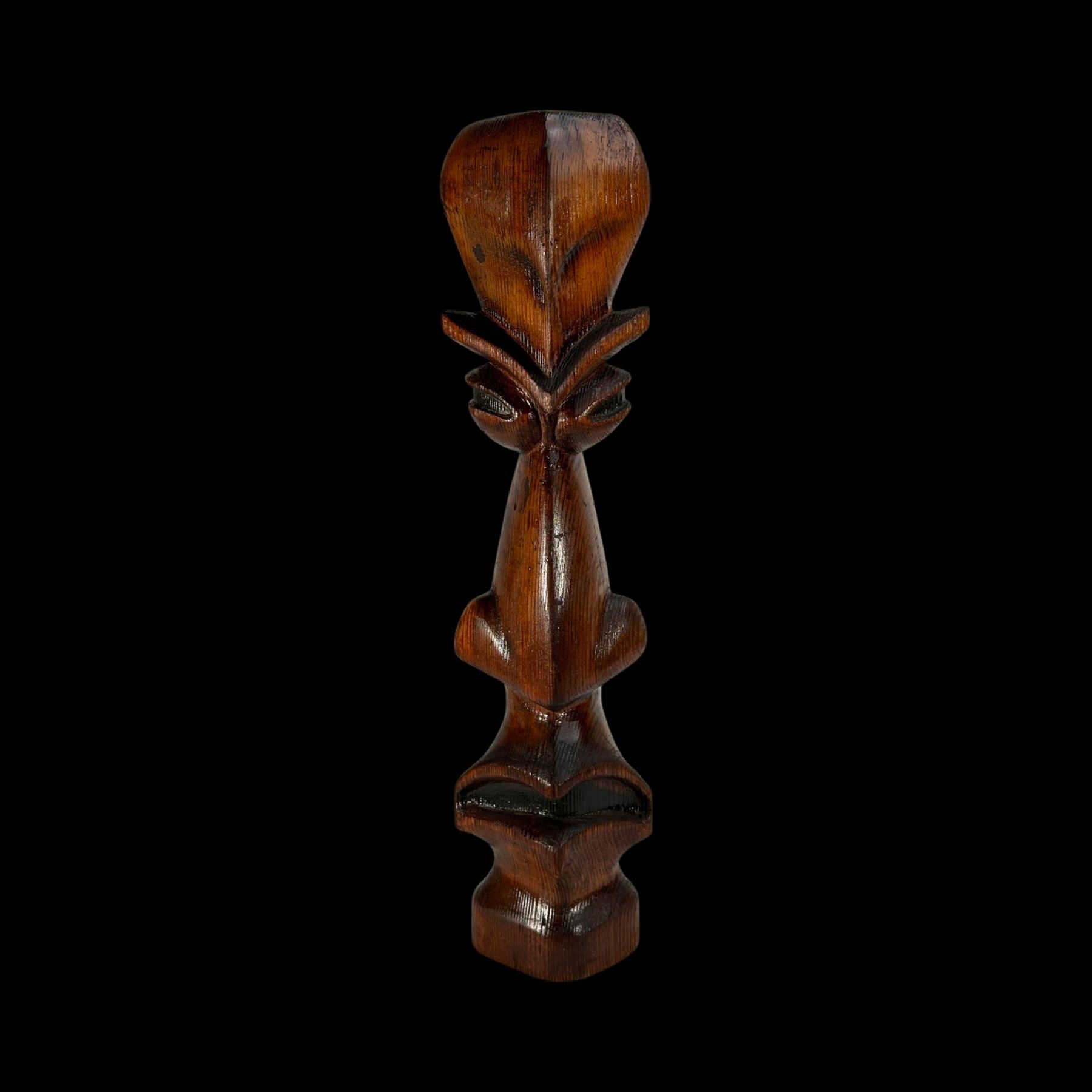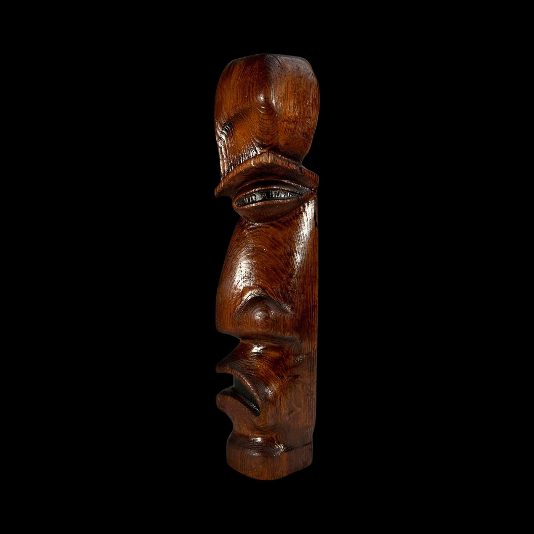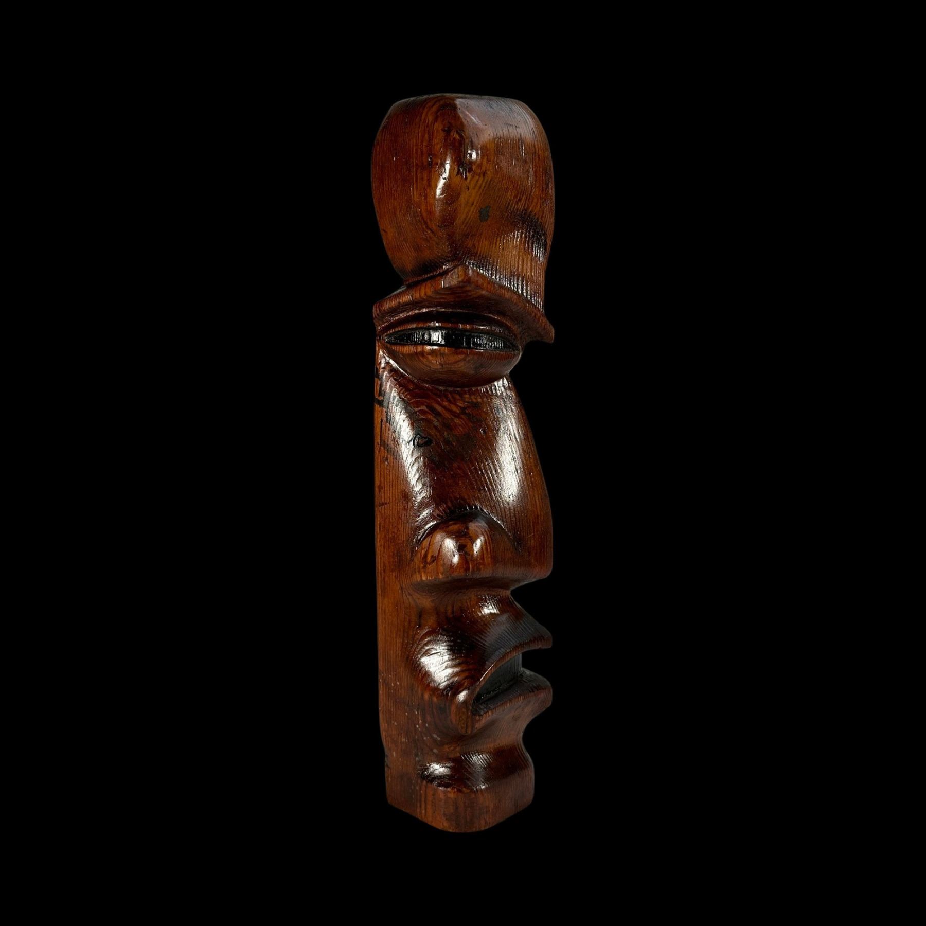 (1950s)* Reduced to the eyes, nose and mouth, this Tiki is reminiscent of Salvador Dali's art. Acquired from Danny Balsz of THE TIKIS Theme Park in Lake Elsinore, CA. This was used as the original vintage pattern for an edition of "True Tiki" carvings later sold by Sven. Published in BOOK OF TIKI, pp.187. VG+. 5"x18"x5".