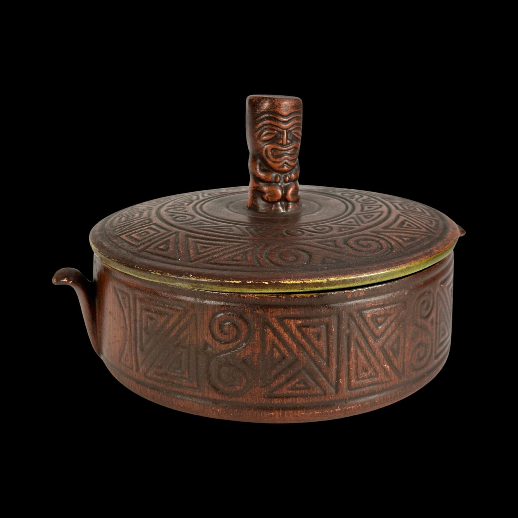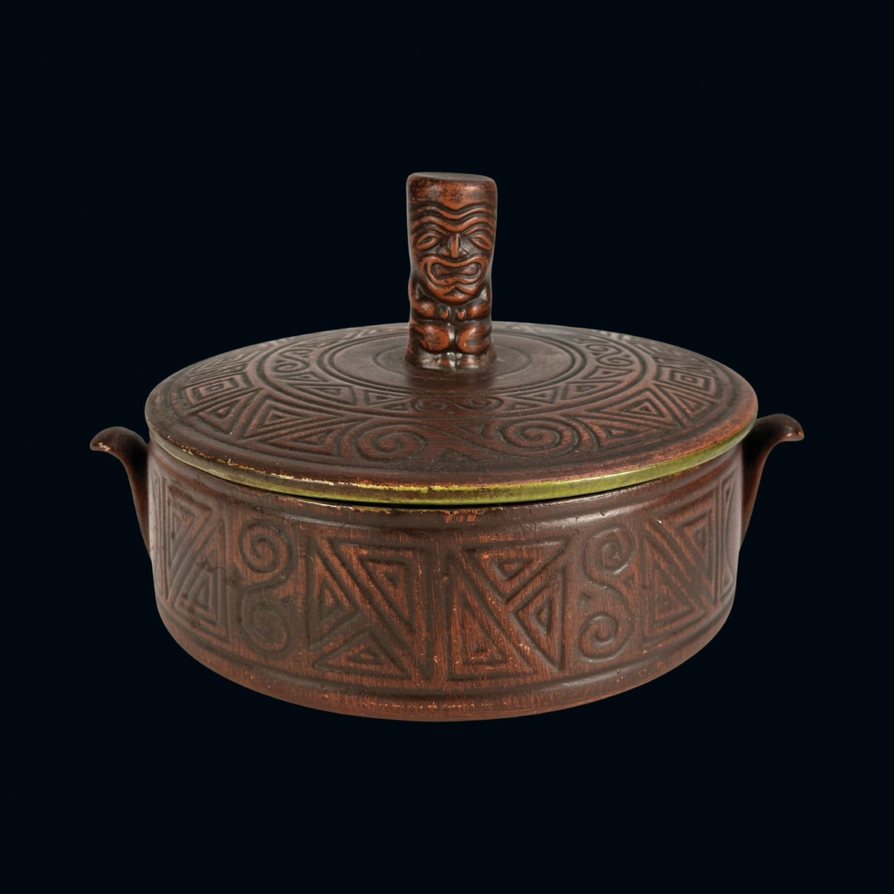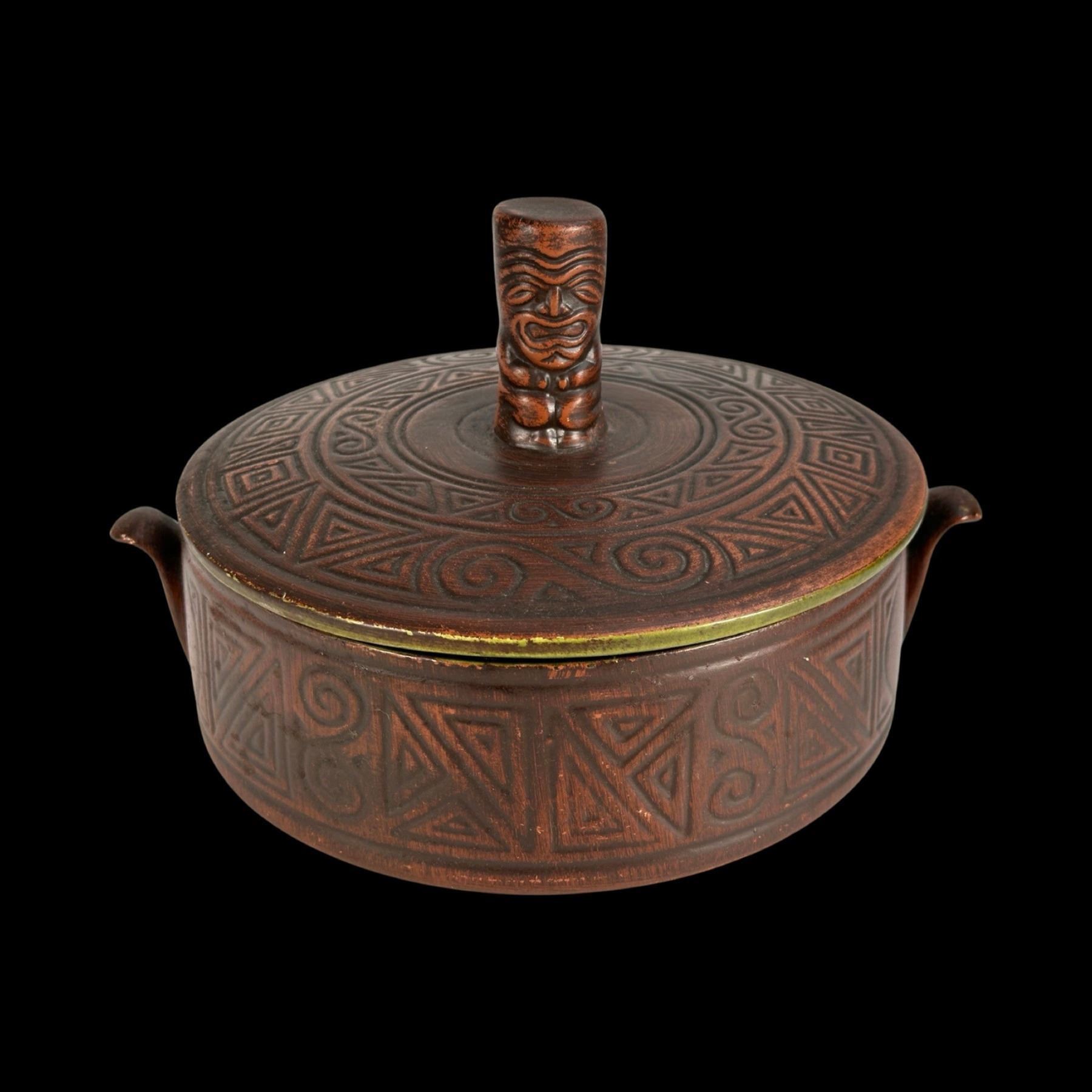 (1950s)* A very impressive ceramic piece of Polynesian Pop! A large format bowl, most probably made for a table centerpiece. Displayed at the Musee Quai Branly in Paris. Published in TIKI POP page 319. VG+. 11"dia x 3.75" bowl, 11"dia x 7.5" w/ lid.