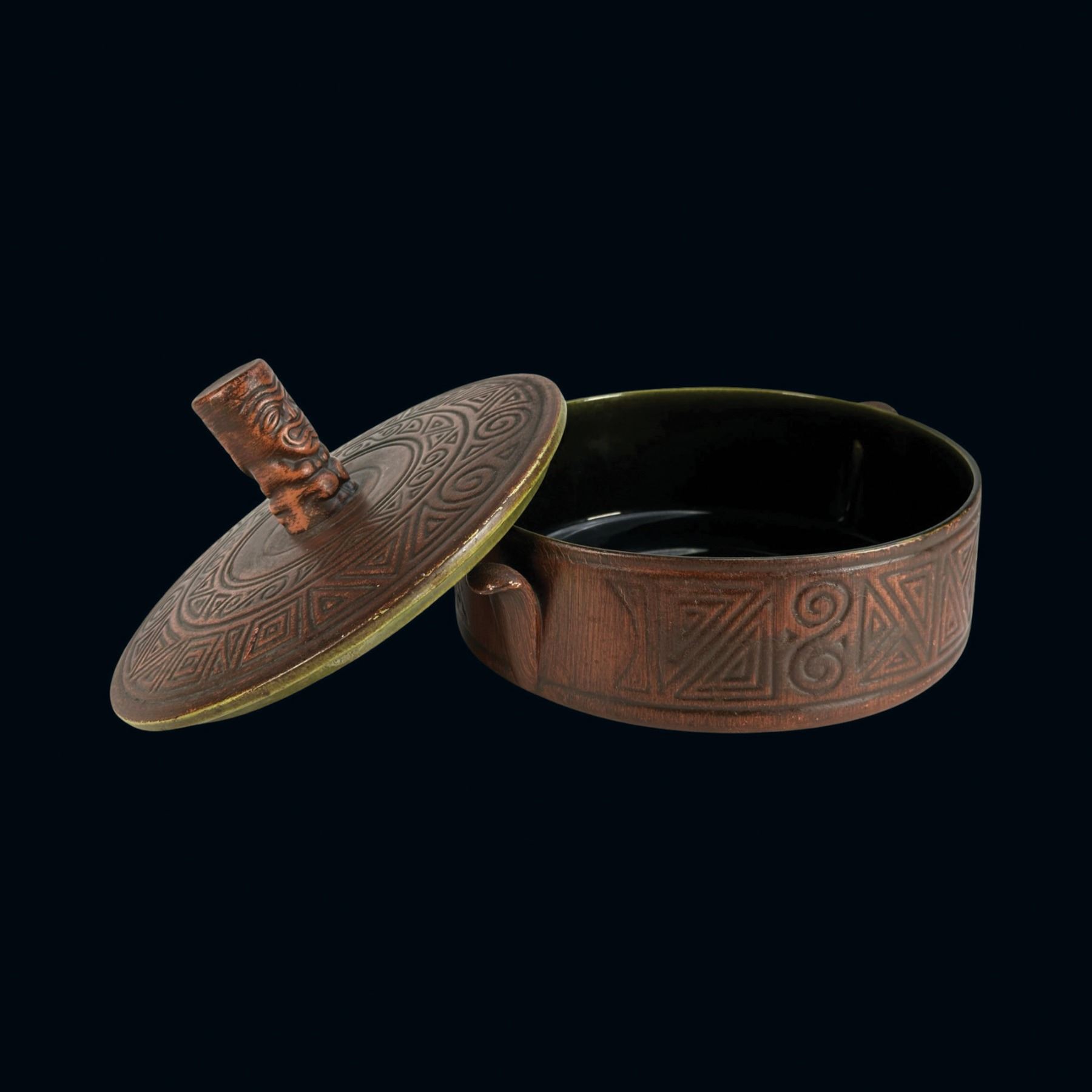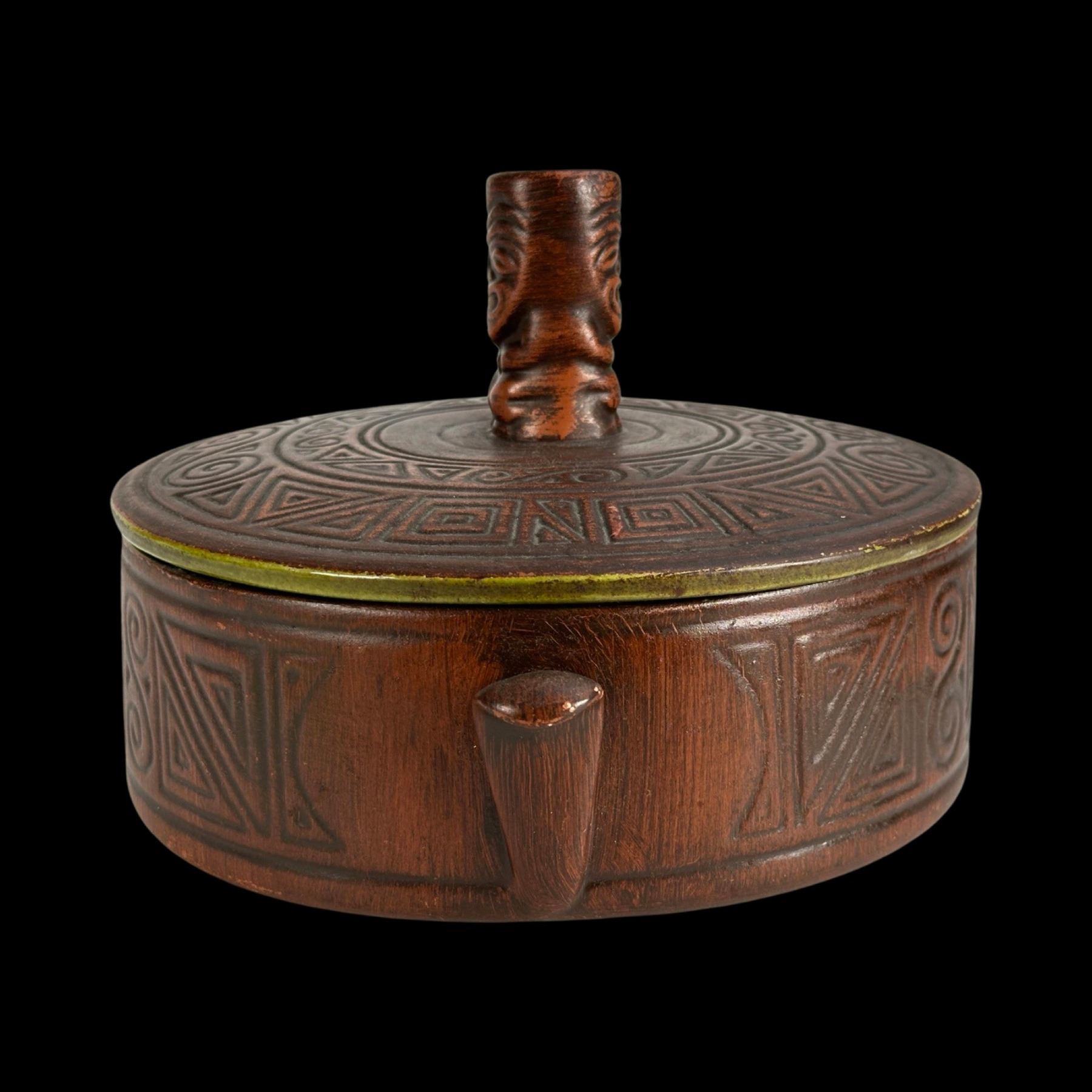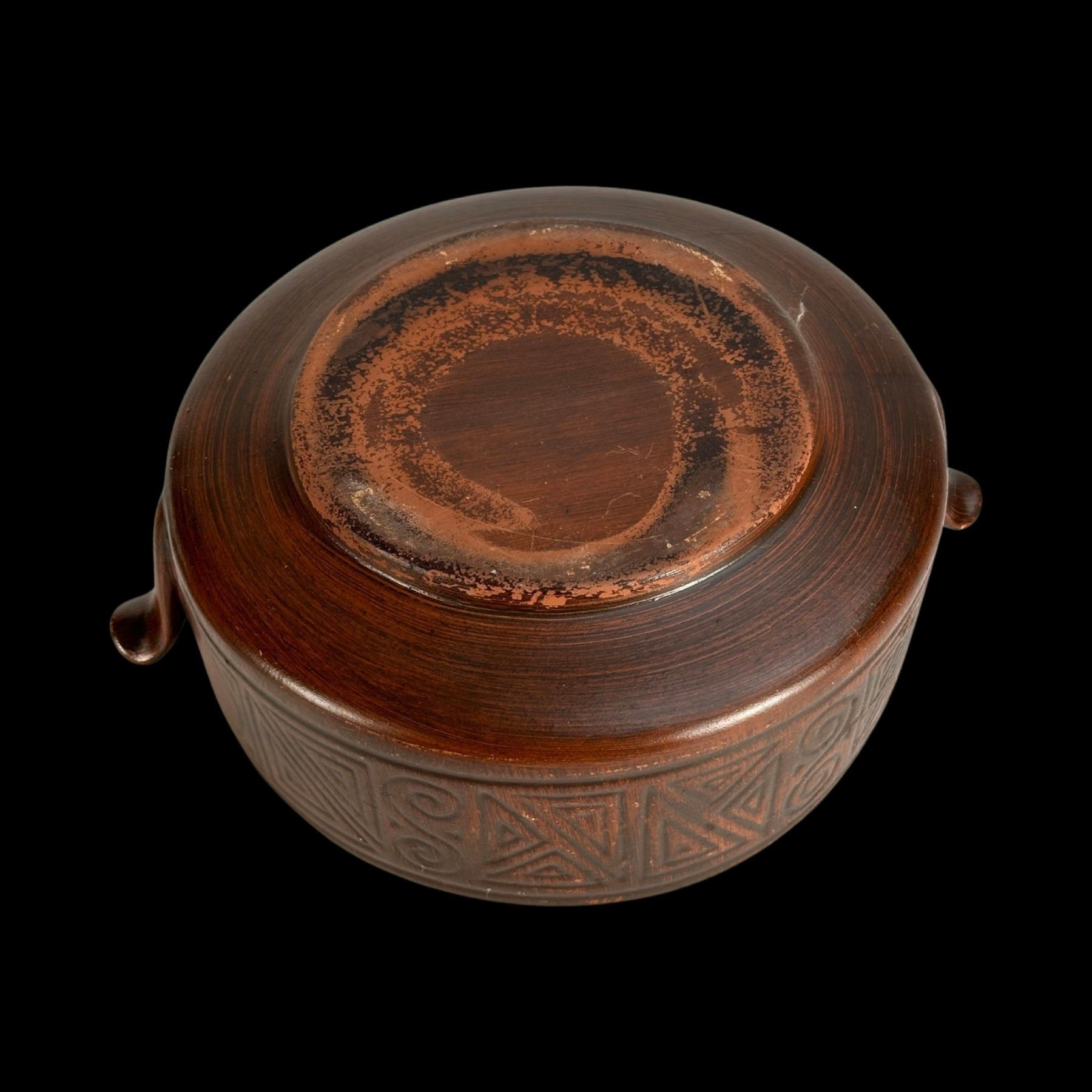 (1950s)* A very impressive ceramic piece of Polynesian Pop! A large format bowl, most probably made for a table centerpiece. Displayed at the Musee Quai Branly in Paris. Published in TIKI POP page 319. VG+. 11"dia x 3.75" bowl, 11"dia x 7.5" w/ lid.