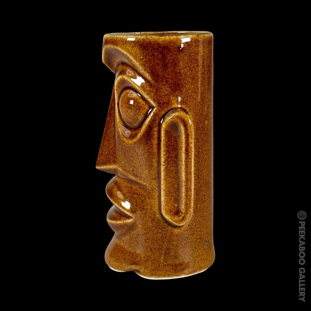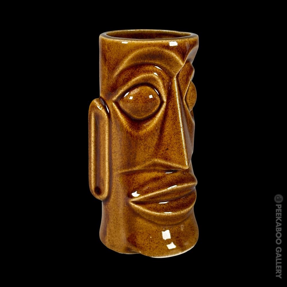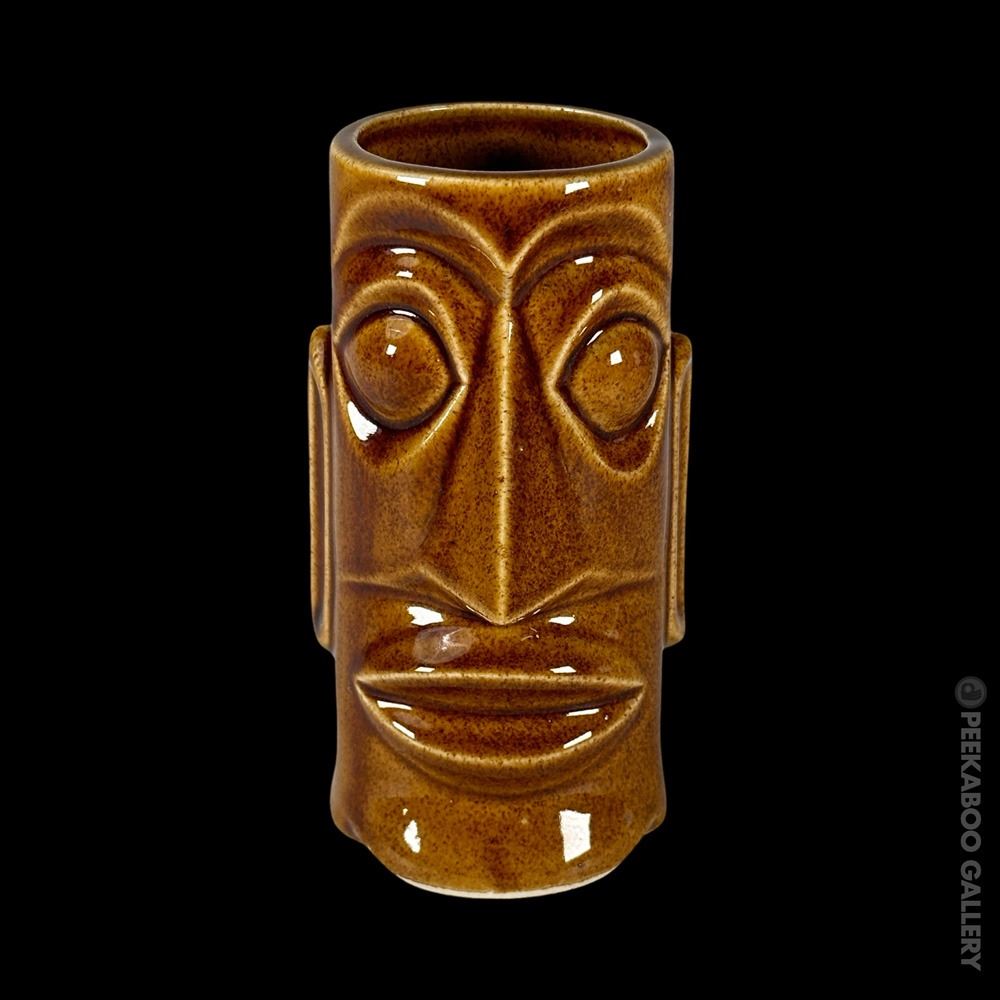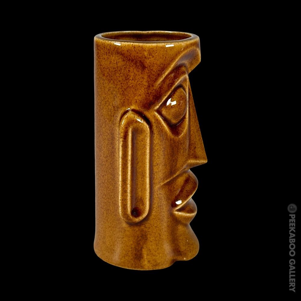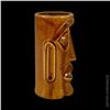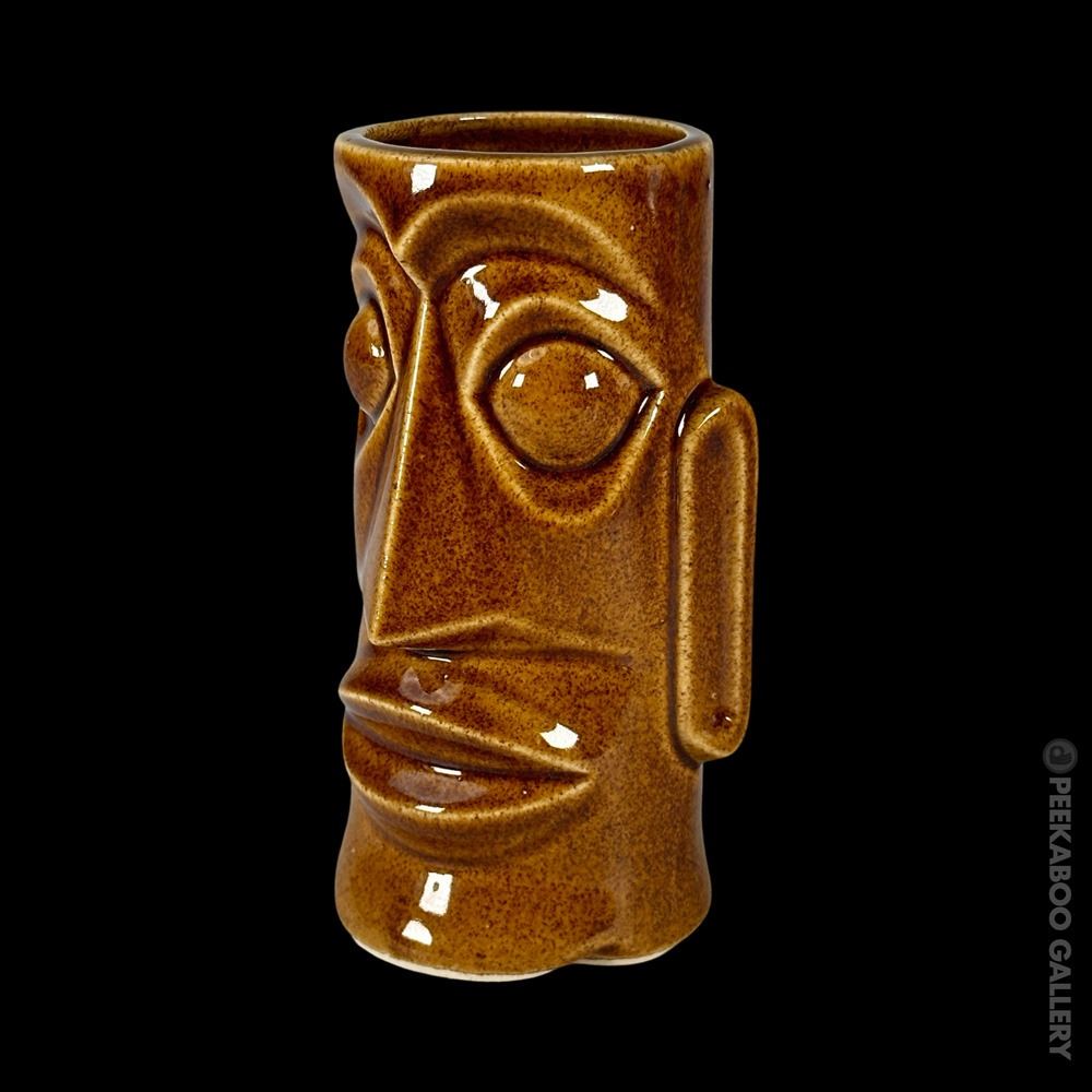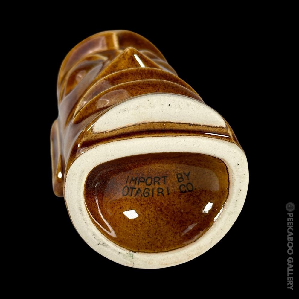 (1960s) A rare "homage" to the Mark Thomas Outrigger Moai, this mug was produced by OMC, most probably in a slightly changed size and style as to not infringe on the exclusive signature mug for Thomas. This in fact, looks closer to the Kon Tiki menu design. Nice mug! VG+. 5.5"x3"dia.