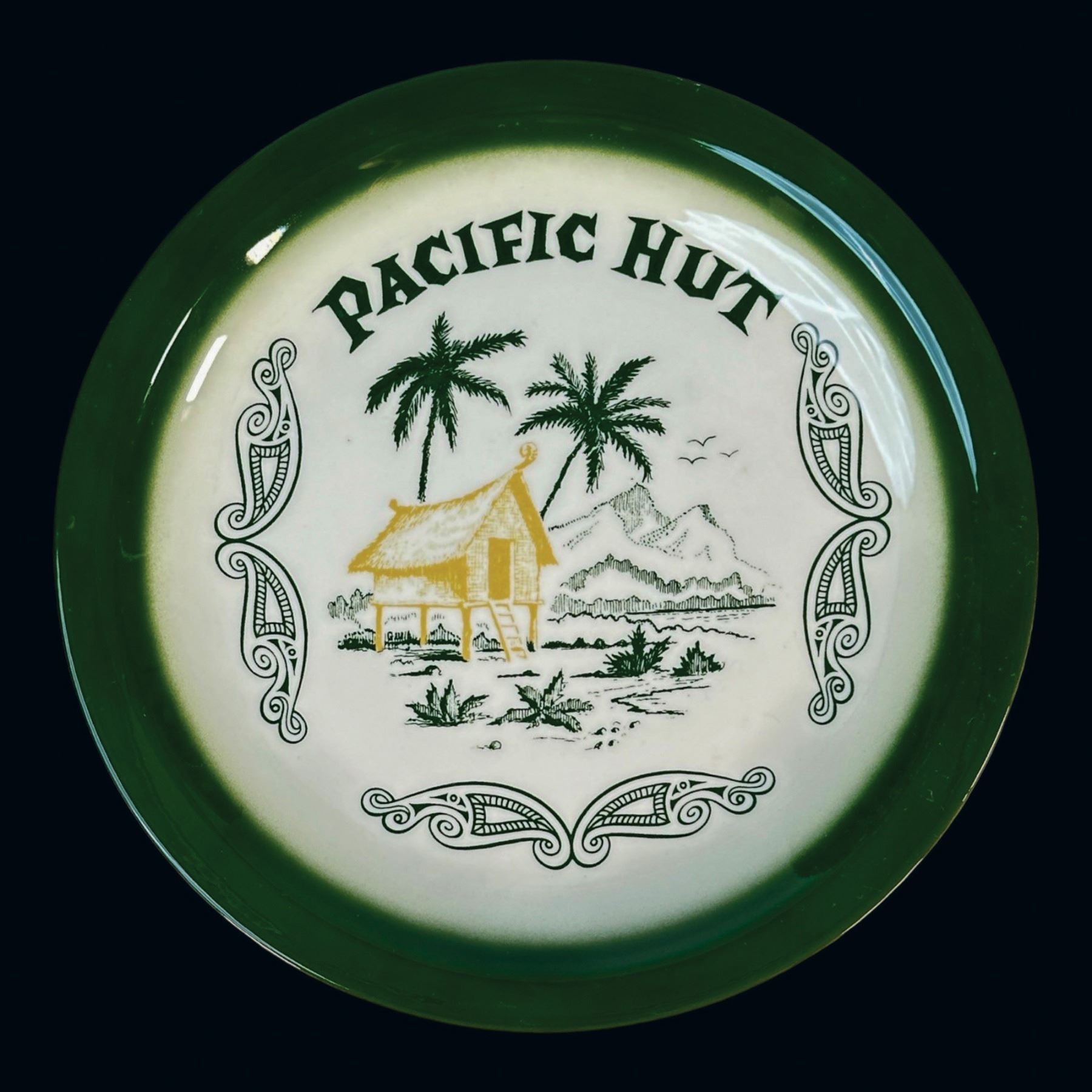 (1960s) Highly graphic restaurant ware serving plate from the Poly-Asian Tiki restaurant and bar in Brockton, Massachusetts. VG+. 8.25"dia.