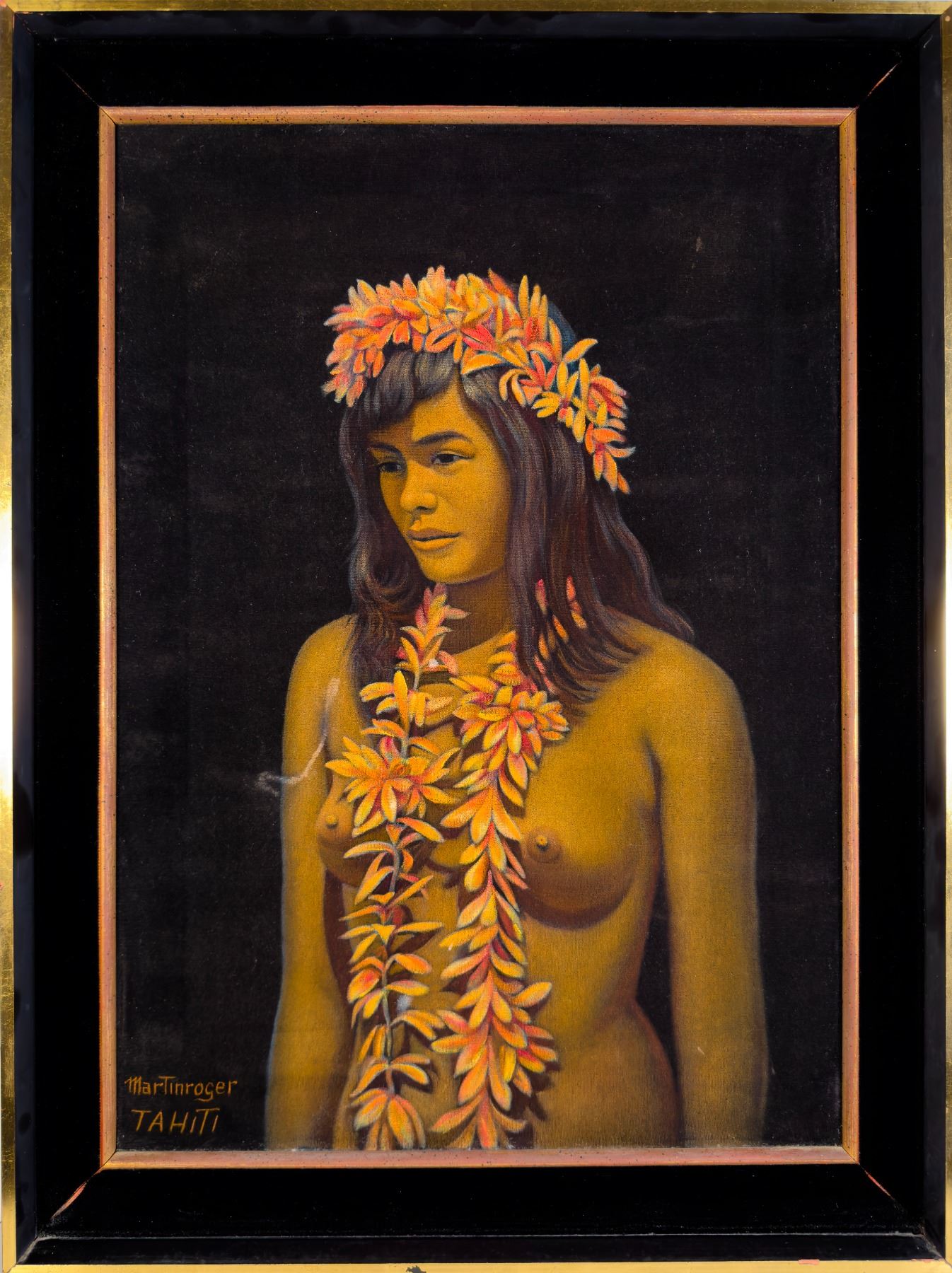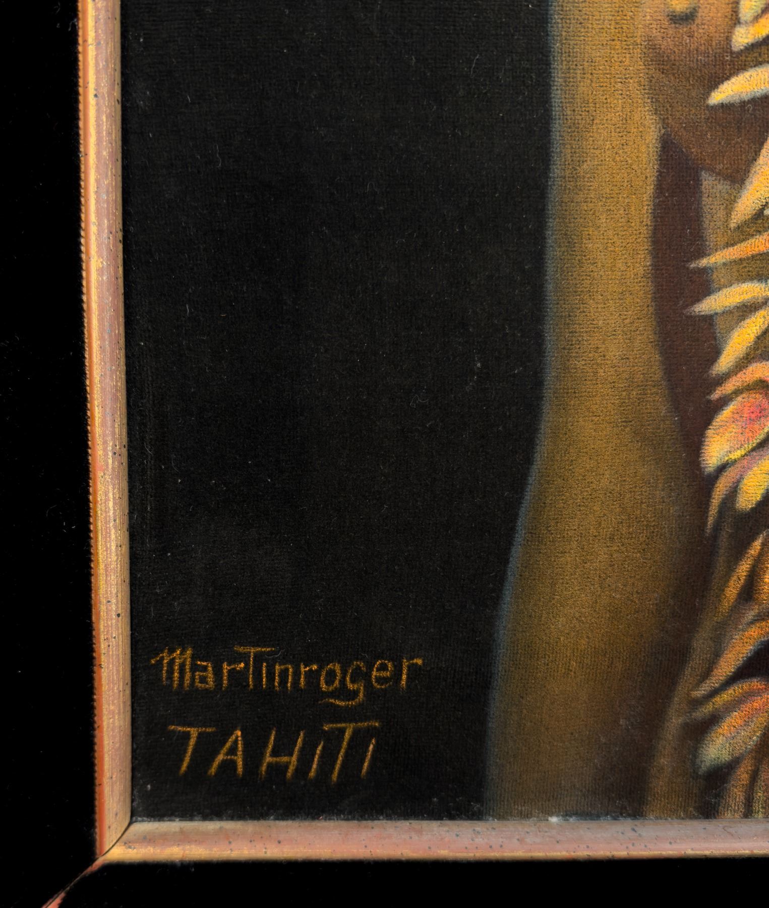 (1950s) Strikingly realistic painting of a shadowed nude Tahitian woman wearing nothing but a lei crown and necklace. Hand painted on black velvet with deep set black frame. Signed "Martin Roger Tahiti". Roger was another disciple of Leeteg who followed in the master's footsteps with the likes of Ralph Burke Tyree. 20.5"x26.5". VG+ with minor wear and rubbing to the velvet on left arm/shoulder.