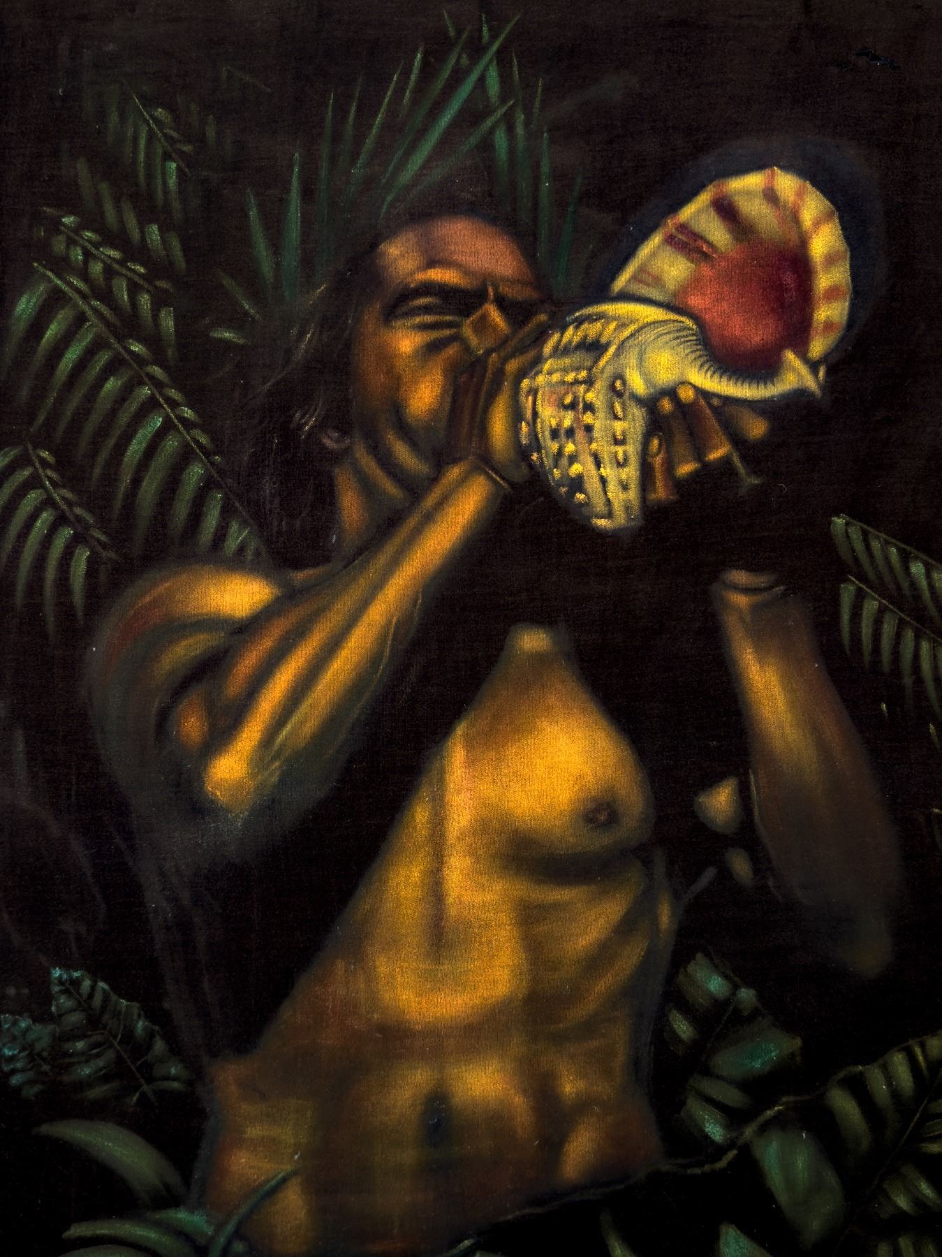 PAINTING OF WARRIOR BLOWING CONCH ON VELVET BY DON MCGUIRE.