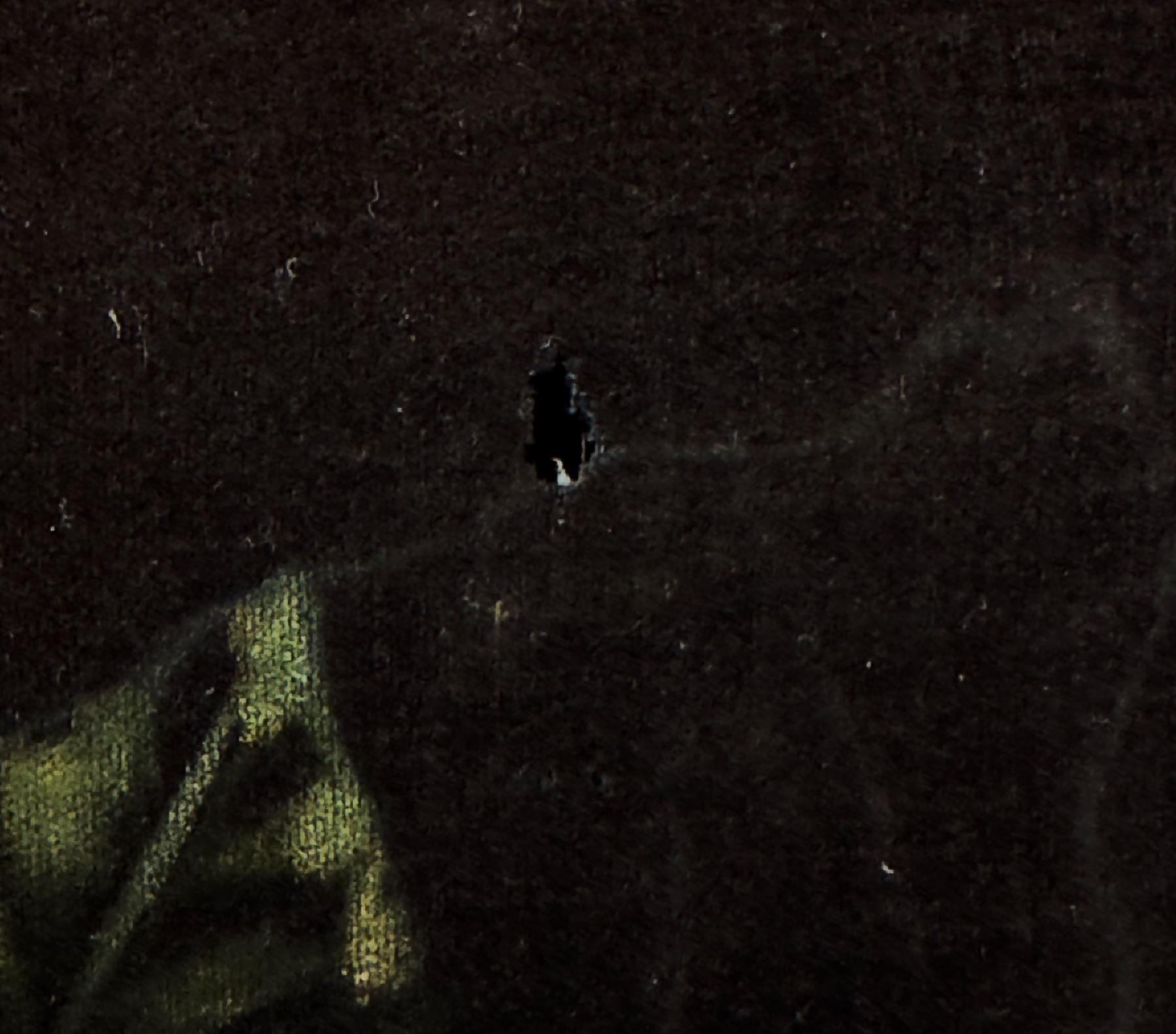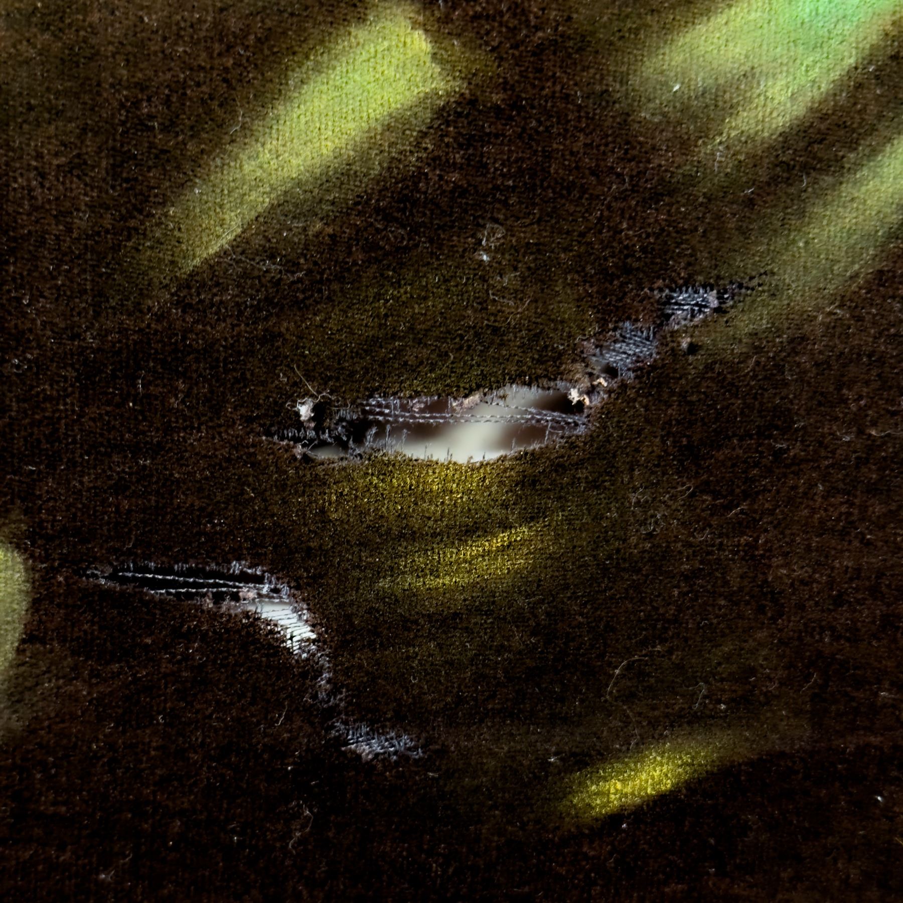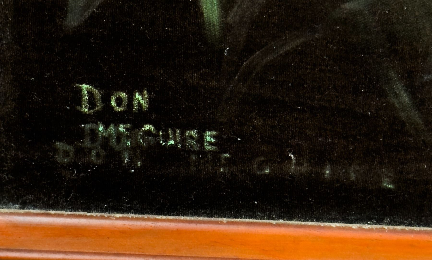 (1950s) Artist Don McGuire created some of the more exotic and realistic depictions of South Seas, Hawaiian, and Polynesian culture. His use of light and shadow helped to define the look and eroticism of the lifestyle. This image depicts a well-defined native male emerging from the jungle foliage blowing on a conch shell on a black velvet background. Bamboo wood frame. Signed by Don McGuire. 34"x42". G Some flecking damage and holes in fabric. * SEE CLOSE UPS OF DAMAGE. These can be repaired by a velvet specialist and is the painting is certainly worthy of restoration due to quality and rarity.