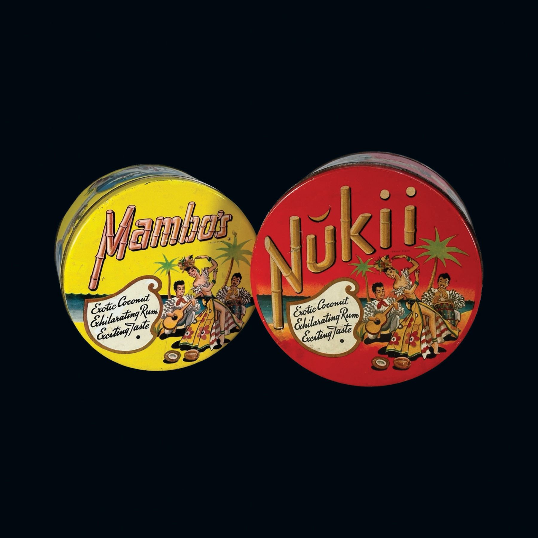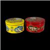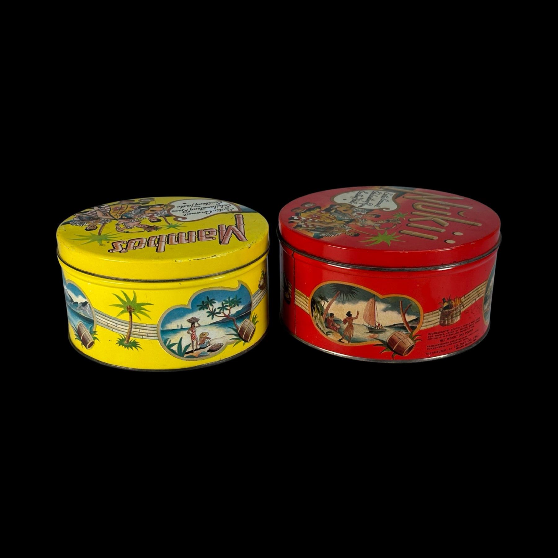 (1950s) Pair of colorful litho cookie tins. Before Royal-Dansk cookies in the 1970s, every grandma used these to store their stash...whatever that may be! Excellent display items. VG+ with minor wear. 6.5"dia x 3.5" & 7"dia x 3.75".