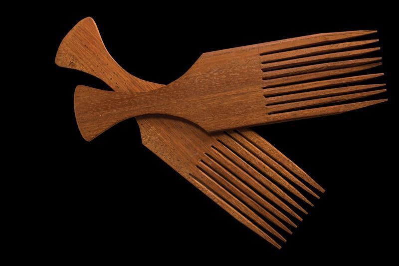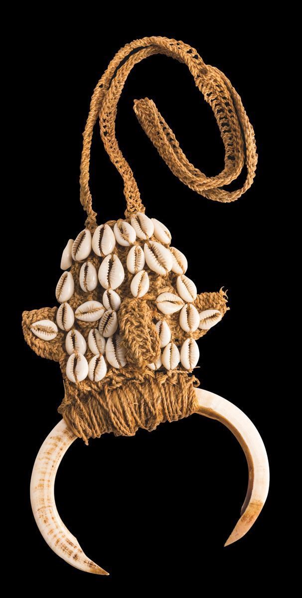 (Mid-Century) A) SHELL AND TUSK TRIBAL PENDANT NECKLACE- New Guinea Boars Tusk pectoral necklace with cowrie shells. B) PAIR OF HAIR COMBS- Hardwood, elegant shape with multi tines in good condition.PENDANT 7" x 4.5"